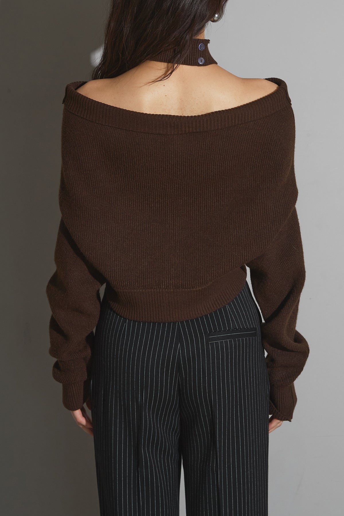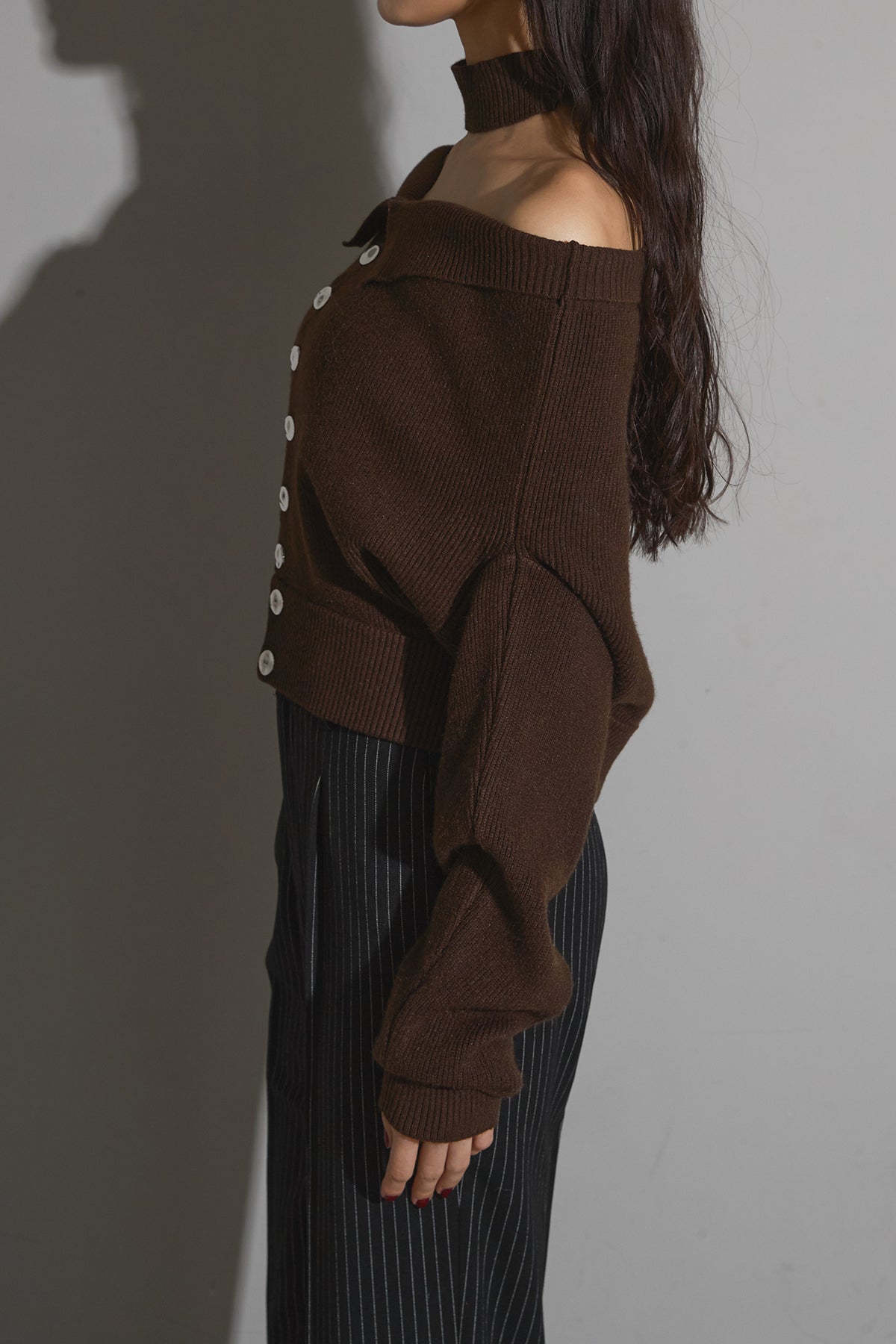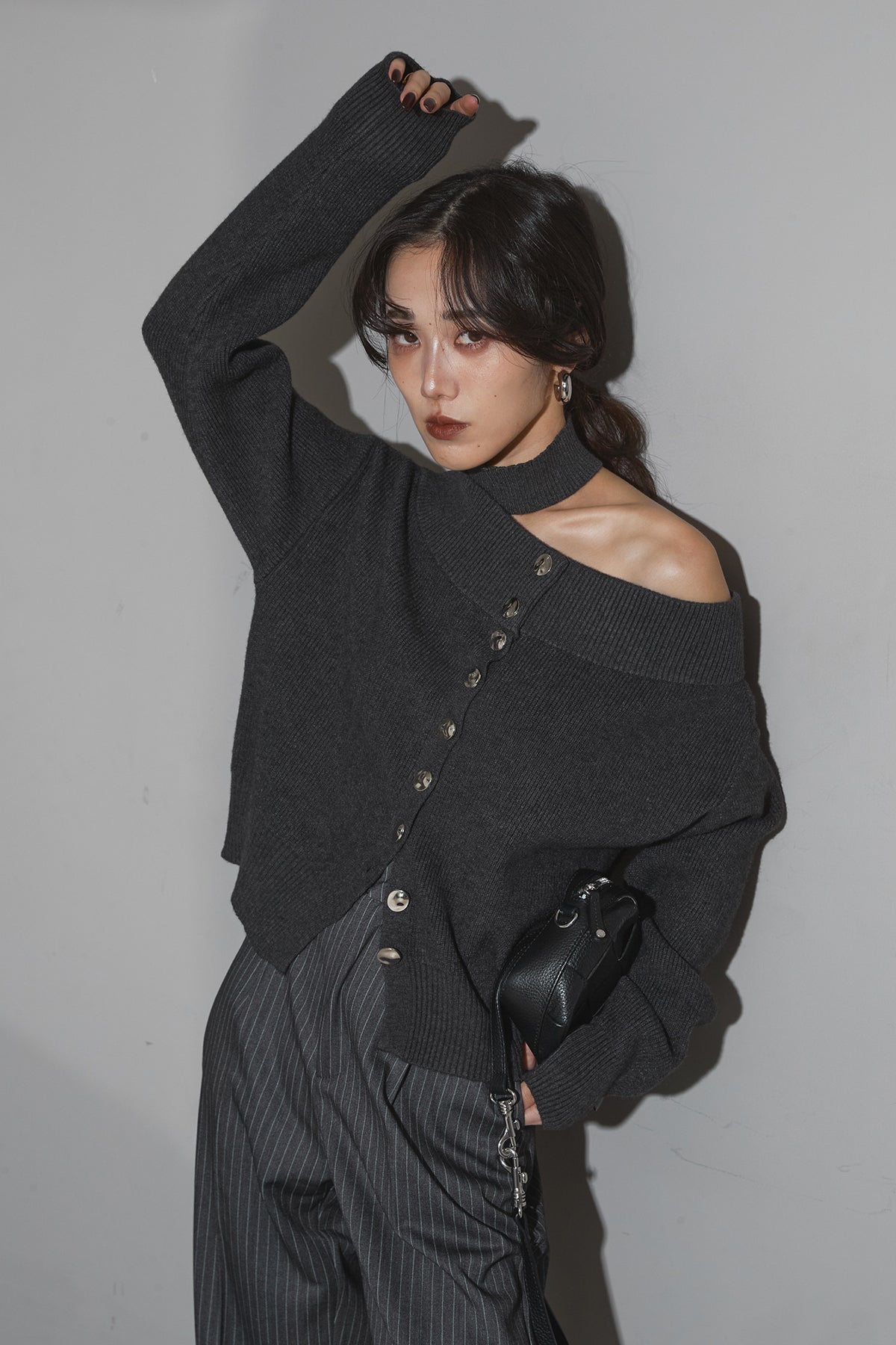 首元のチョーカーデザインがポイントのオフショルダーニット。 大胆なデコルテラインとコンパクトなシルエットが女性らしさを引き立て、 モードな印象をプラスしてくれます。 ボタンを少し開けて抜け感を出したり、肩を片方だけ落として着るなど、 着こなし次第で印象を変えられる一枚。 パンツスタイルにもスカートにも合わせやすく、 スタイリングの主役になるアイテムです。