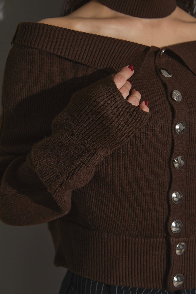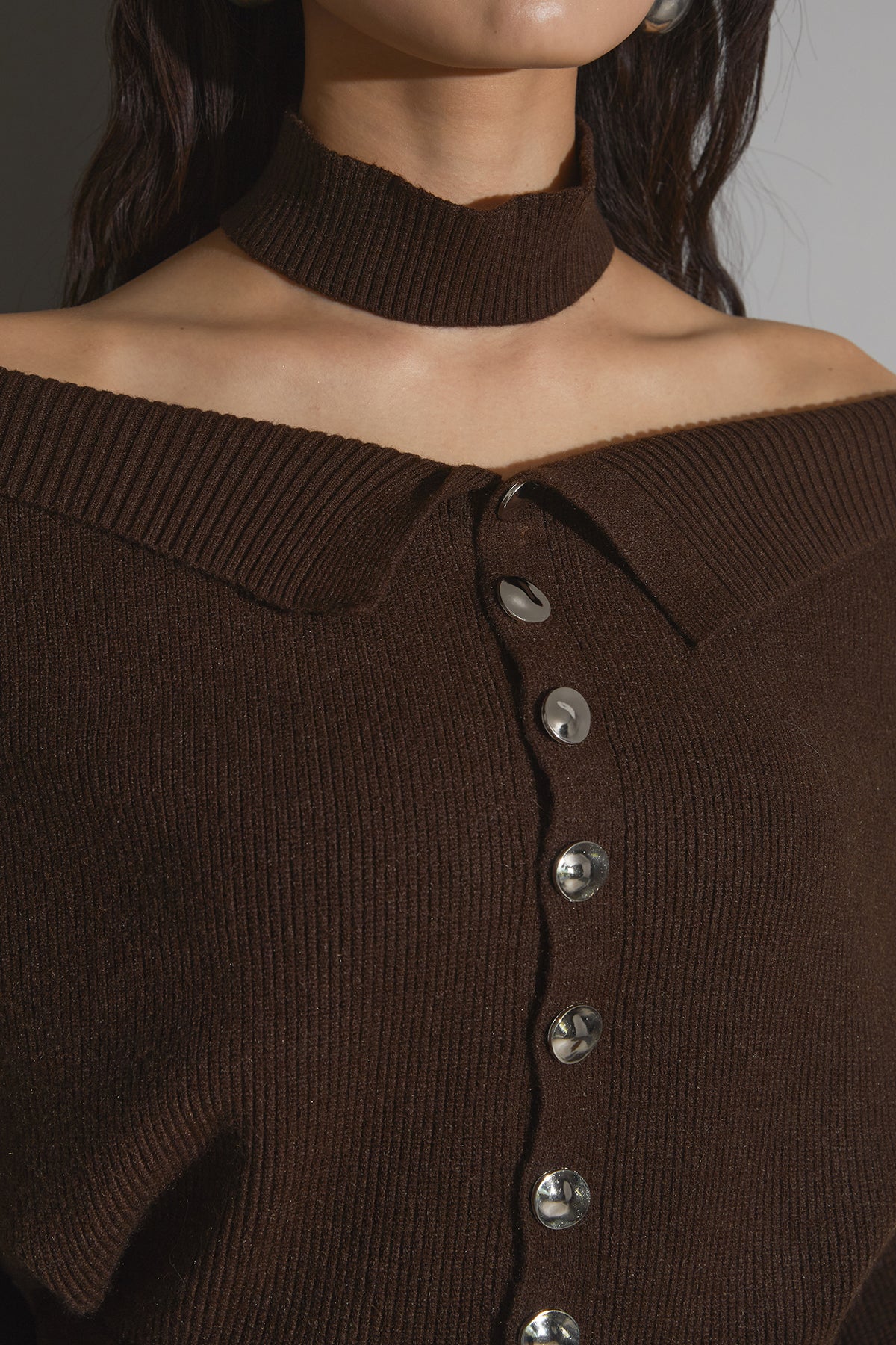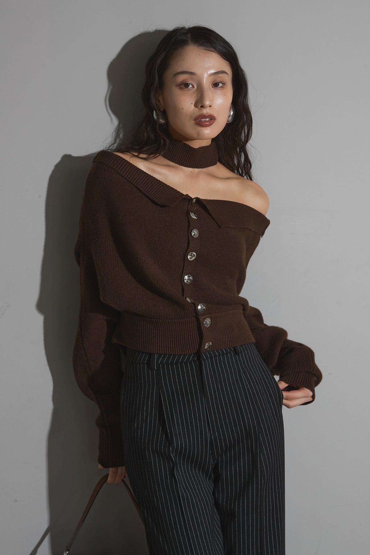 首元のチョーカーデザインがポイントのオフショルダーニット。 大胆なデコルテラインとコンパクトなシルエットが女性らしさを引き立て、 モードな印象をプラスしてくれます。 ボタンを少し開けて抜け感を出したり、肩を片方だけ落として着るなど、 着こなし次第で印象を変えられる一枚。 パンツスタイルにもスカートにも合わせやすく、 スタイリングの主役になるアイテムです。