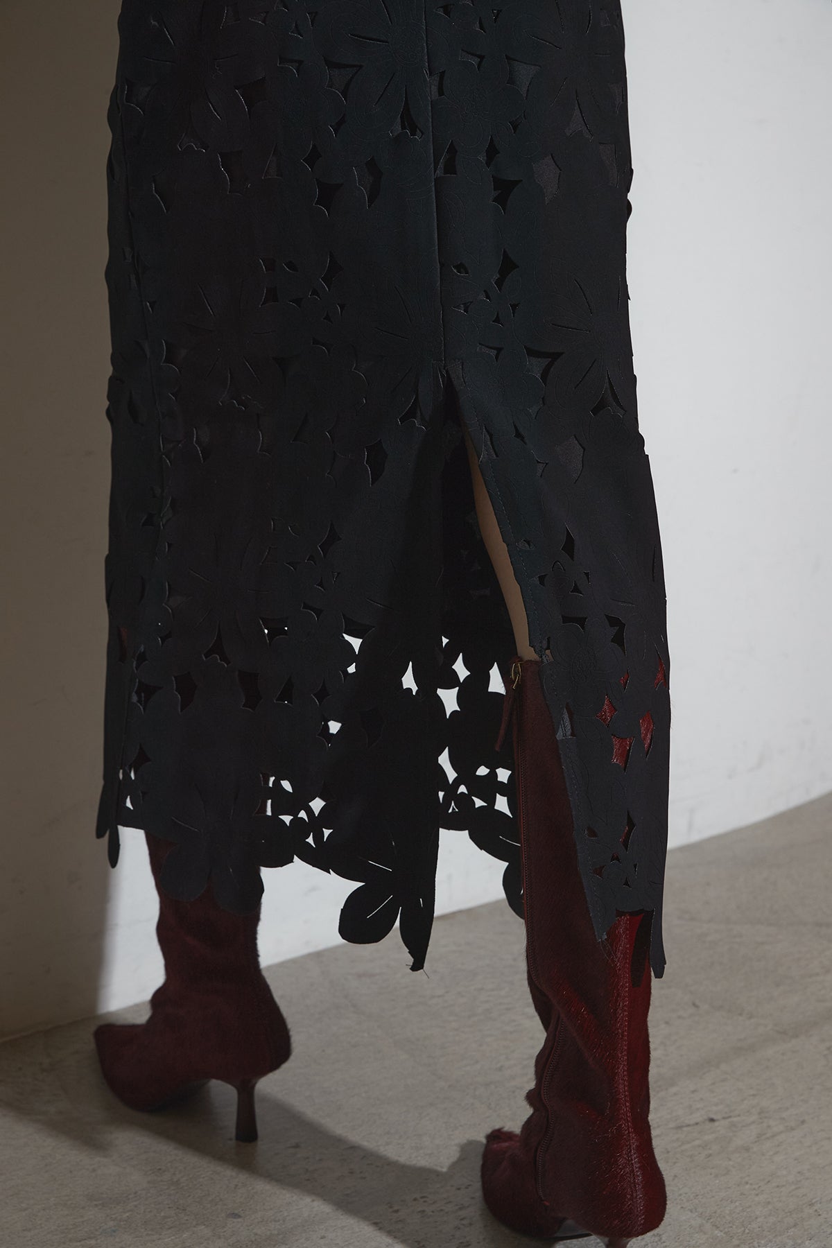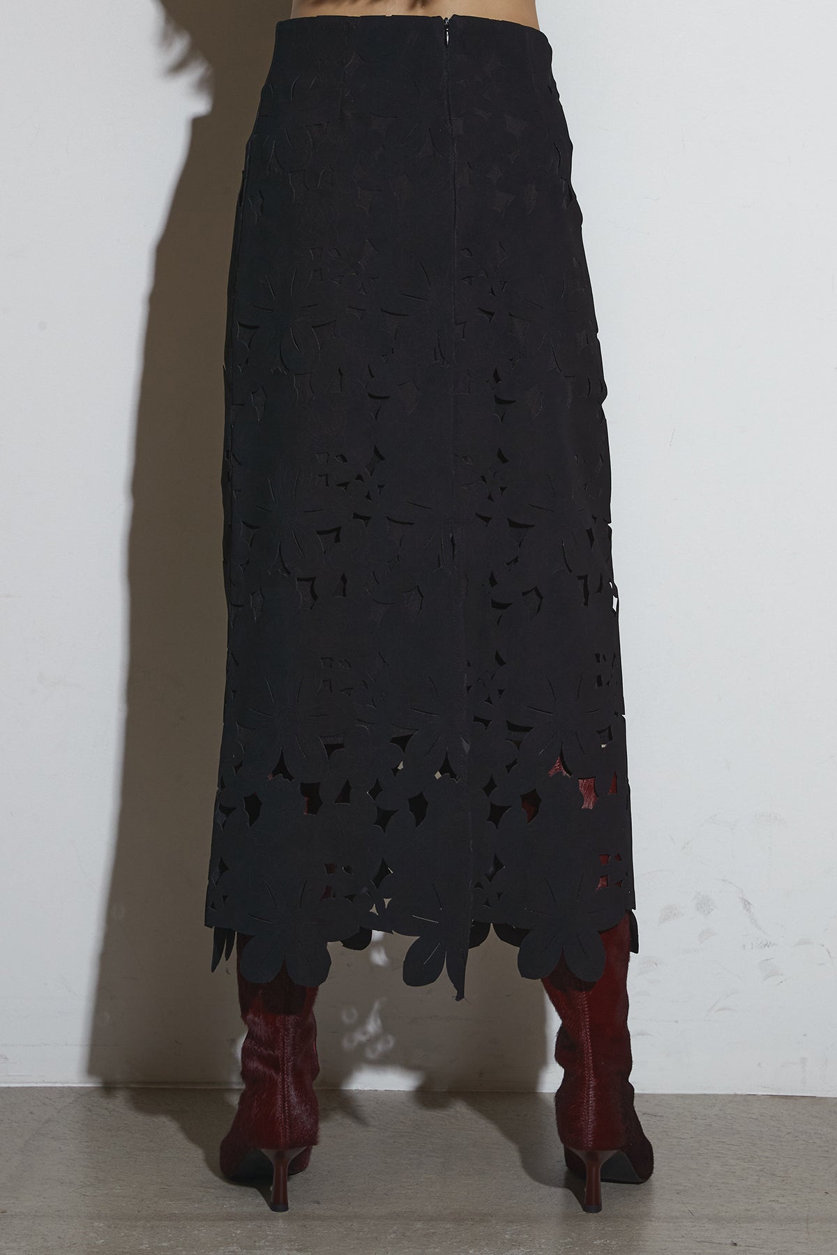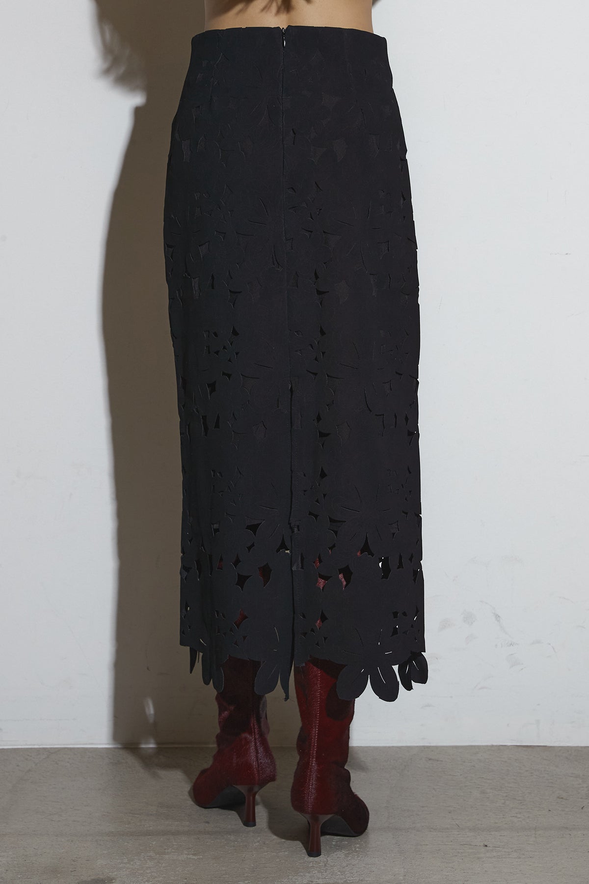ご注文前に必ずページ下部「お届け期間」をご確認くださいませ。繊細なカットワークが全面に施されたスカート。裾に向かって立体的なフラワーモチーフが重なり、動くたびに陰影が生まれるデザインです。すっきりとしたシルエットながら存在感があり、シンプルなトップスと合わせるだけで印象的なスタイルに仕上がります。