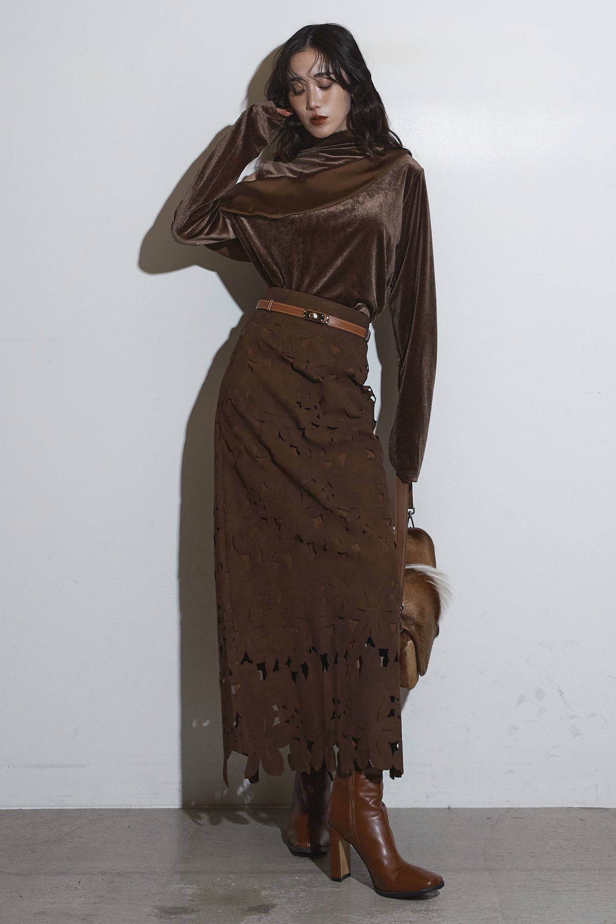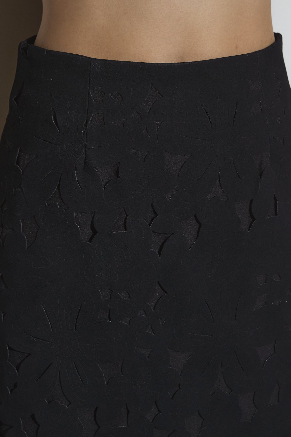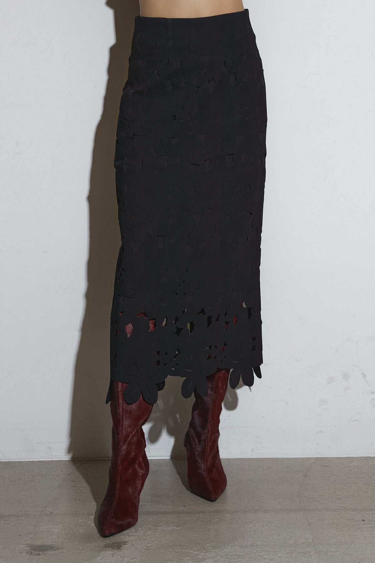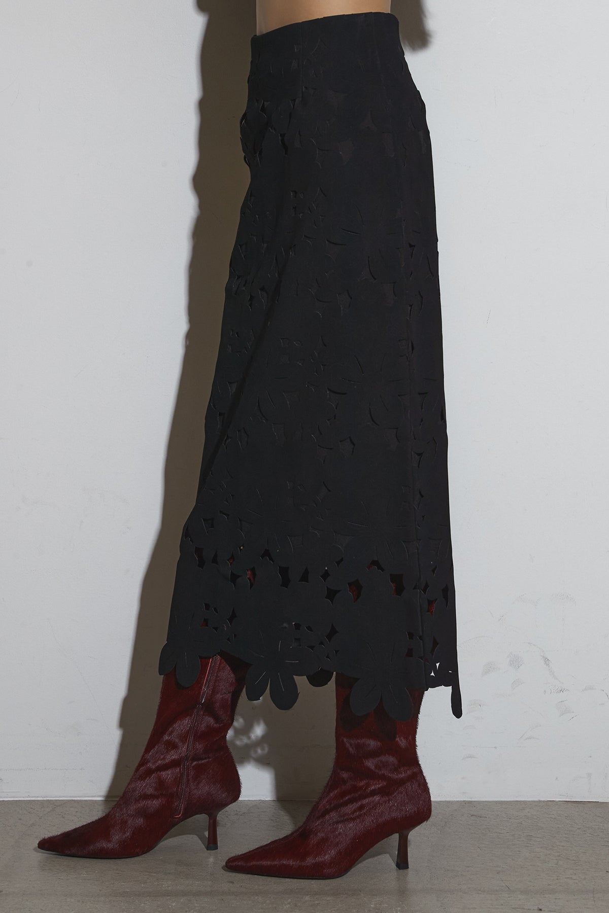 ご注文前に必ずページ下部「お届け期間」をご確認くださいませ。繊細なカットワークが全面に施されたスカート。裾に向かって立体的なフラワーモチーフが重なり、動くたびに陰影が生まれるデザインです。すっきりとしたシルエットながら存在感があり、シンプルなトップスと合わせるだけで印象的なスタイルに仕上がります。