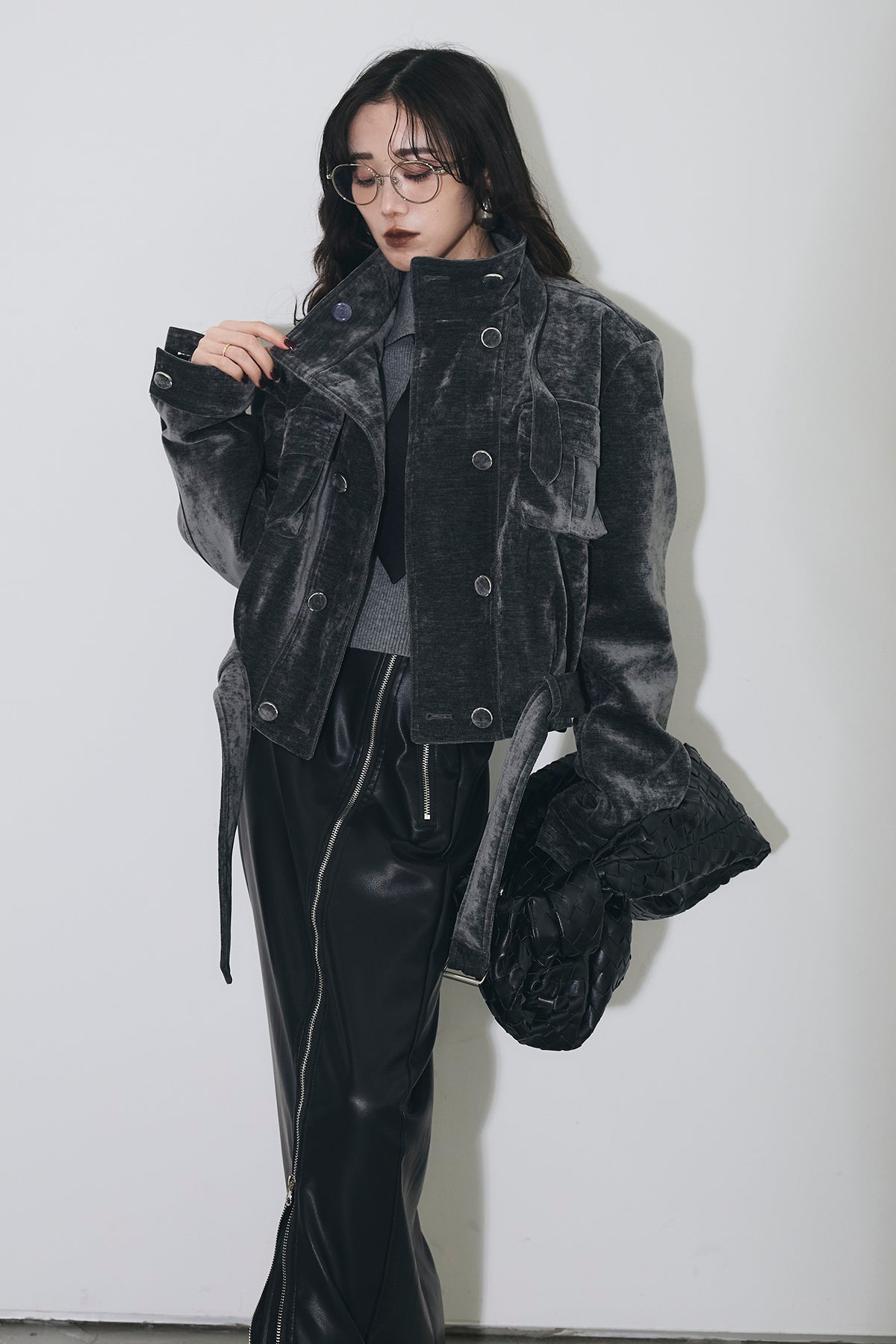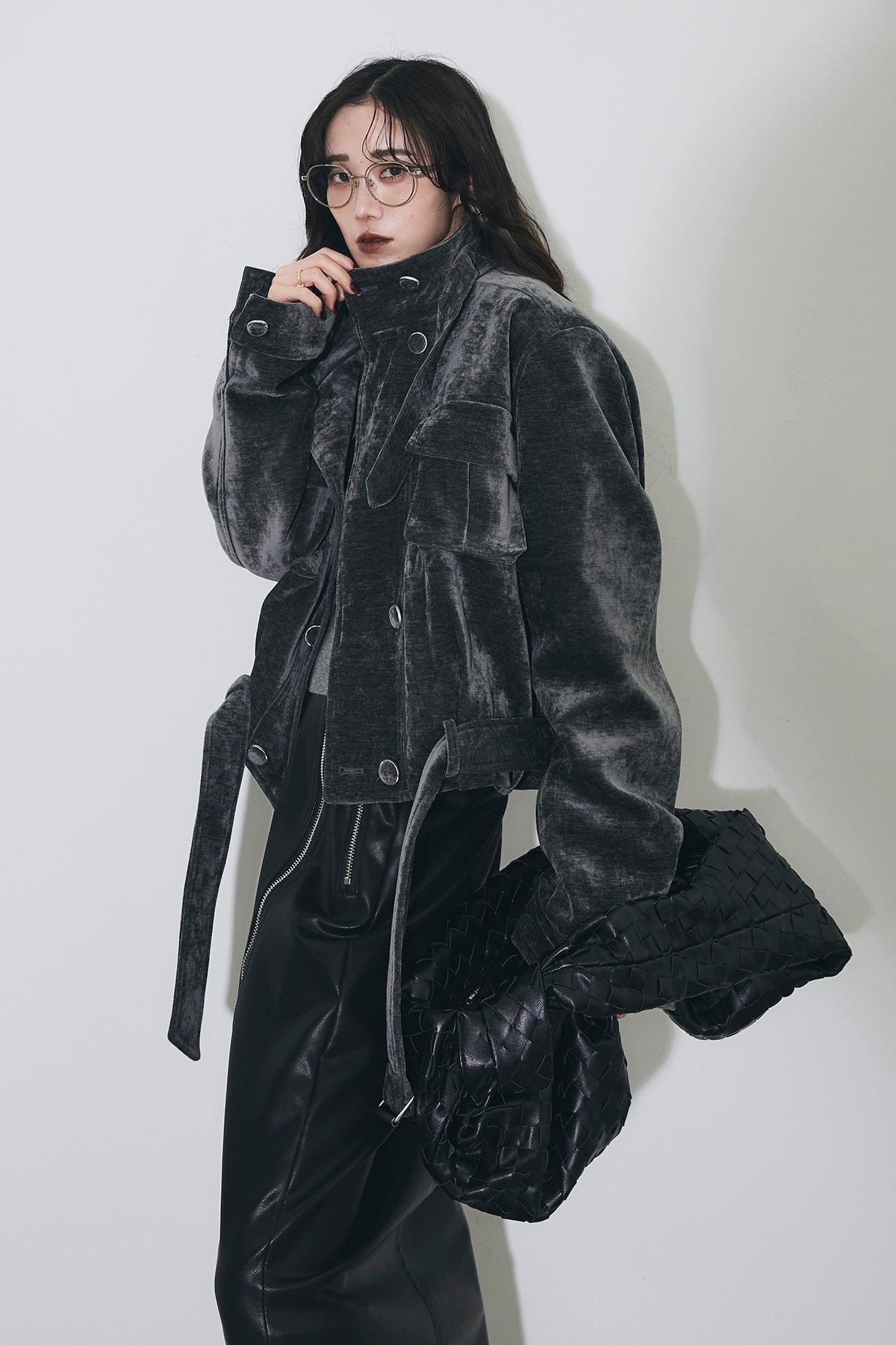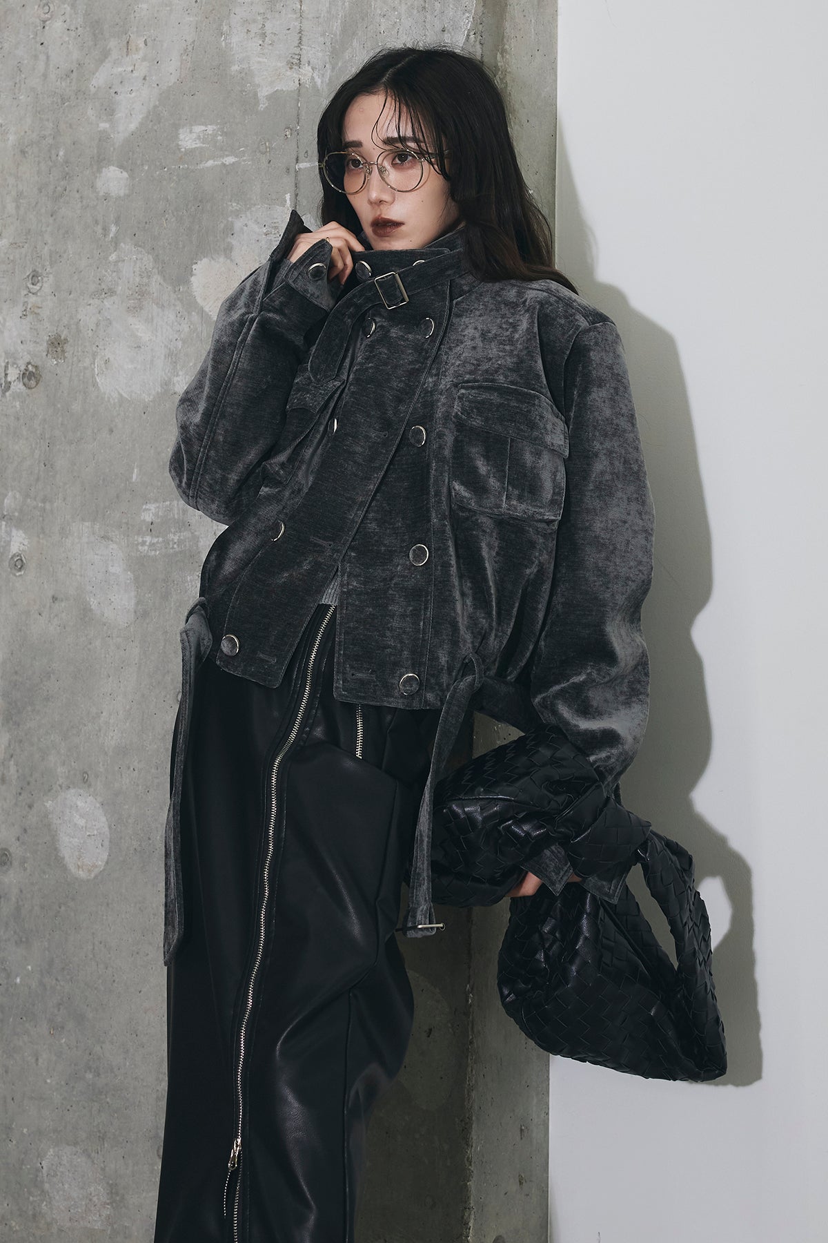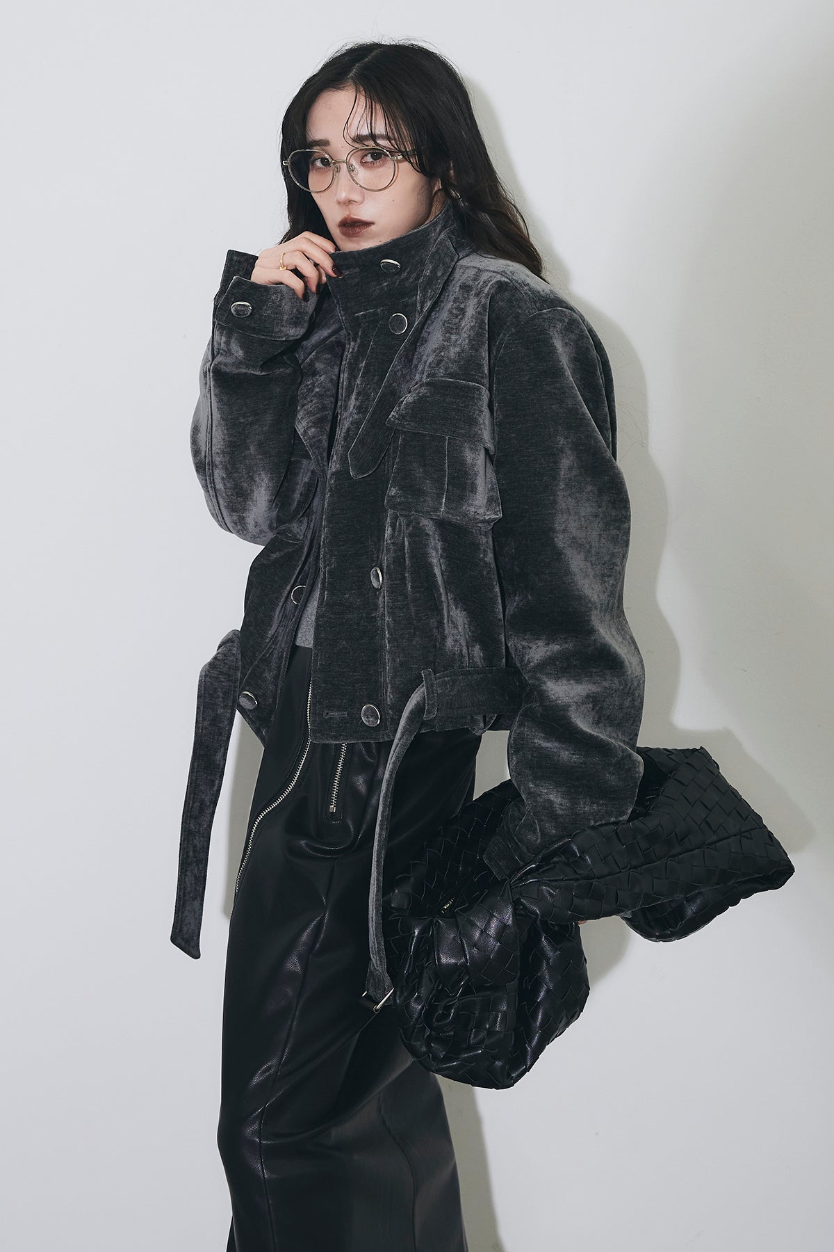 ご注文前に必ずページ下部「お届け期間」をご確認くださいませ。柔らかな光沢が上品なベロア素材のダブルジャケット。 程よくゆとりのあるシルエットで、インナーにニットを合わせても すっきりと着こなせるデザインです。 ウエストのベルトディテールがアクセントとなり、 シルエットの調整も可能。 ミリタリーテイストのフラップポケットと ベロア特有の滑らかな質感が融合した、モードな一着です。