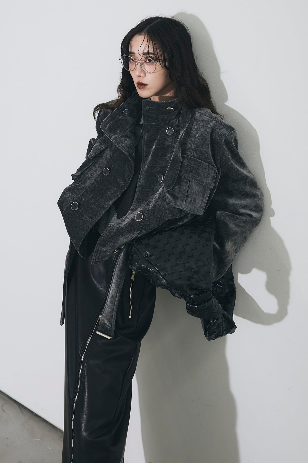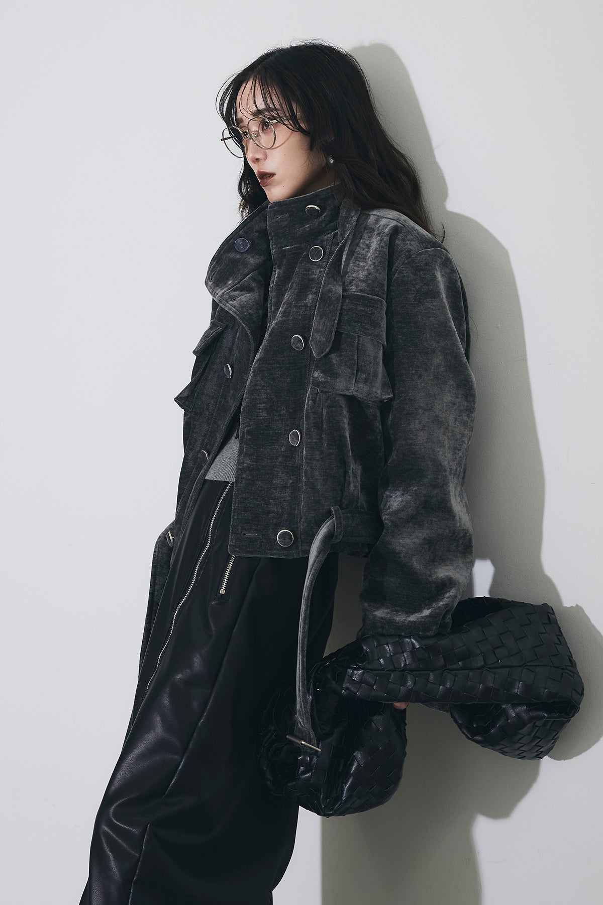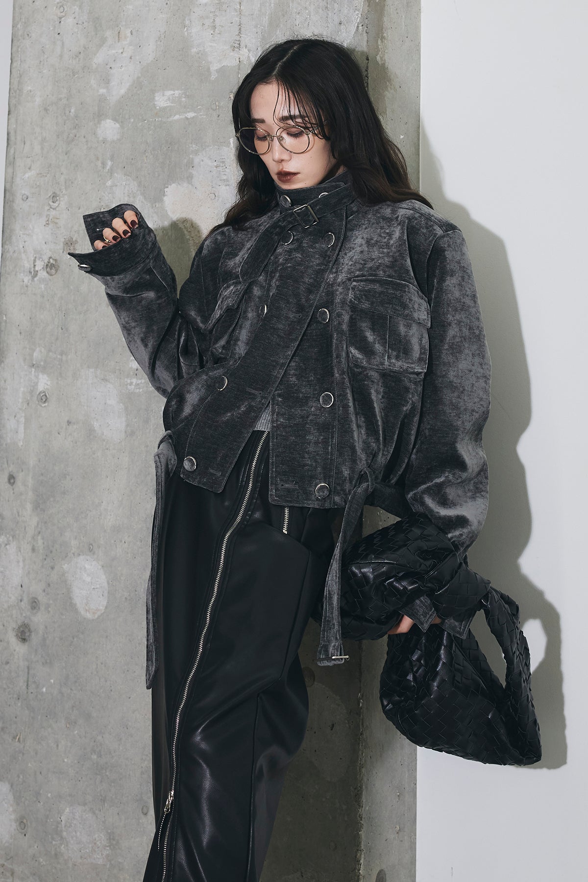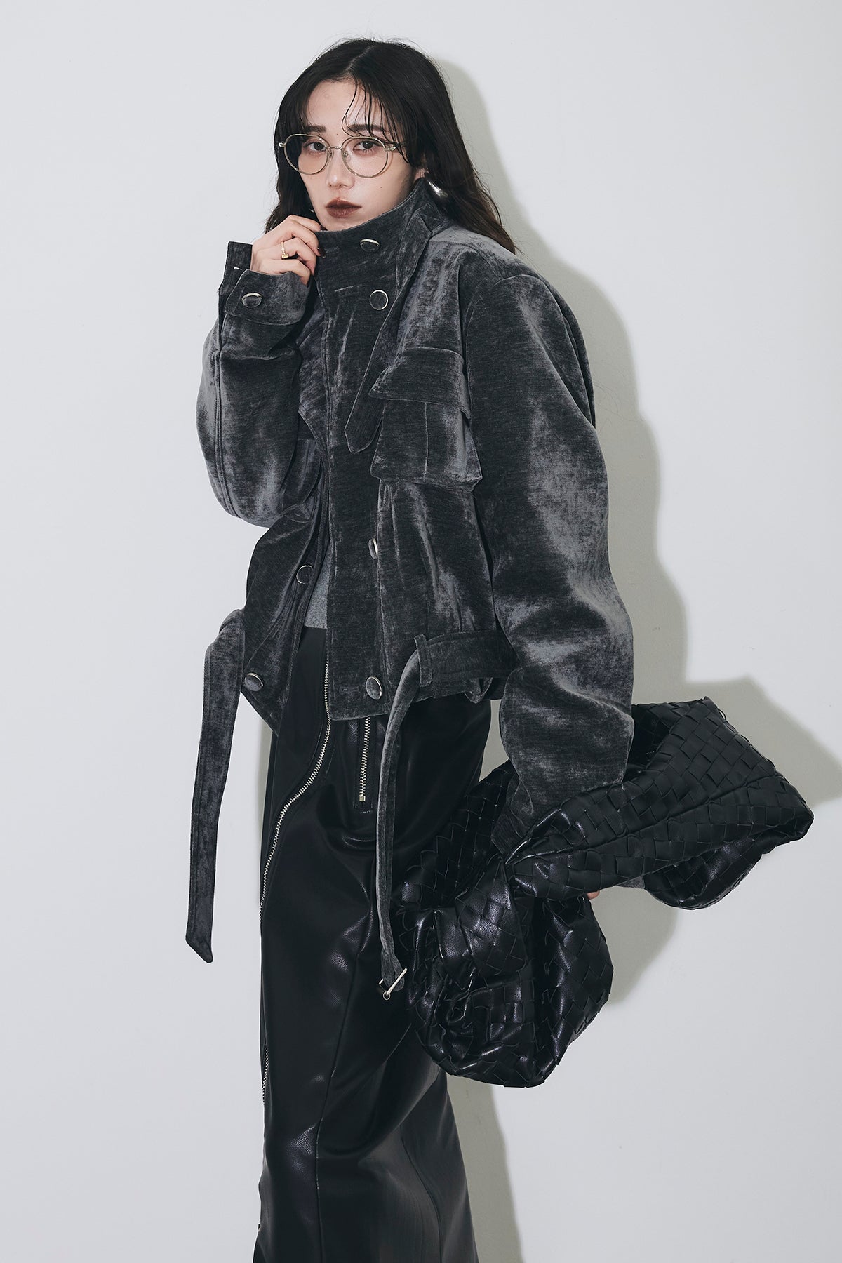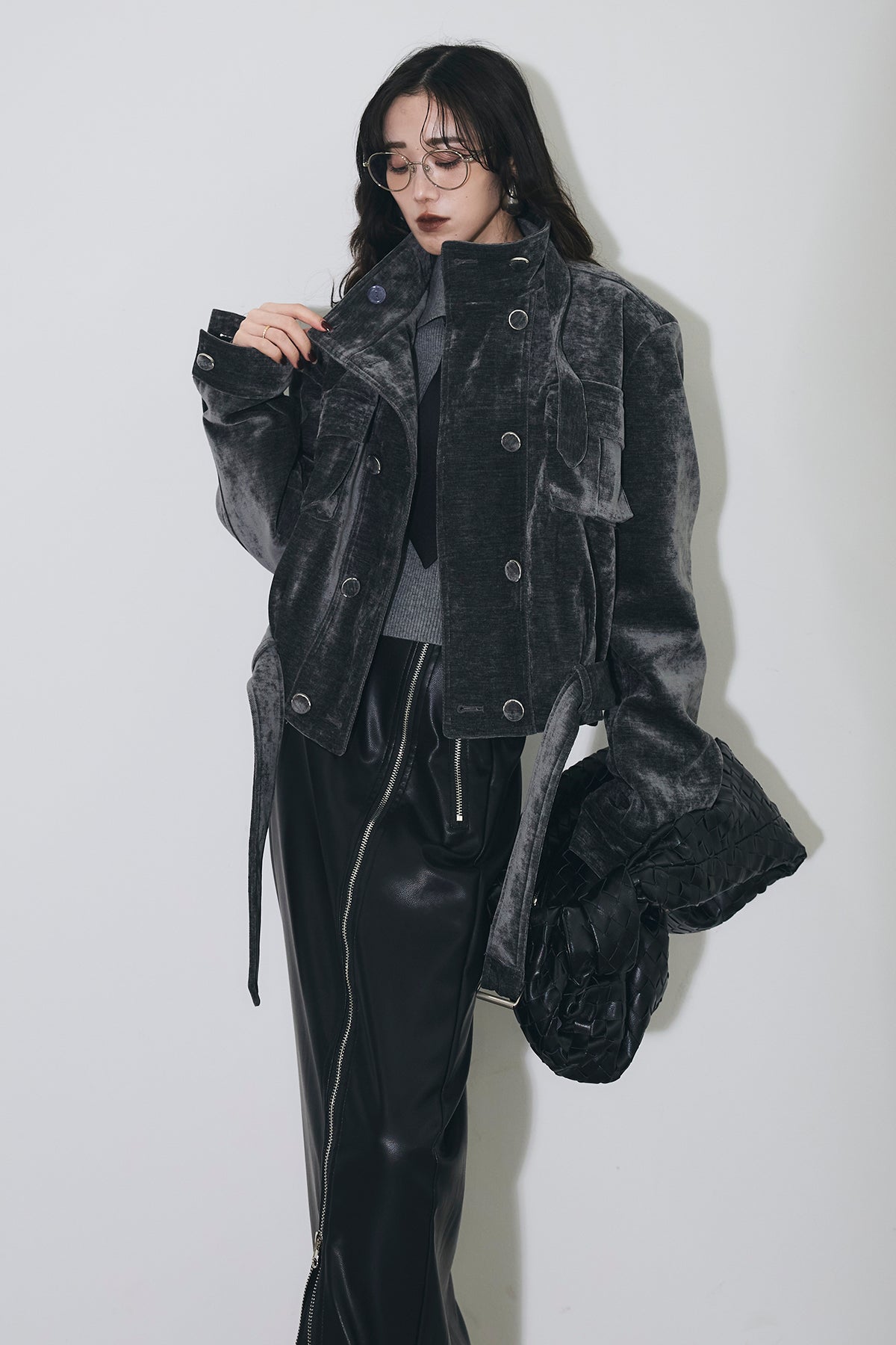 ご注文前に必ずページ下部「お届け期間」をご確認くださいませ。柔らかな光沢が上品なベロア素材のダブルジャケット。 程よくゆとりのあるシルエットで、インナーにニットを合わせても すっきりと着こなせるデザインです。 ウエストのベルトディテールがアクセントとなり、 シルエットの調整も可能。 ミリタリーテイストのフラップポケットと ベロア特有の滑らかな質感が融合した、モードな一着です。