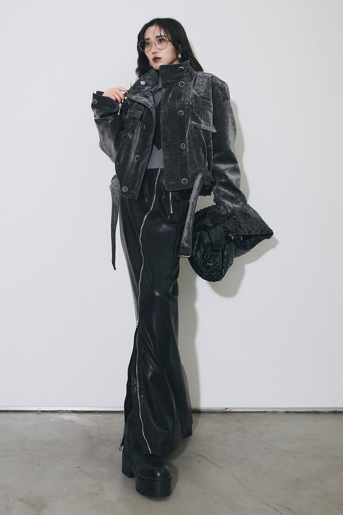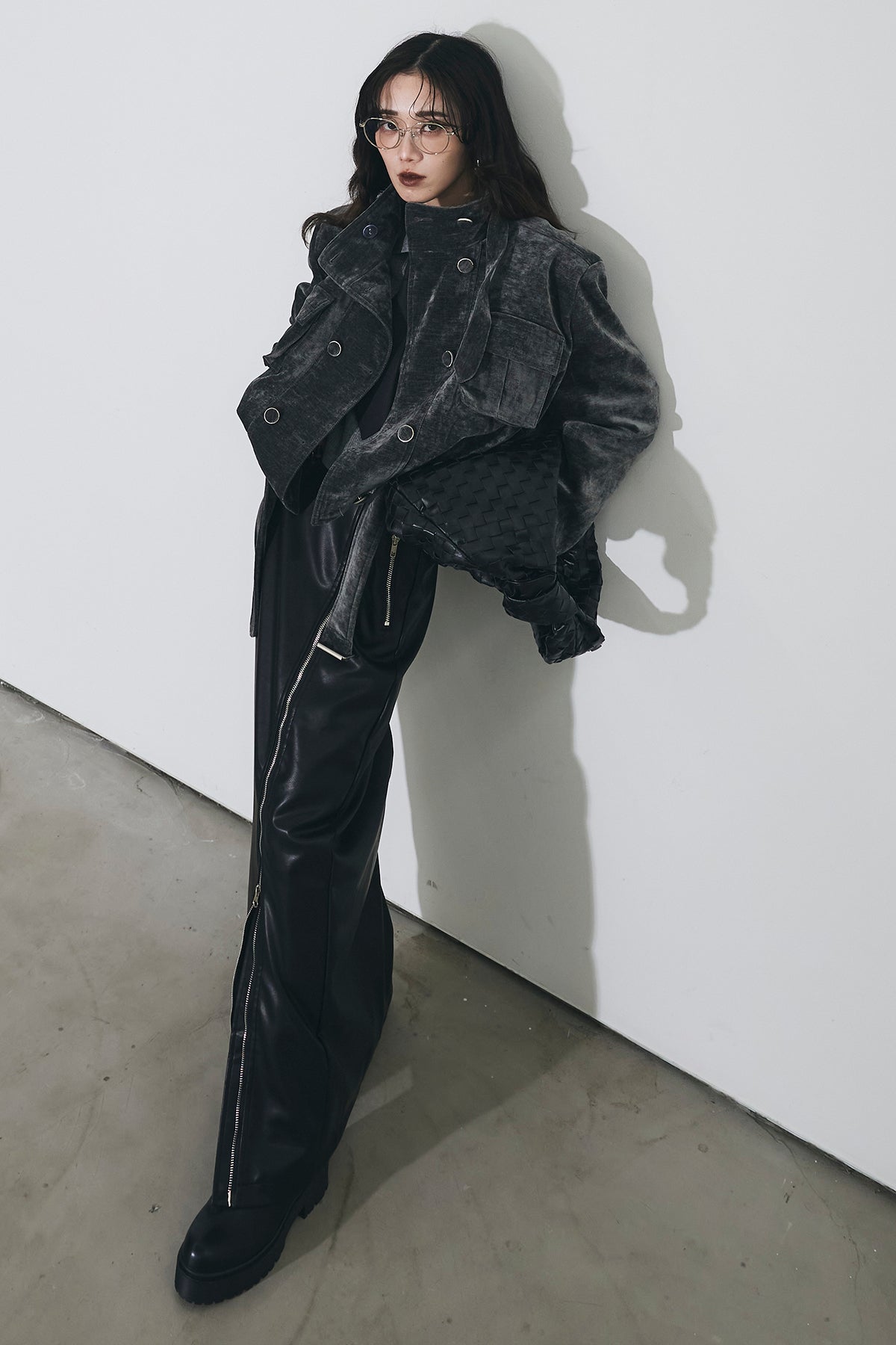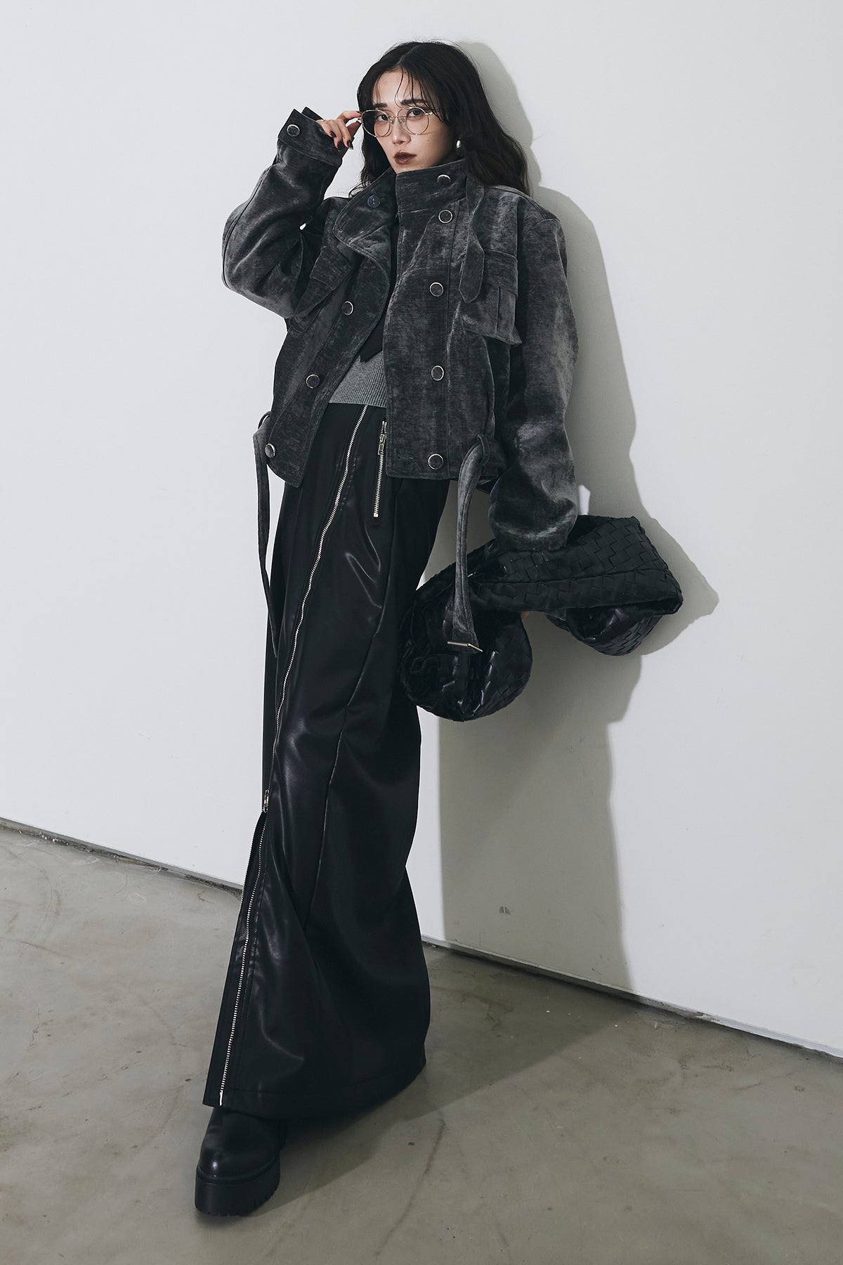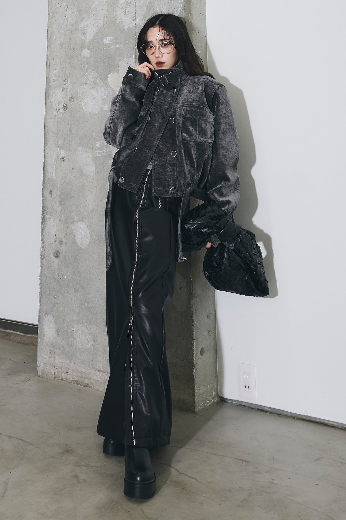 ご注文前に必ずページ下部「お届け期間」をご確認くださいませ。柔らかな光沢が上品なベロア素材のダブルジャケット。 程よくゆとりのあるシルエットで、インナーにニットを合わせても すっきりと着こなせるデザインです。 ウエストのベルトディテールがアクセントとなり、 シルエットの調整も可能。 ミリタリーテイストのフラップポケットと ベロア特有の滑らかな質感が融合した、モードな一着です。