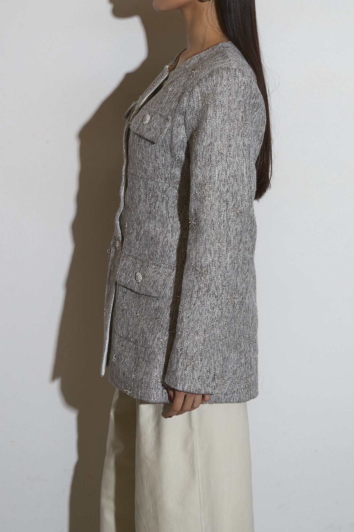 ツイード調のロングジャケット。フロントに並ぶボタンと4つのフラップポケットがポイントで、上品なシルエットが大人らしいムードを引き立てます。全体にさりげない光沢感があり、シンプルながら華やかさも感じられる一枚です。