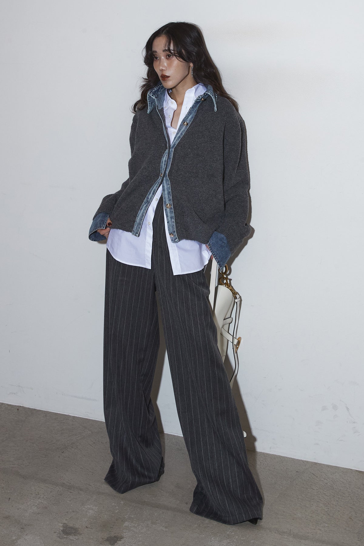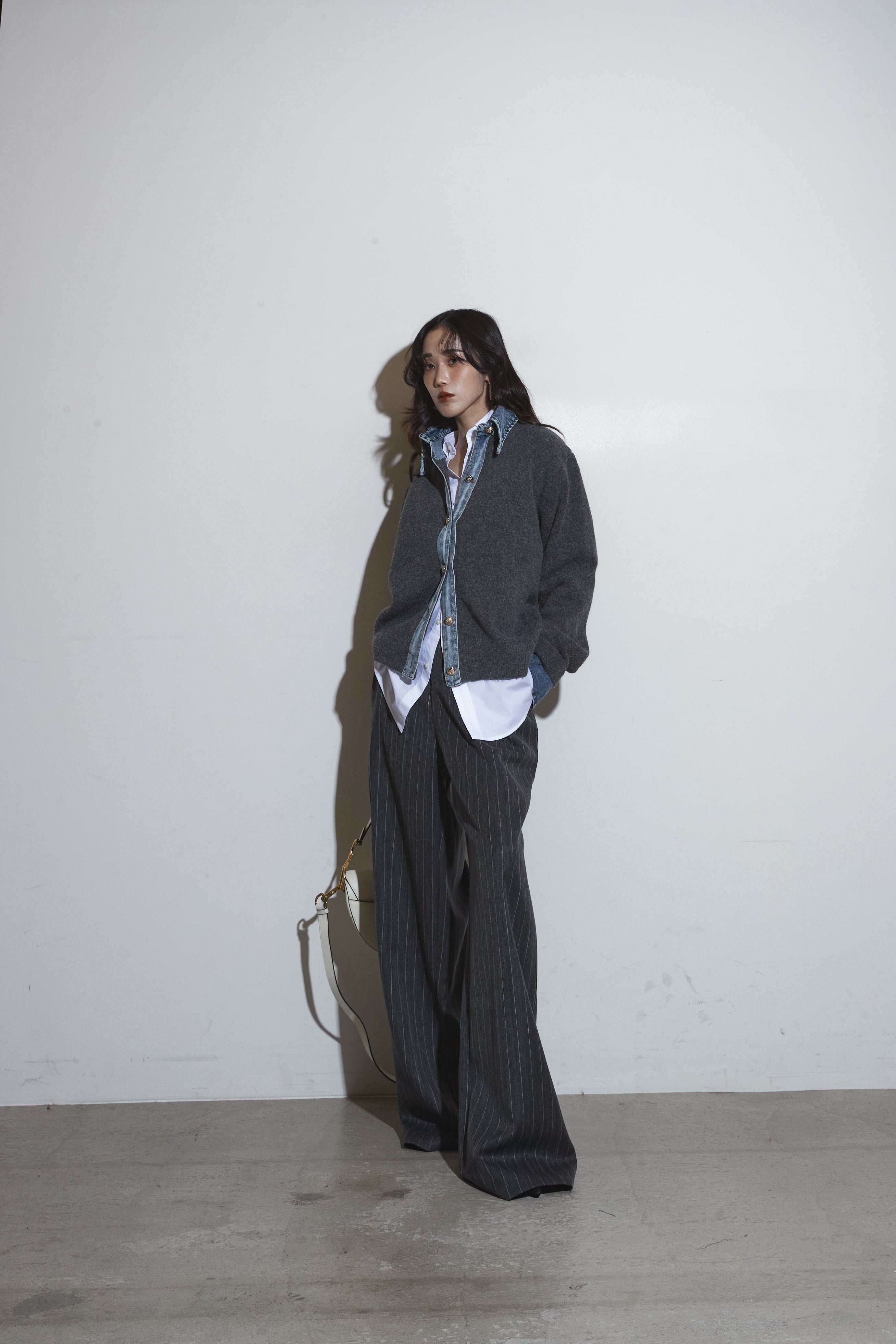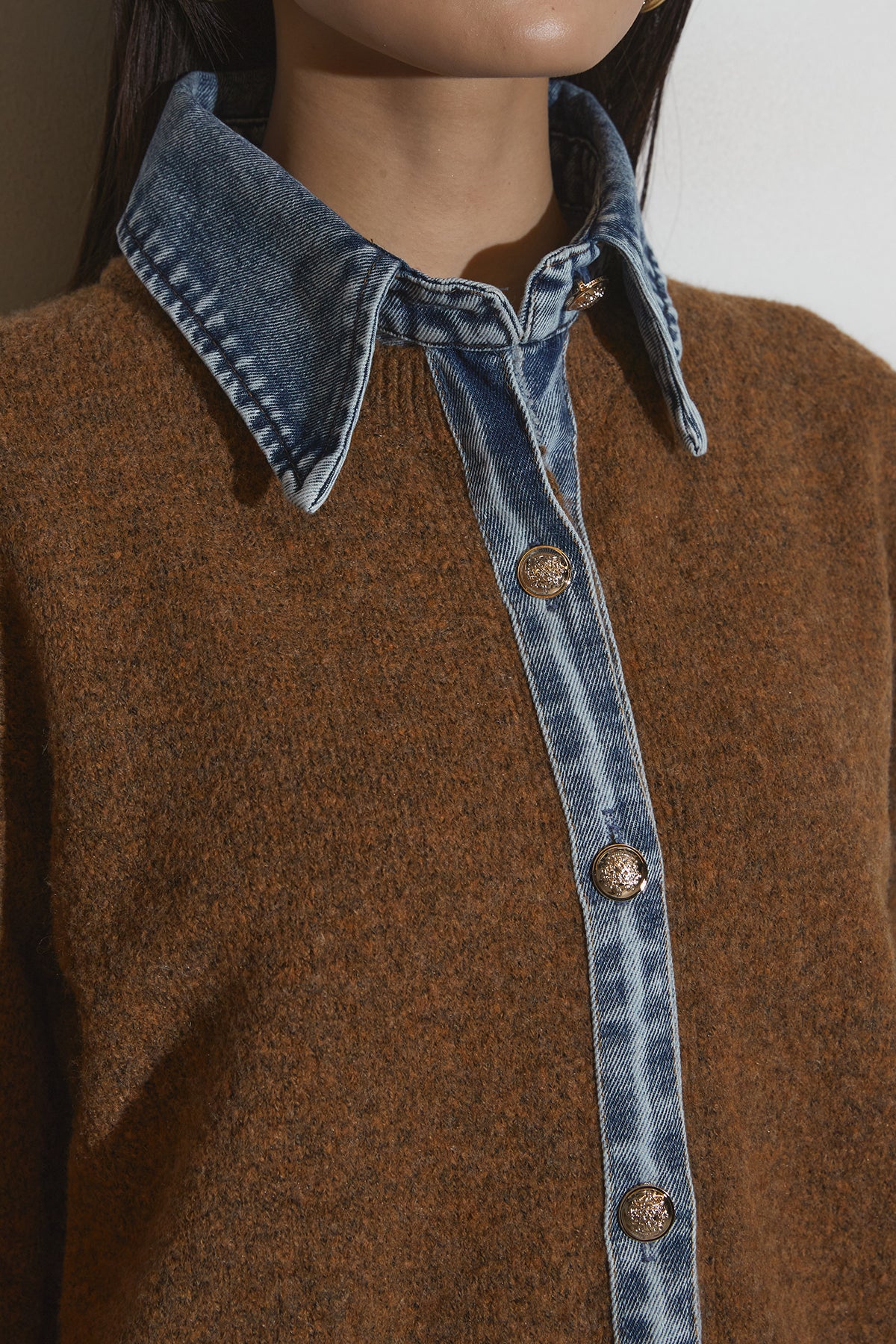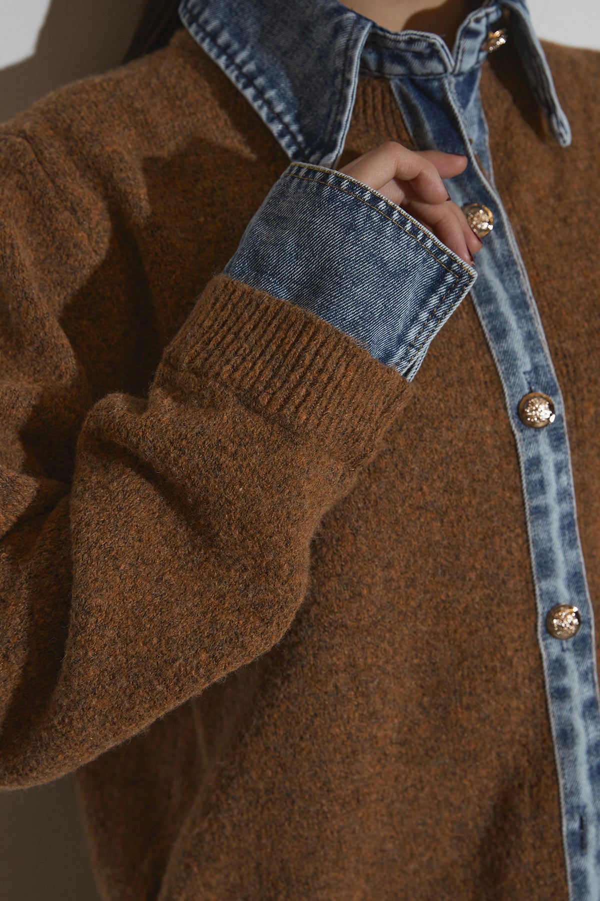 デニムシャツをレイヤードしたようなデザインのニットトップスです。フロントと袖口からのぞくデニム切り替えがポイントで、シンプルなシルエットに程よいアクセントを添えています。