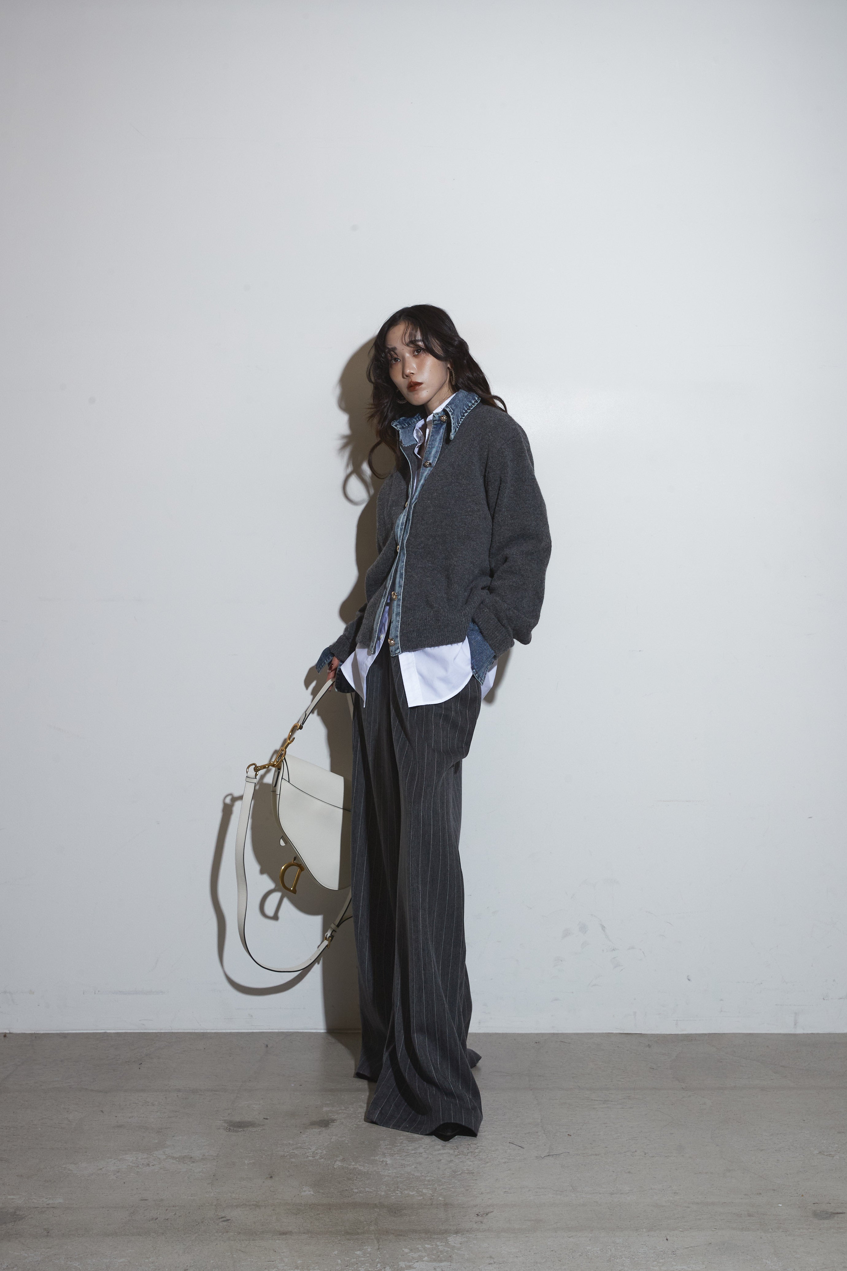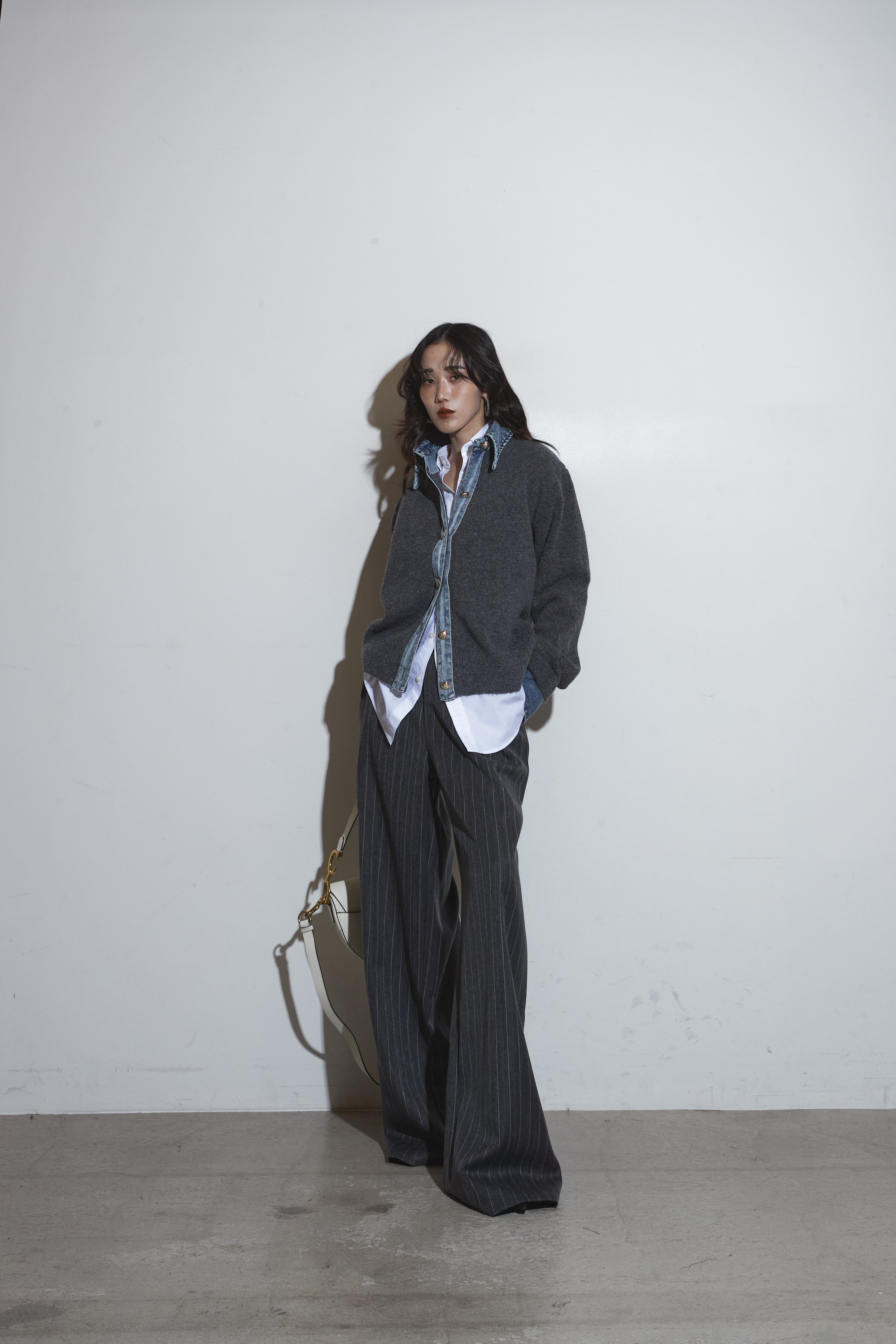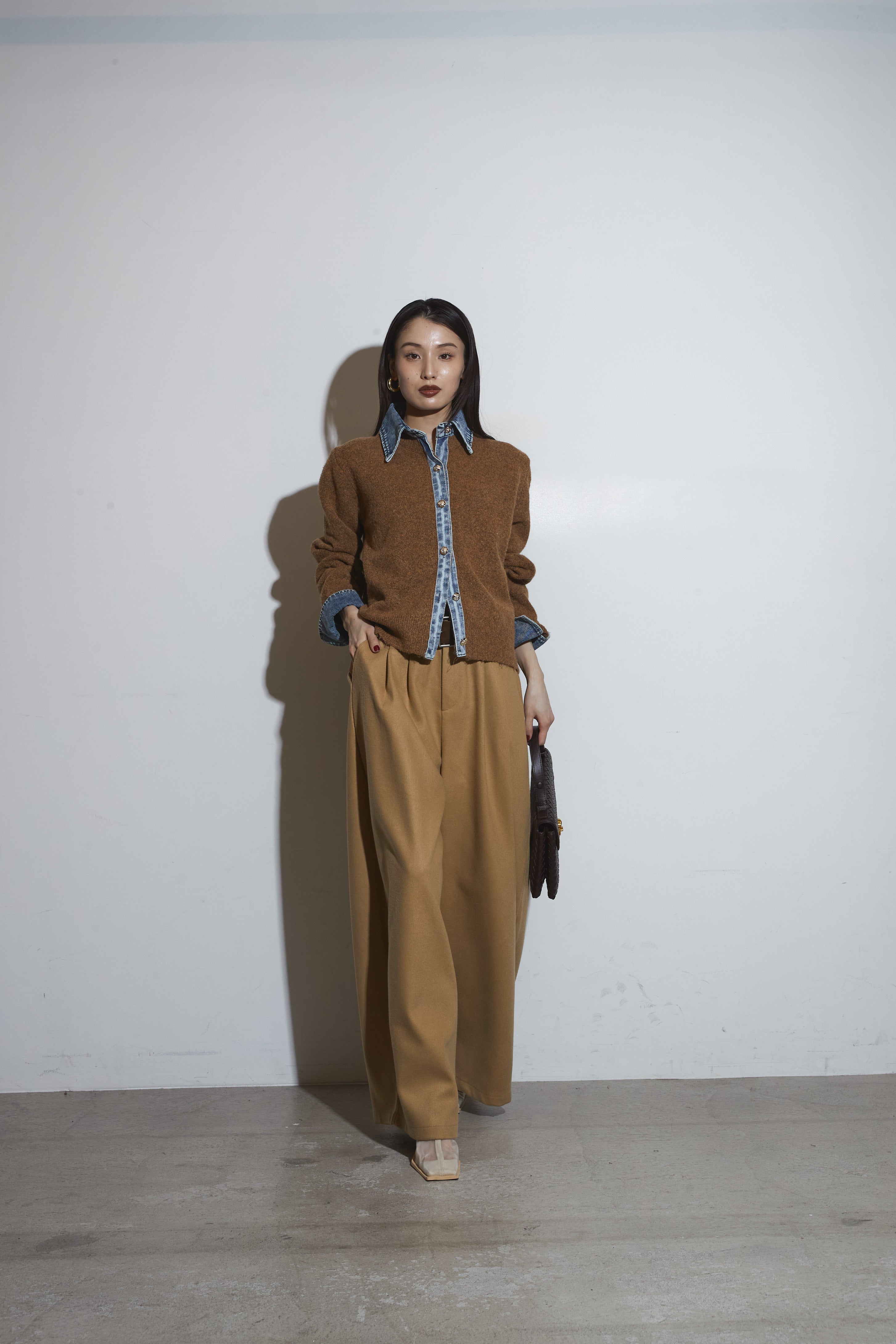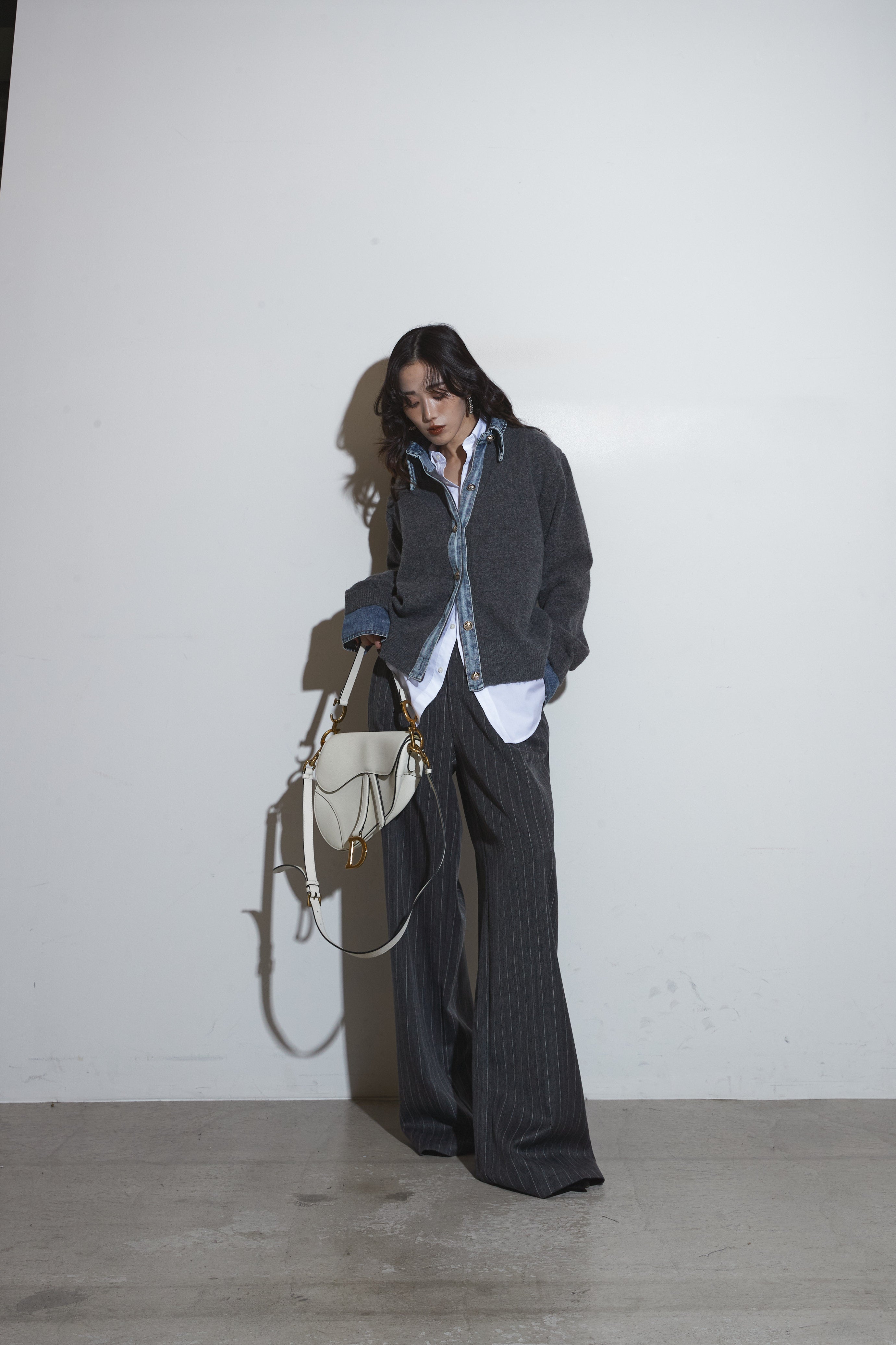 デニムシャツをレイヤードしたようなデザインのニットトップスです。フロントと袖口からのぞくデニム切り替えがポイントで、シンプルなシルエットに程よいアクセントを添えています。