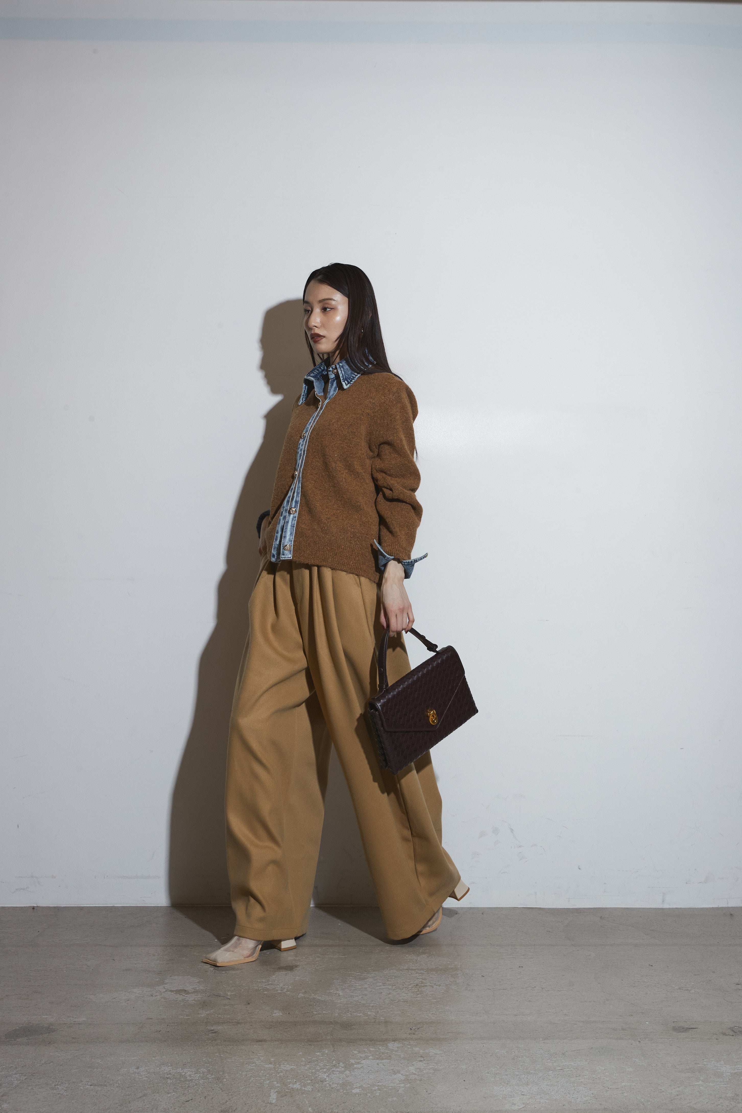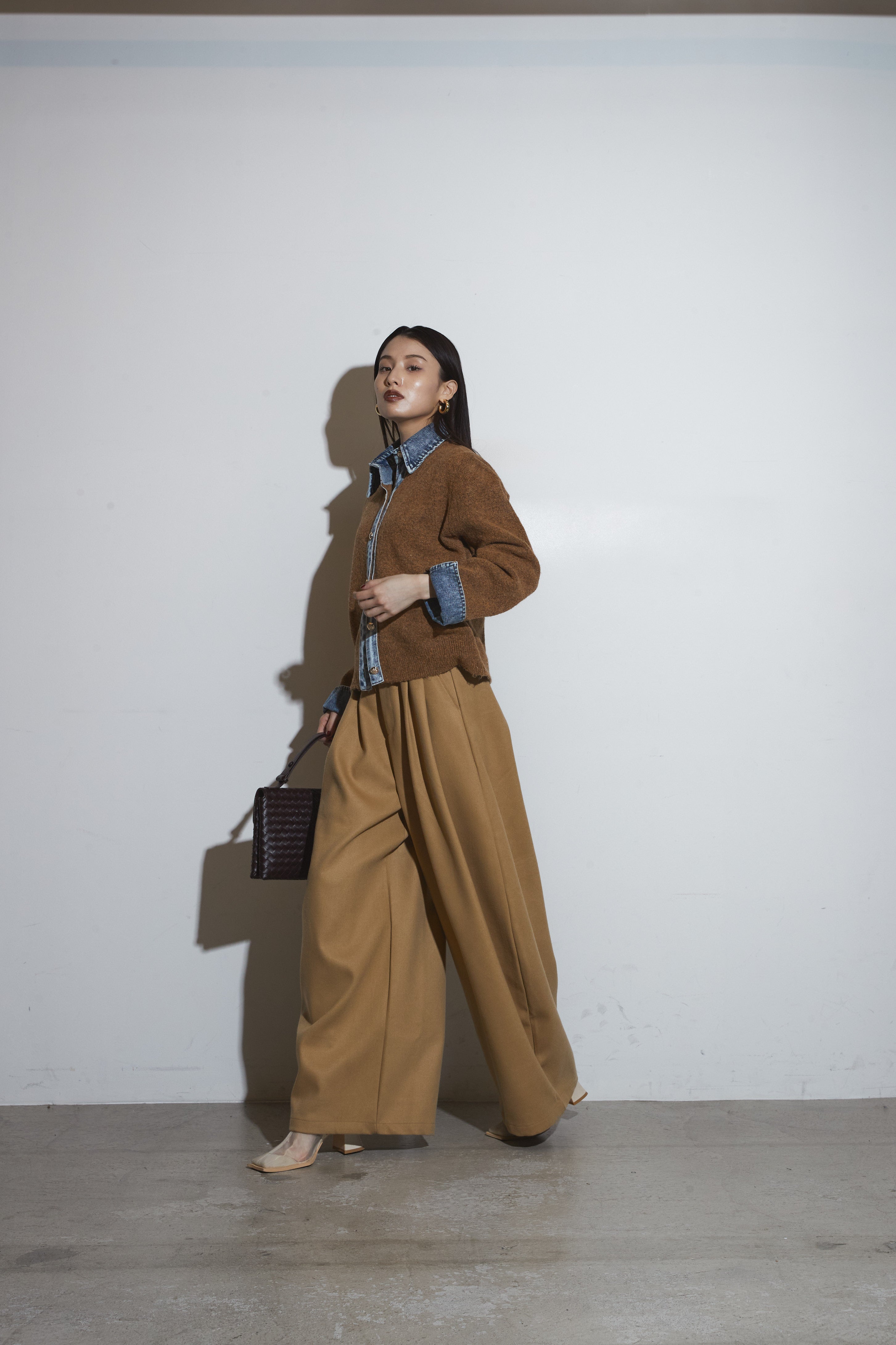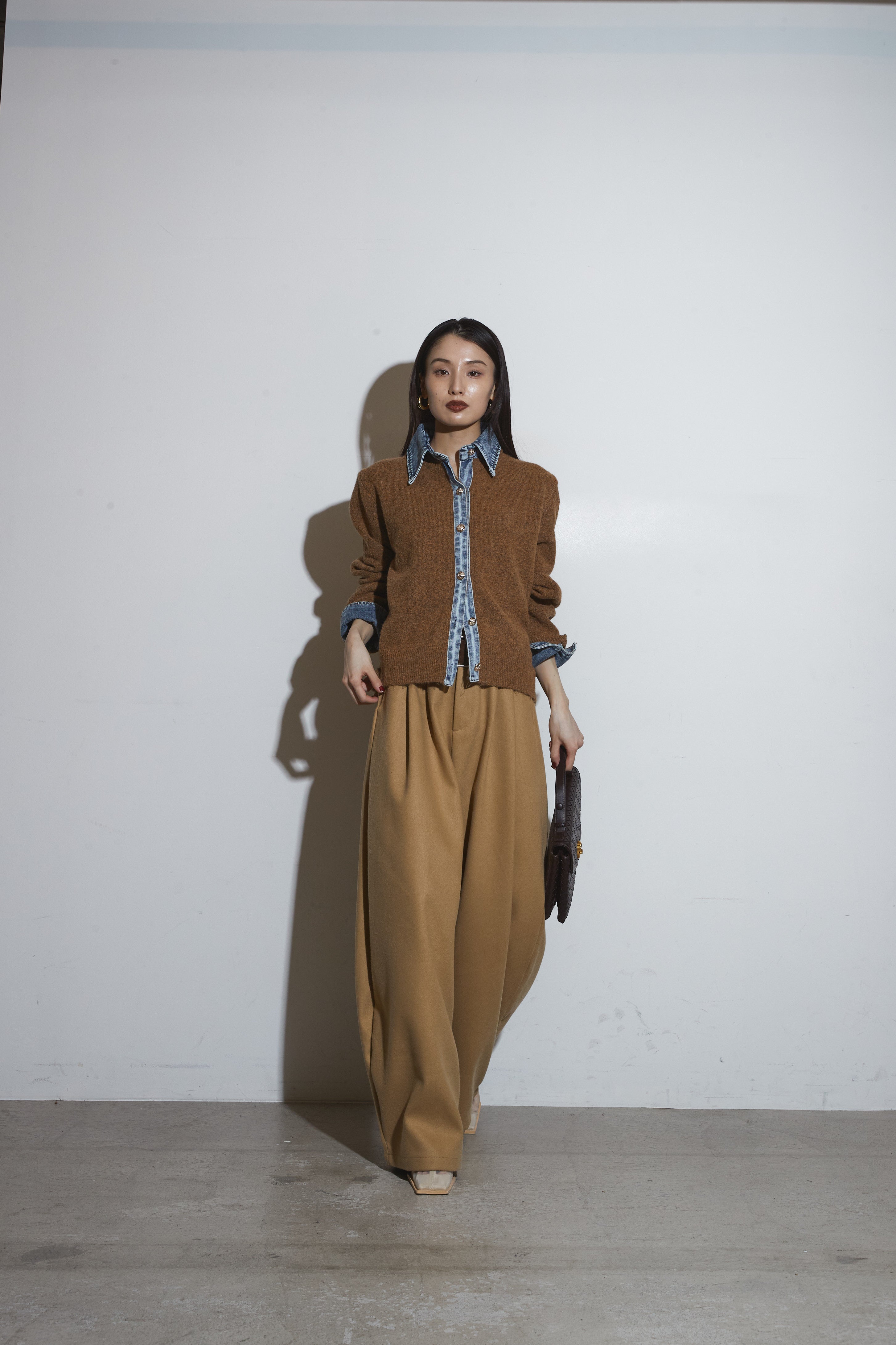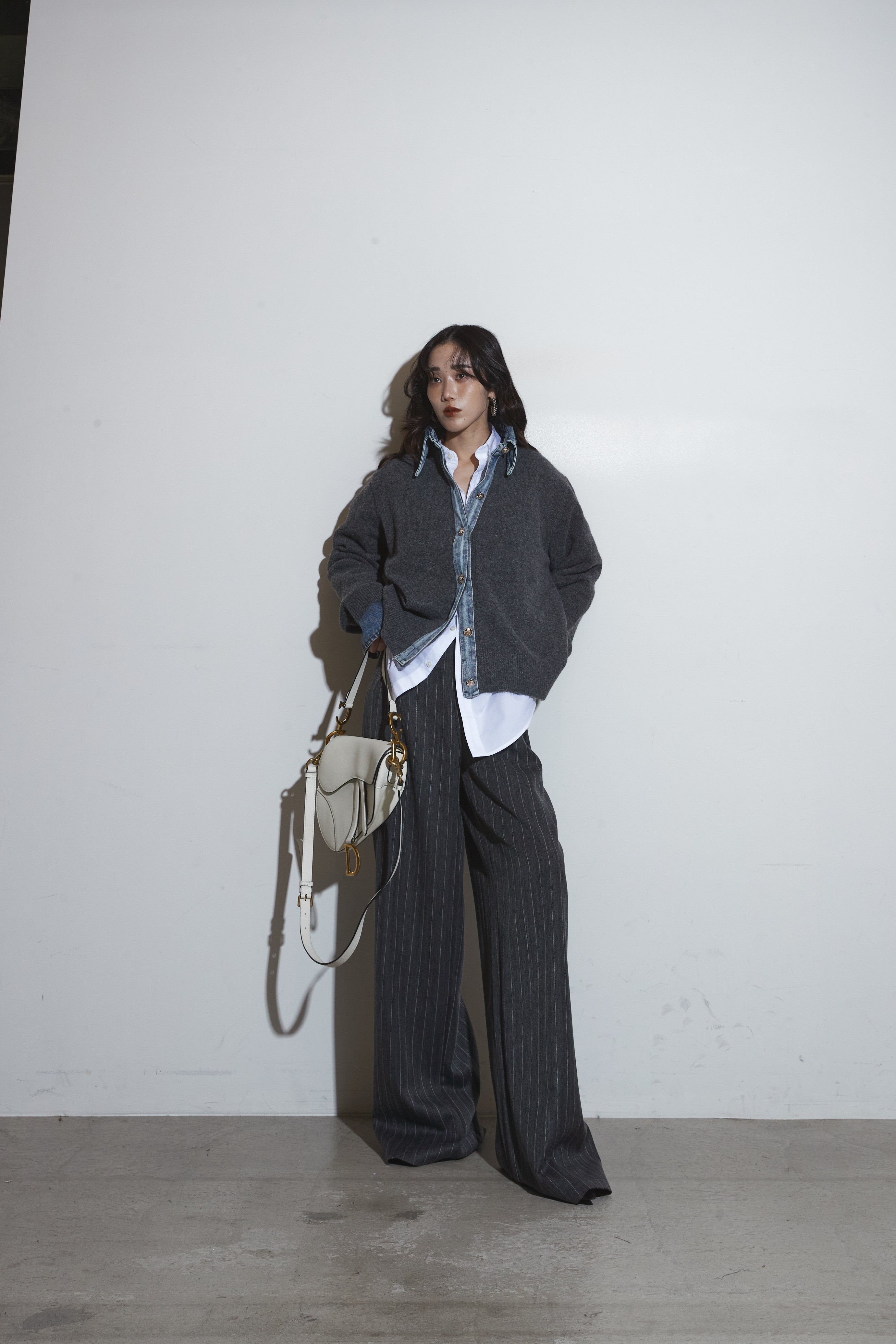 デニムシャツをレイヤードしたようなデザインのニットトップスです。フロントと袖口からのぞくデニム切り替えがポイントで、シンプルなシルエットに程よいアクセントを添えています。