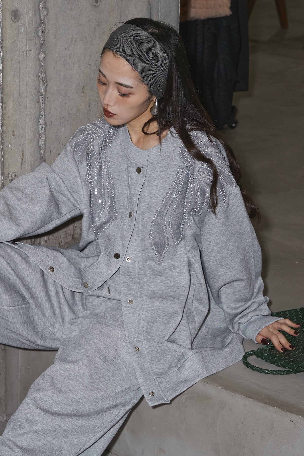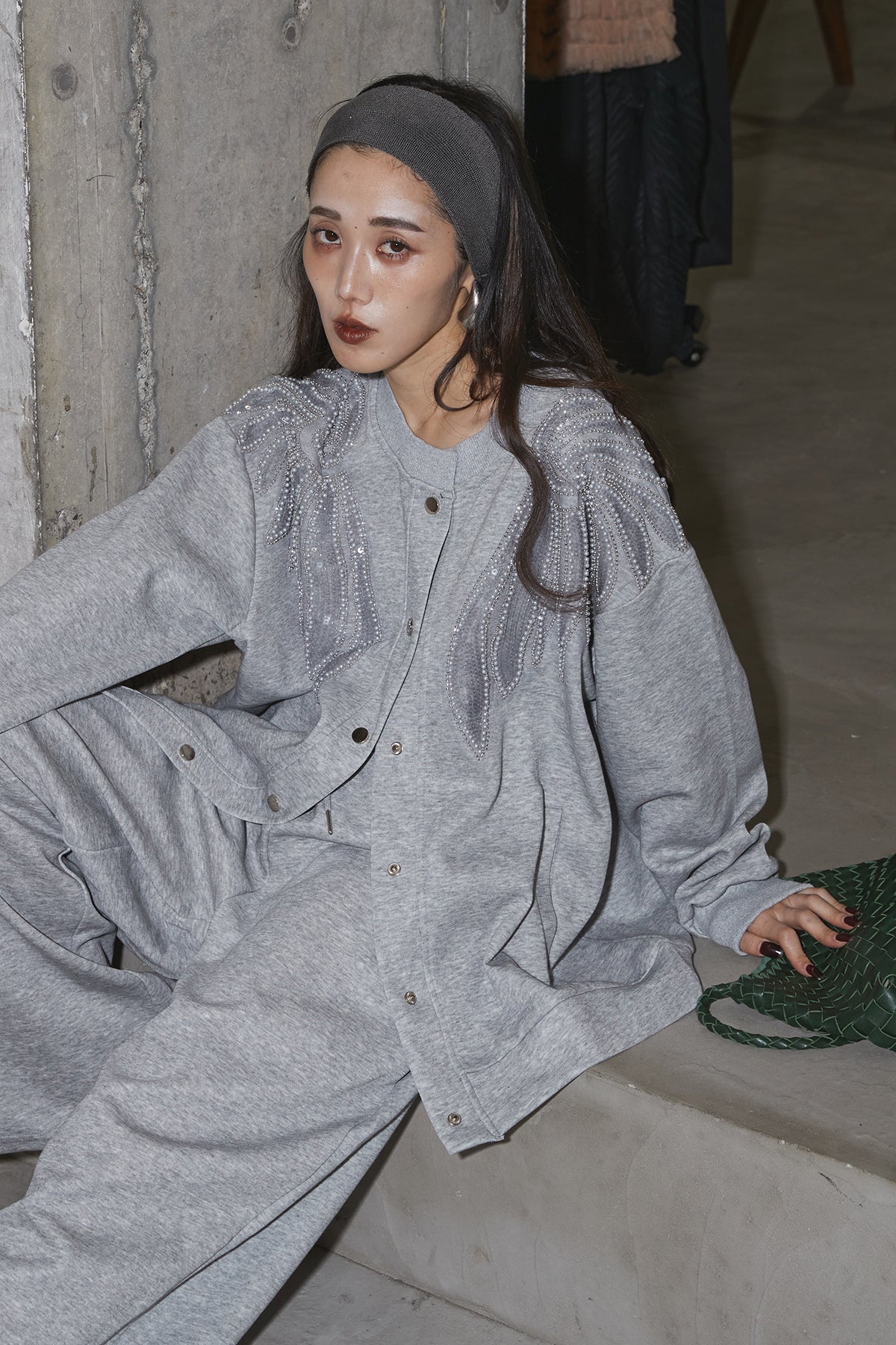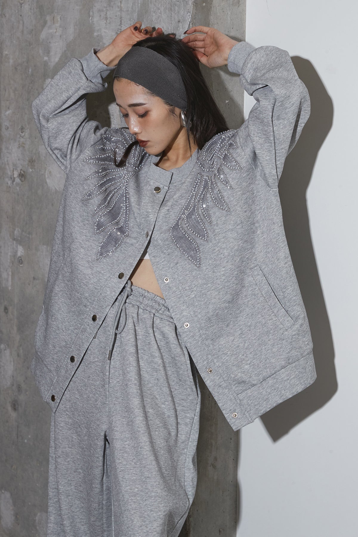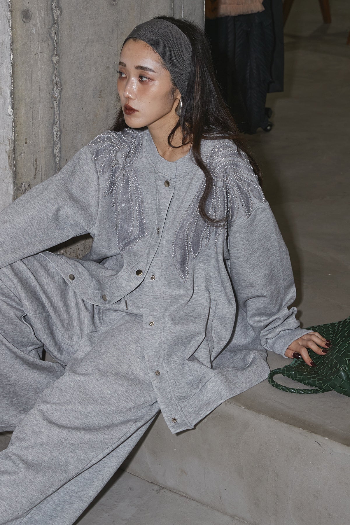 肩周りにビジュー刺繍を施したスウェットブルゾンは、カジュアルさの中に華やかさを添える一着で、軽い羽織りとしても存在感を放ち、ゆったりシルエットで抜け感のあるスタイルに仕上がります。シンプルなワイドスウェットパンツは、リラックスした穿き心地ながらもきれいな落ち感があり、デイリーに使いやすい万能アイテムです。