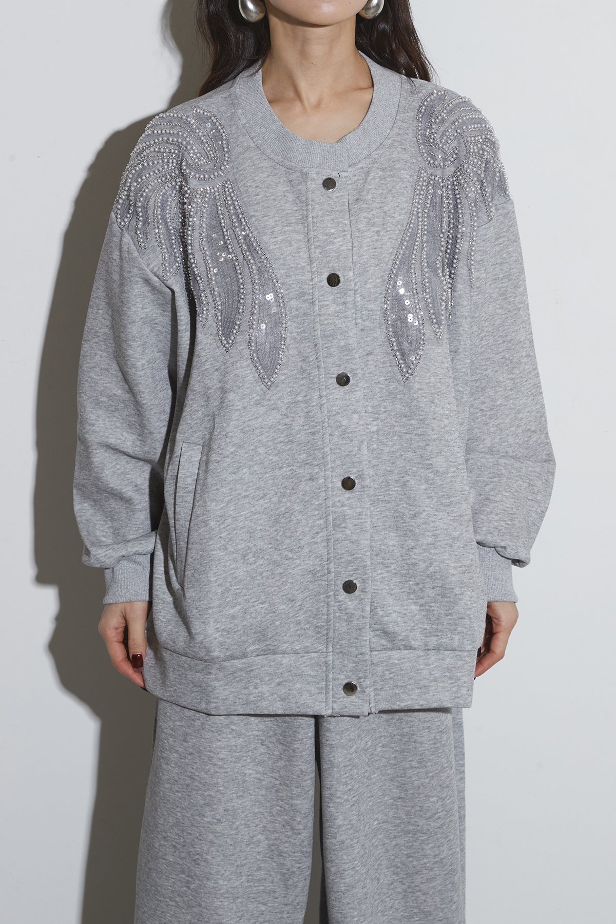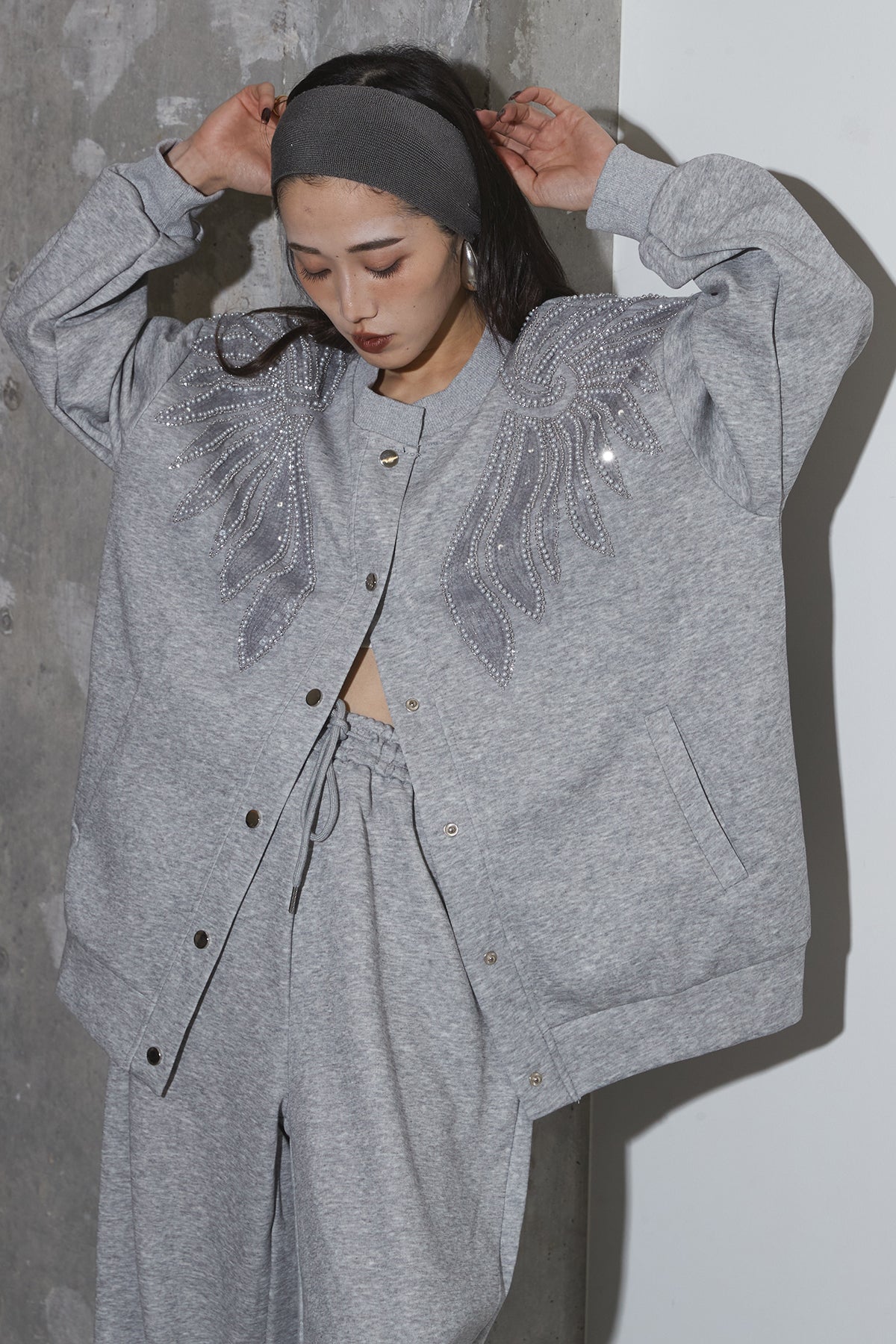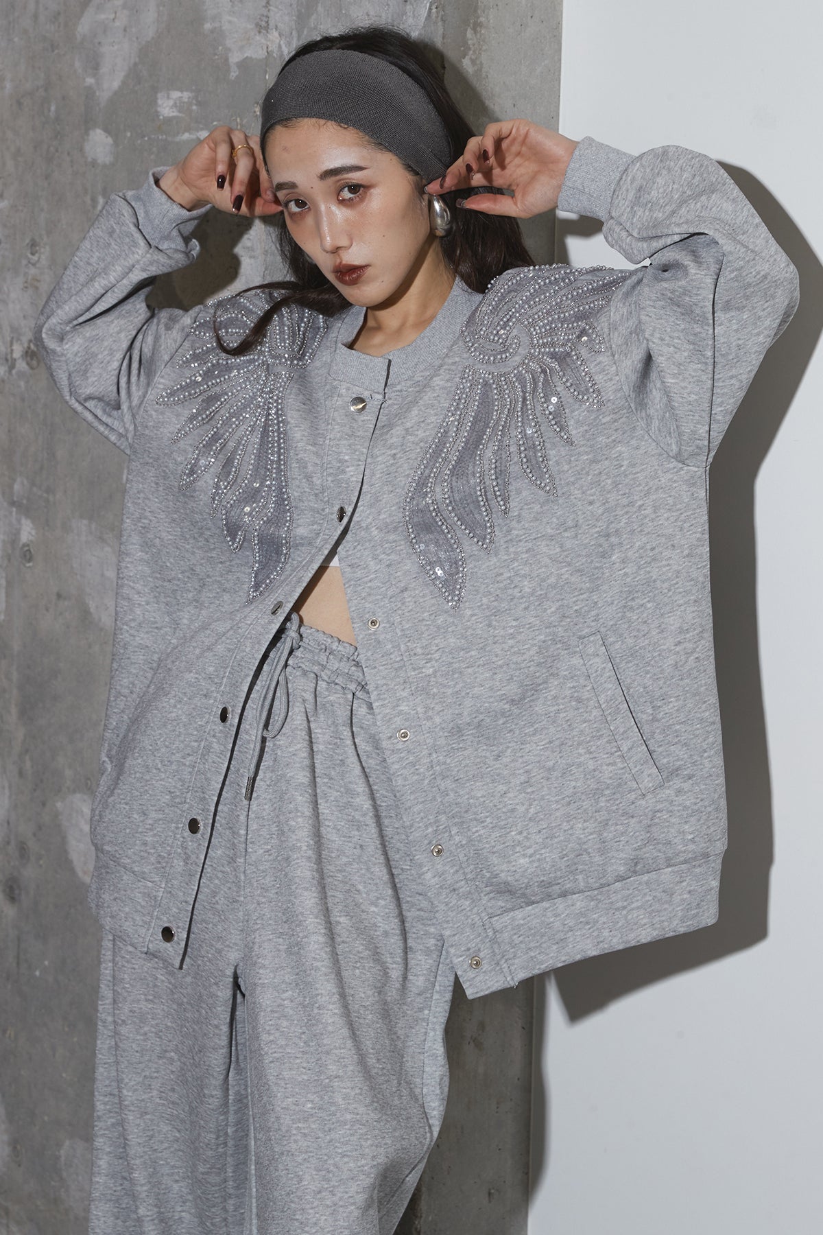 肩周りにビジュー刺繍を施したスウェットブルゾンは、カジュアルさの中に華やかさを添える一着で、軽い羽織りとしても存在感を放ち、ゆったりシルエットで抜け感のあるスタイルに仕上がります。シンプルなワイドスウェットパンツは、リラックスした穿き心地ながらもきれいな落ち感があり、デイリーに使いやすい万能アイテムです。