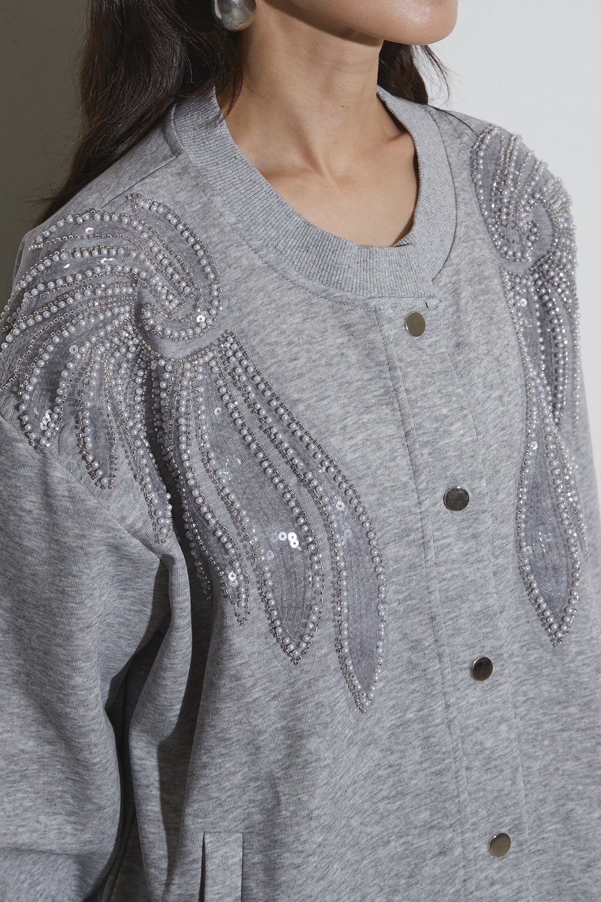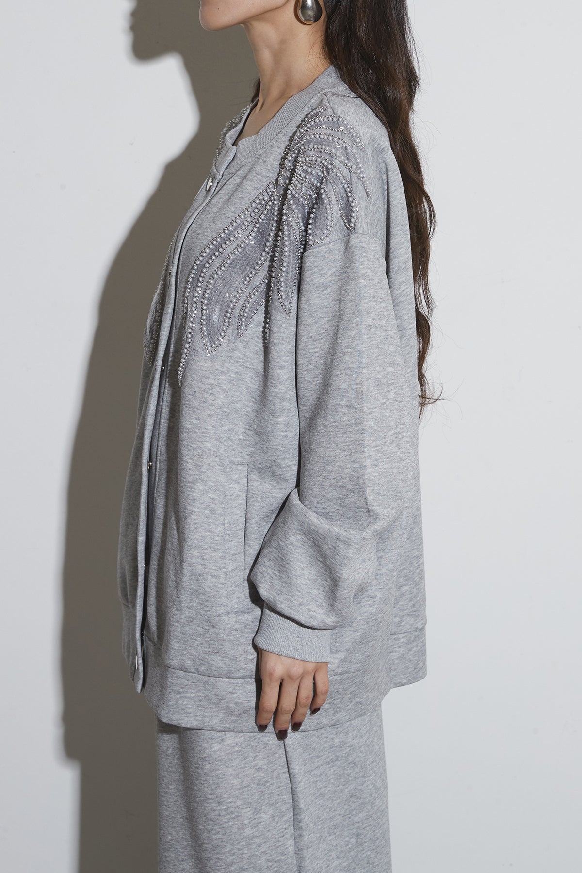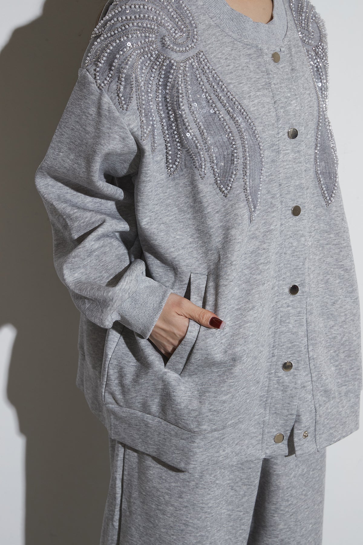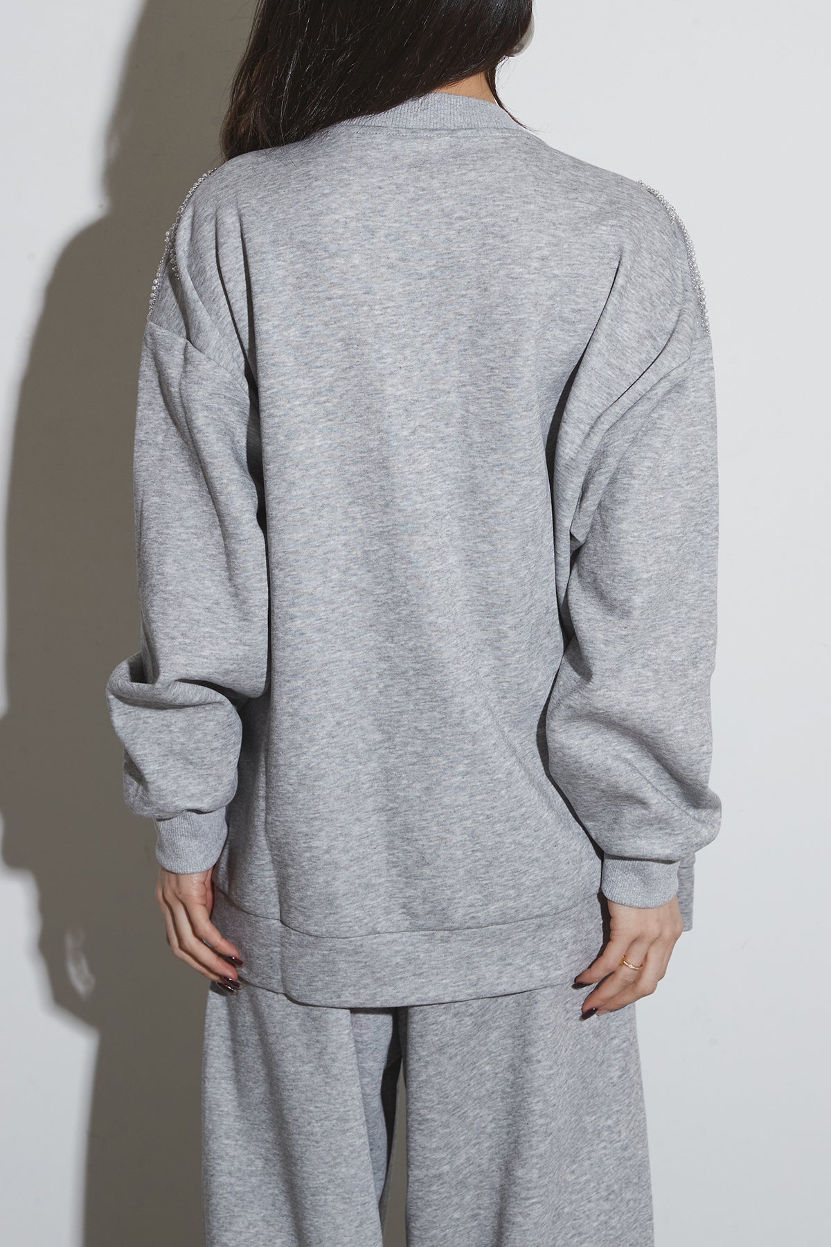 肩周りにビジュー刺繍を施したスウェットブルゾンは、カジュアルさの中に華やかさを添える一着で、軽い羽織りとしても存在感を放ち、ゆったりシルエットで抜け感のあるスタイルに仕上がります。シンプルなワイドスウェットパンツは、リラックスした穿き心地ながらもきれいな落ち感があり、デイリーに使いやすい万能アイテムです。