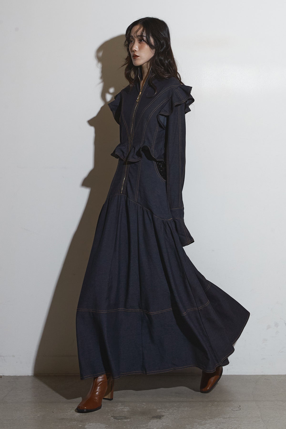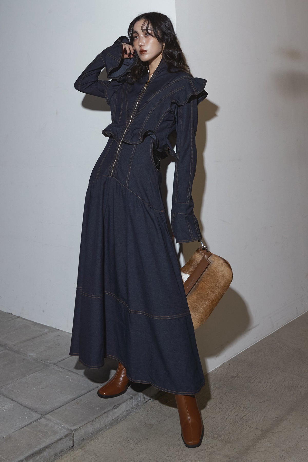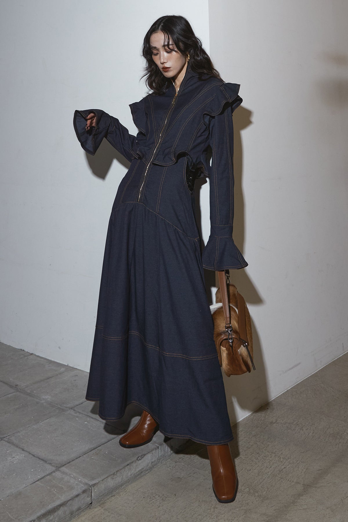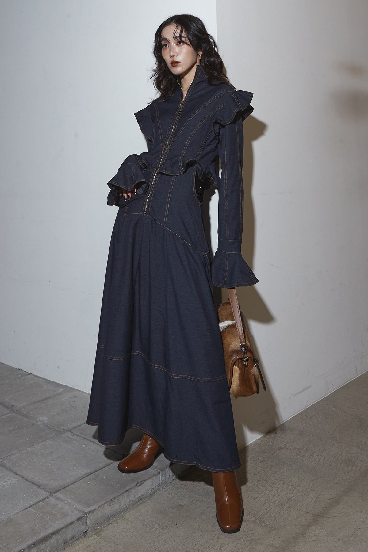 フロントジップとフリル切り替えがポイントのロングワンピース。ほどよく広がるシルエットで、デニムの表情が大人っぽく着られる一枚です。
