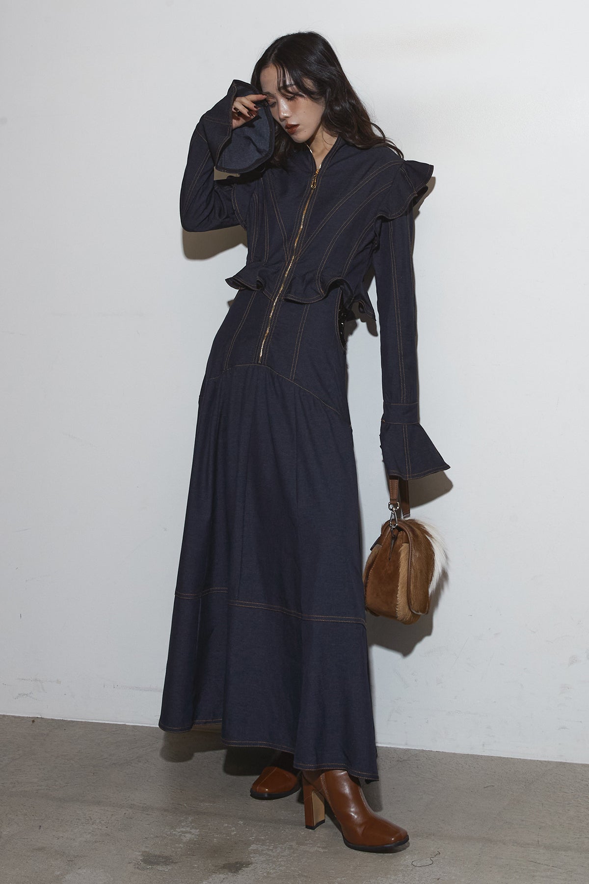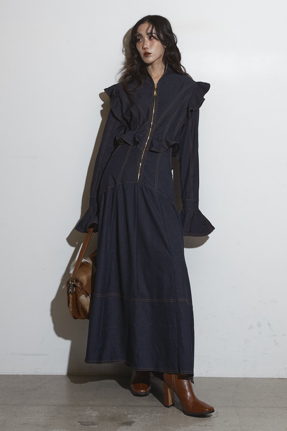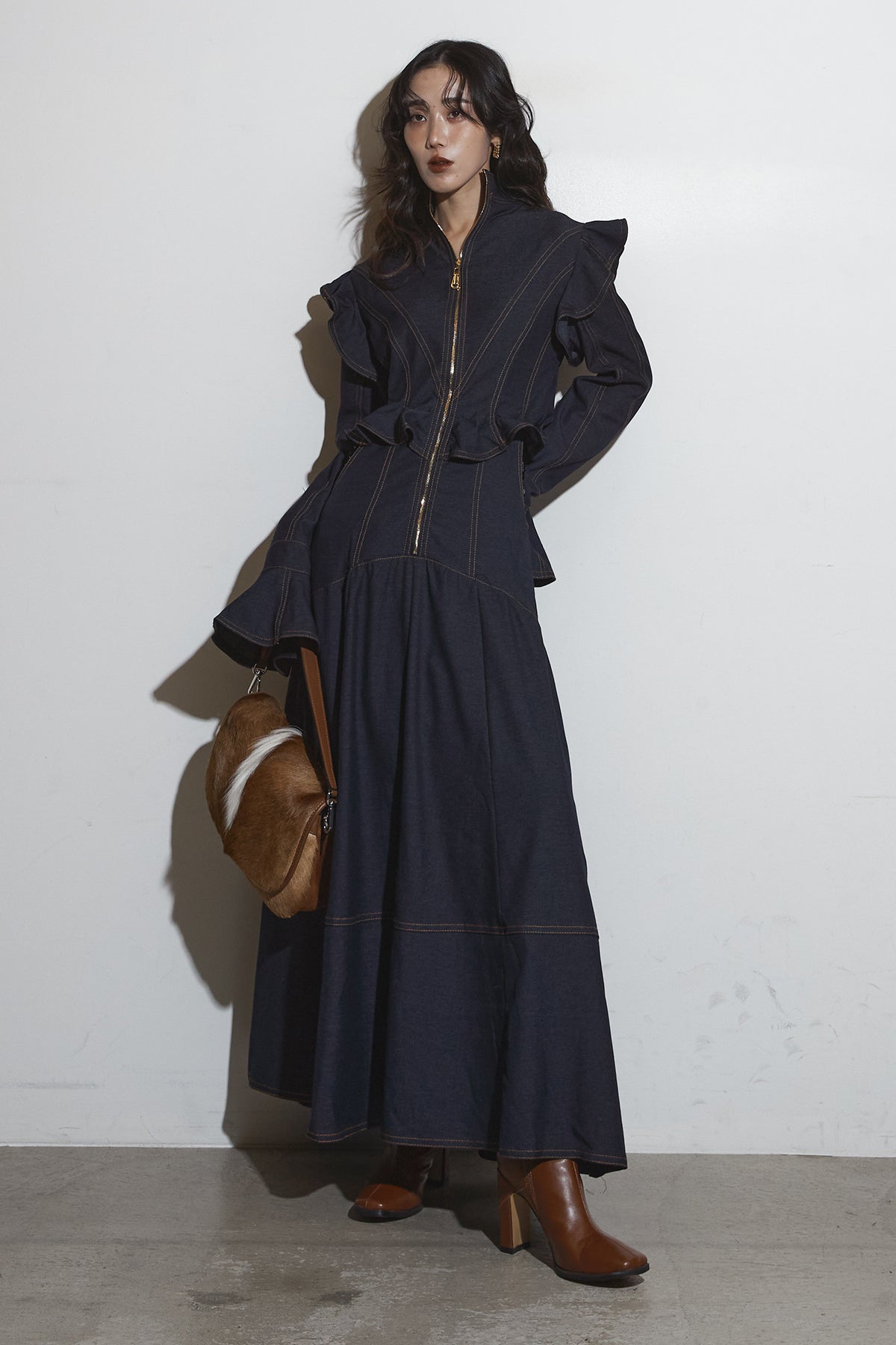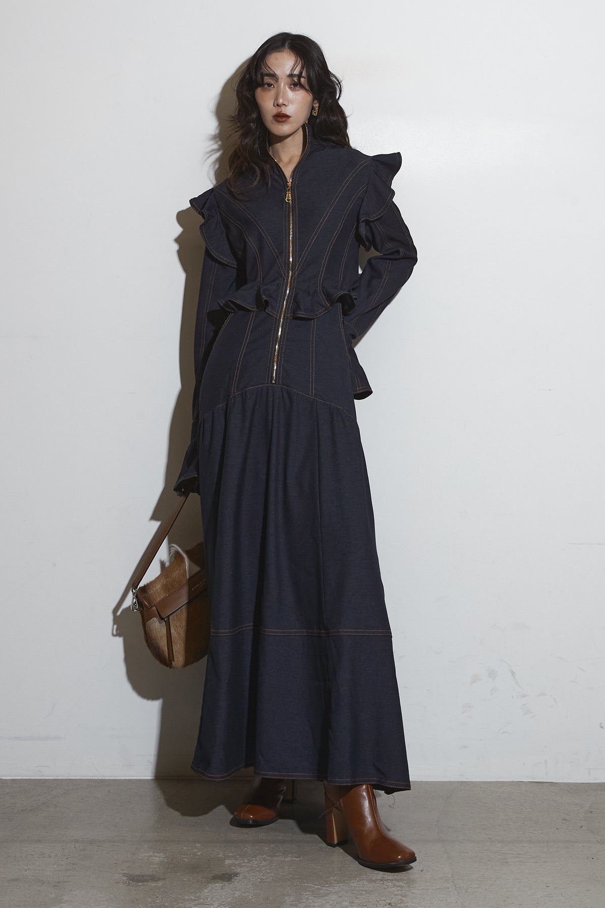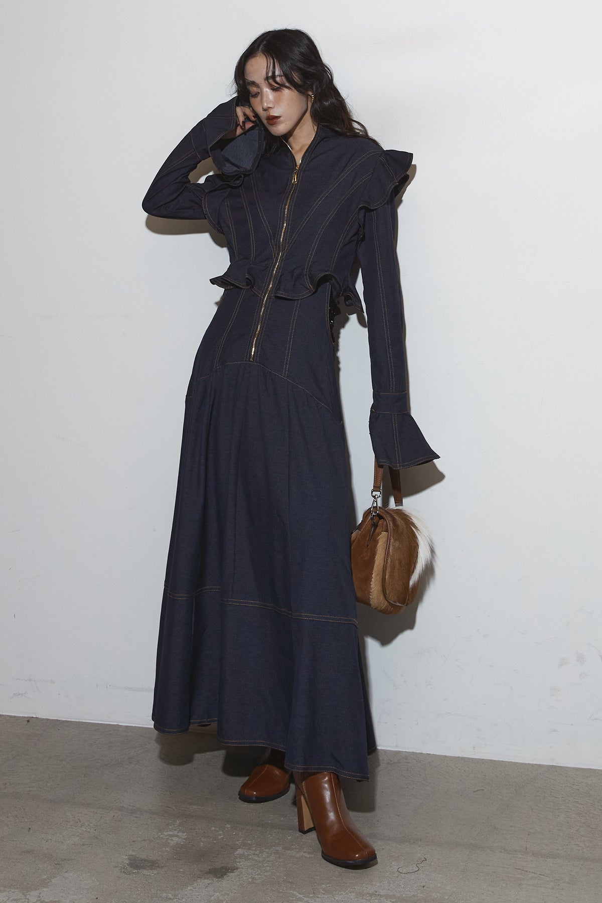 フロントジップとフリル切り替えがポイントのロングワンピース。ほどよく広がるシルエットで、デニムの表情が大人っぽく着られる一枚です。