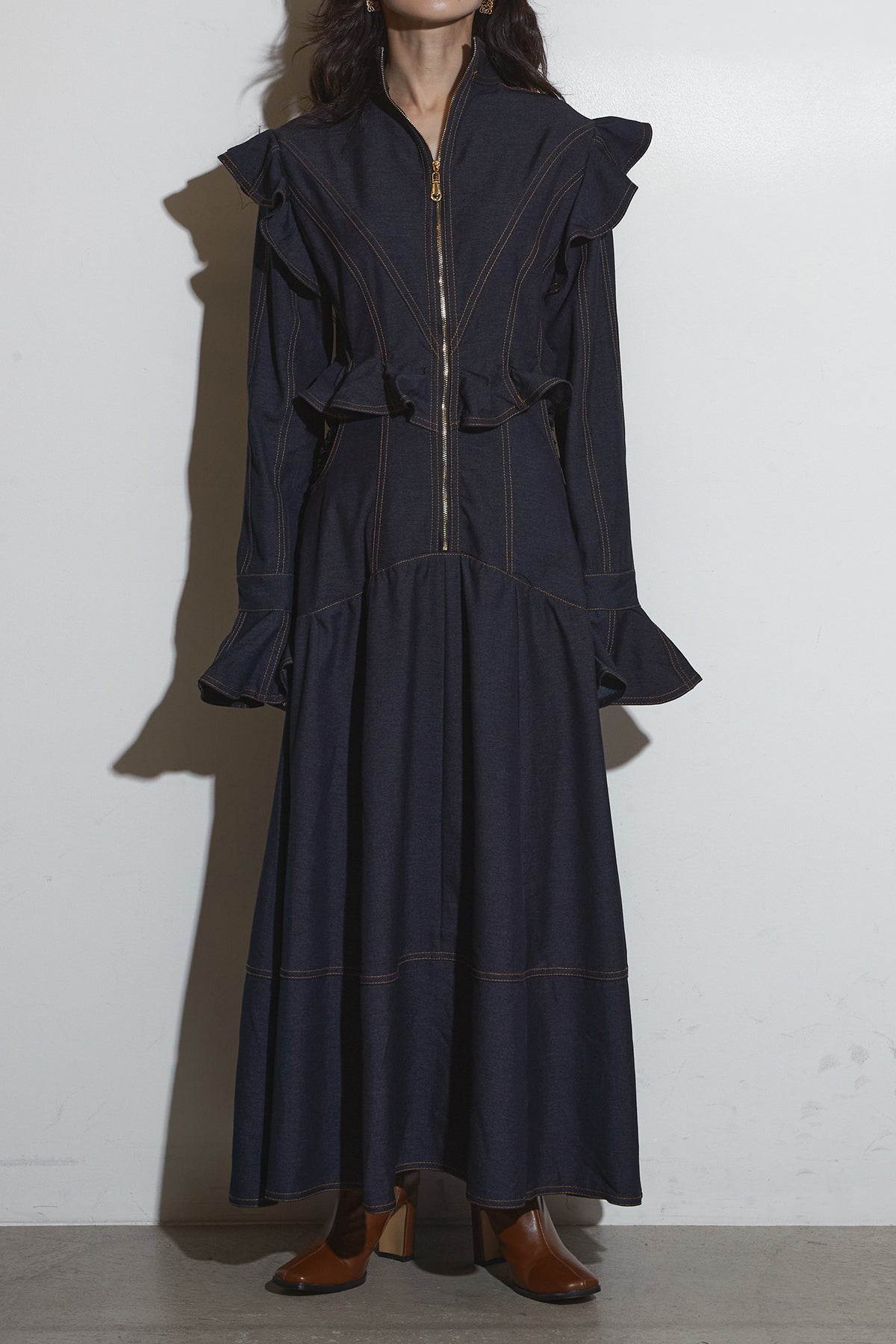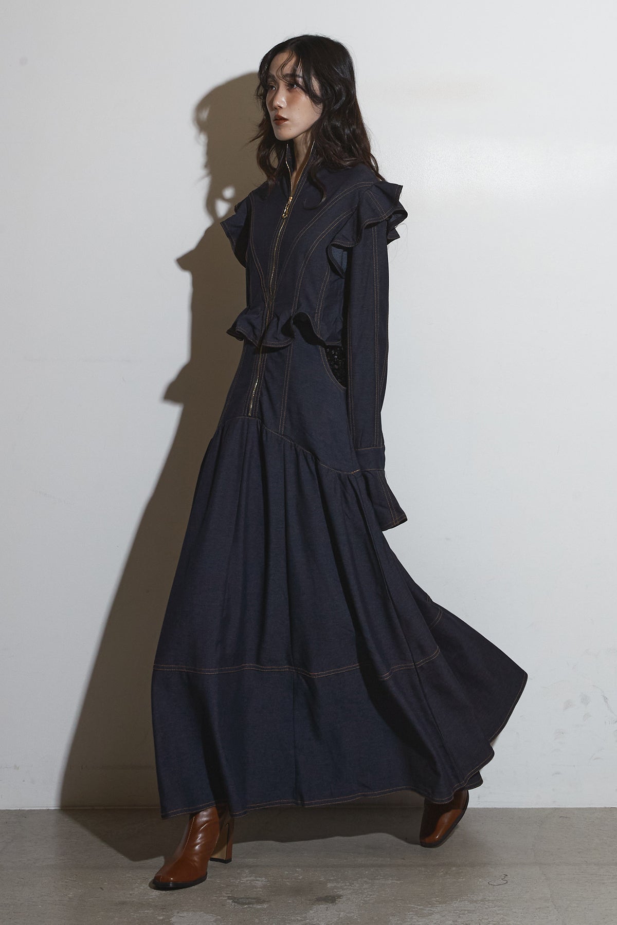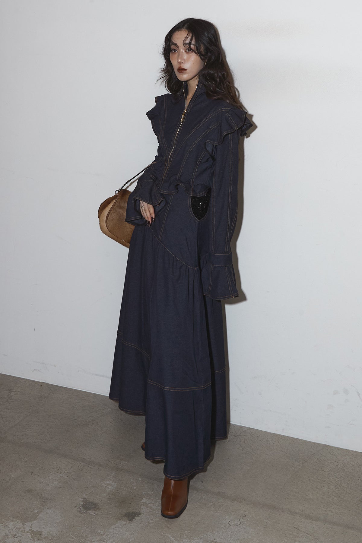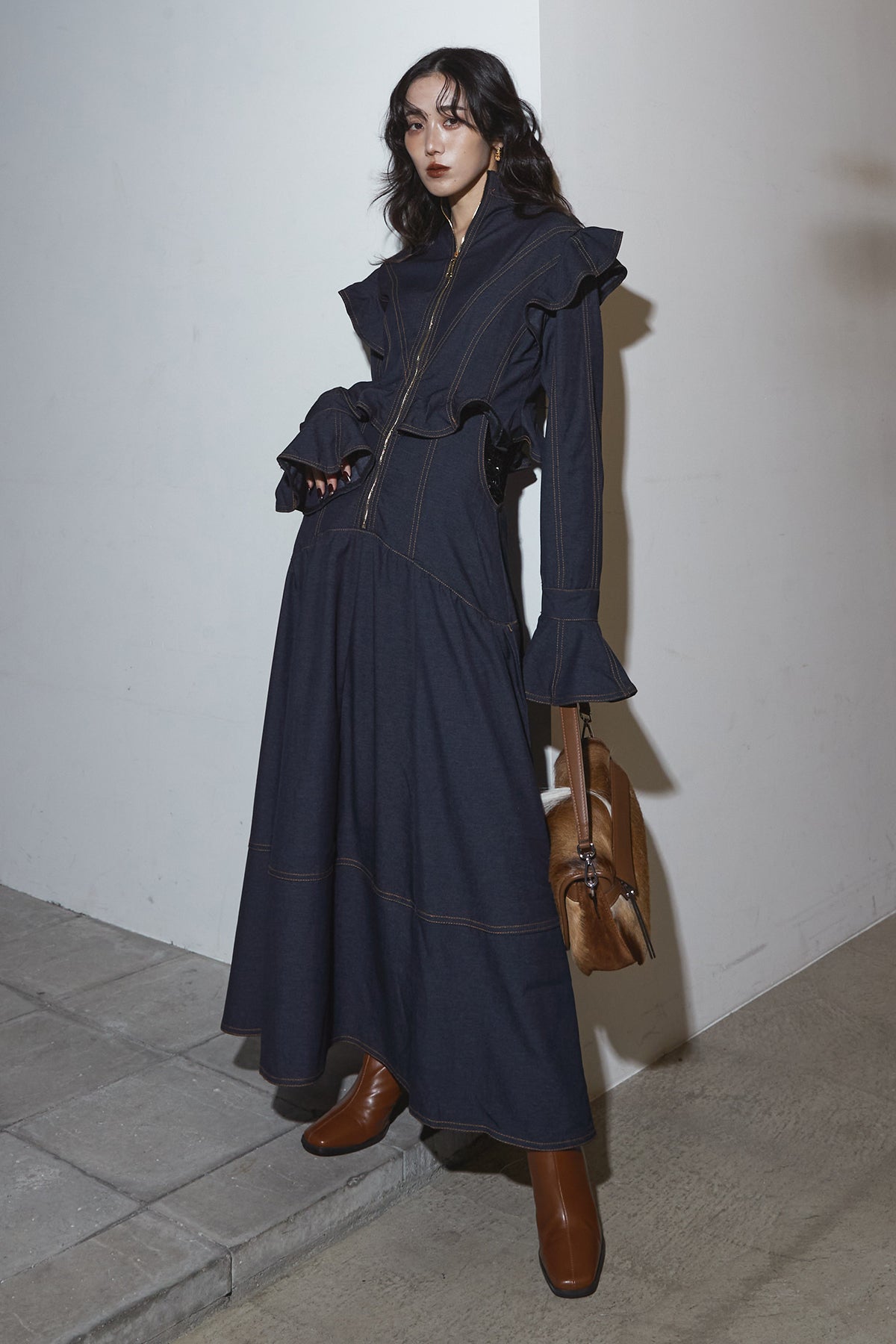 フロントジップとフリル切り替えがポイントのロングワンピース。ほどよく広がるシルエットで、デニムの表情が大人っぽく着られる一枚です。