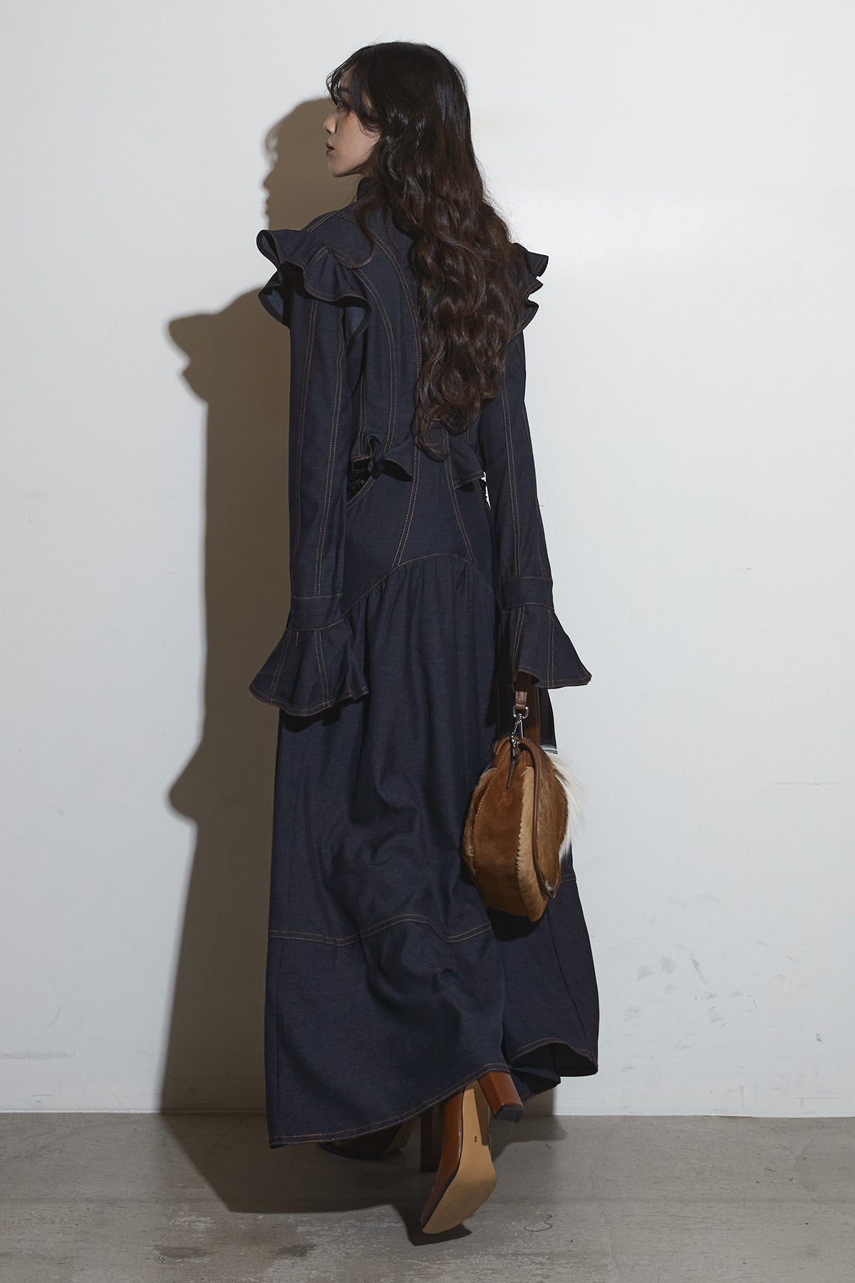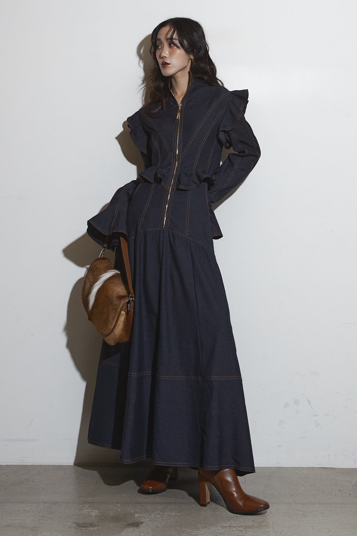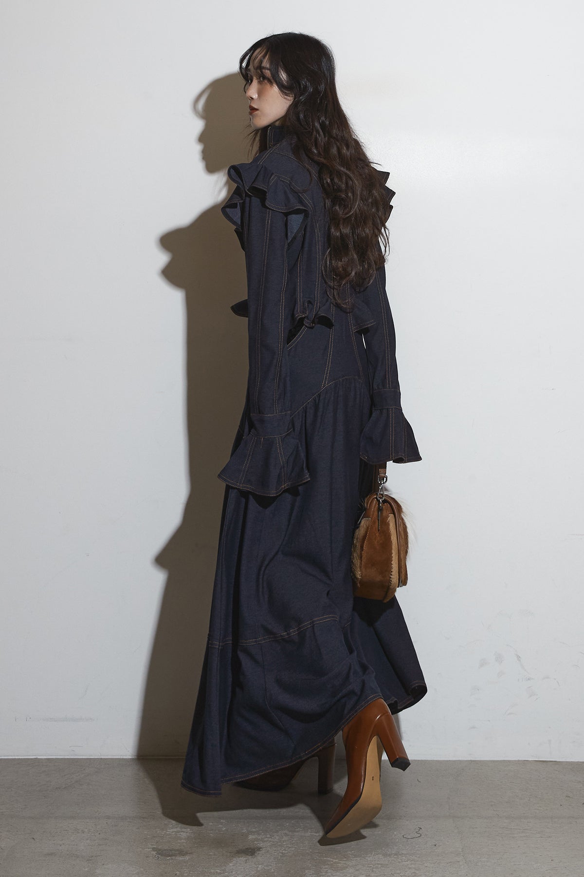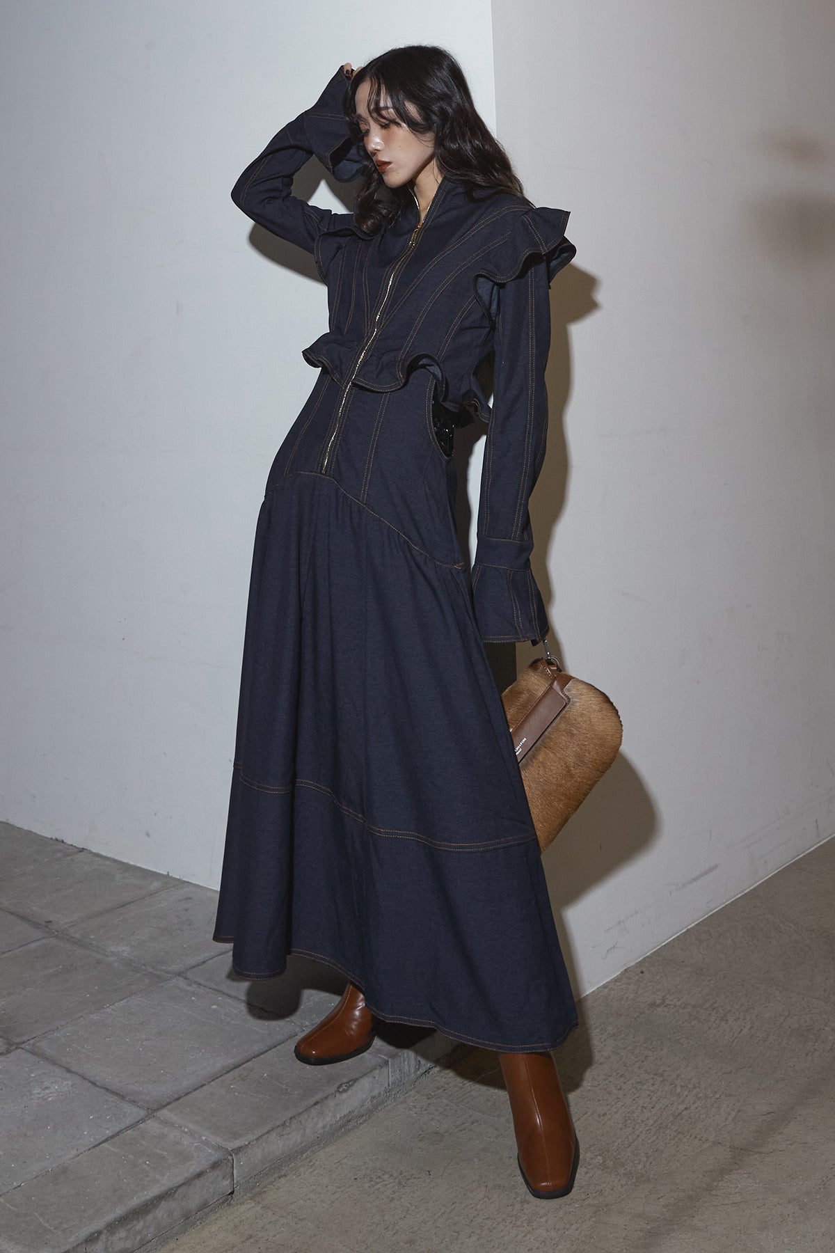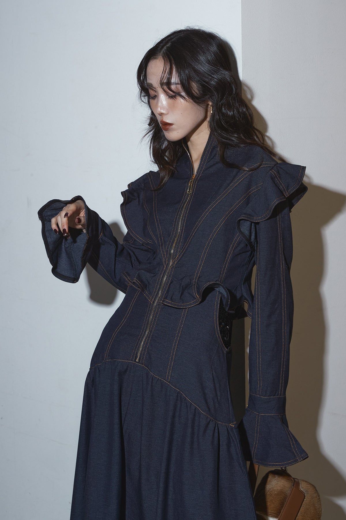 フロントジップとフリル切り替えがポイントのロングワンピース。ほどよく広がるシルエットで、デニムの表情が大人っぽく着られる一枚です。