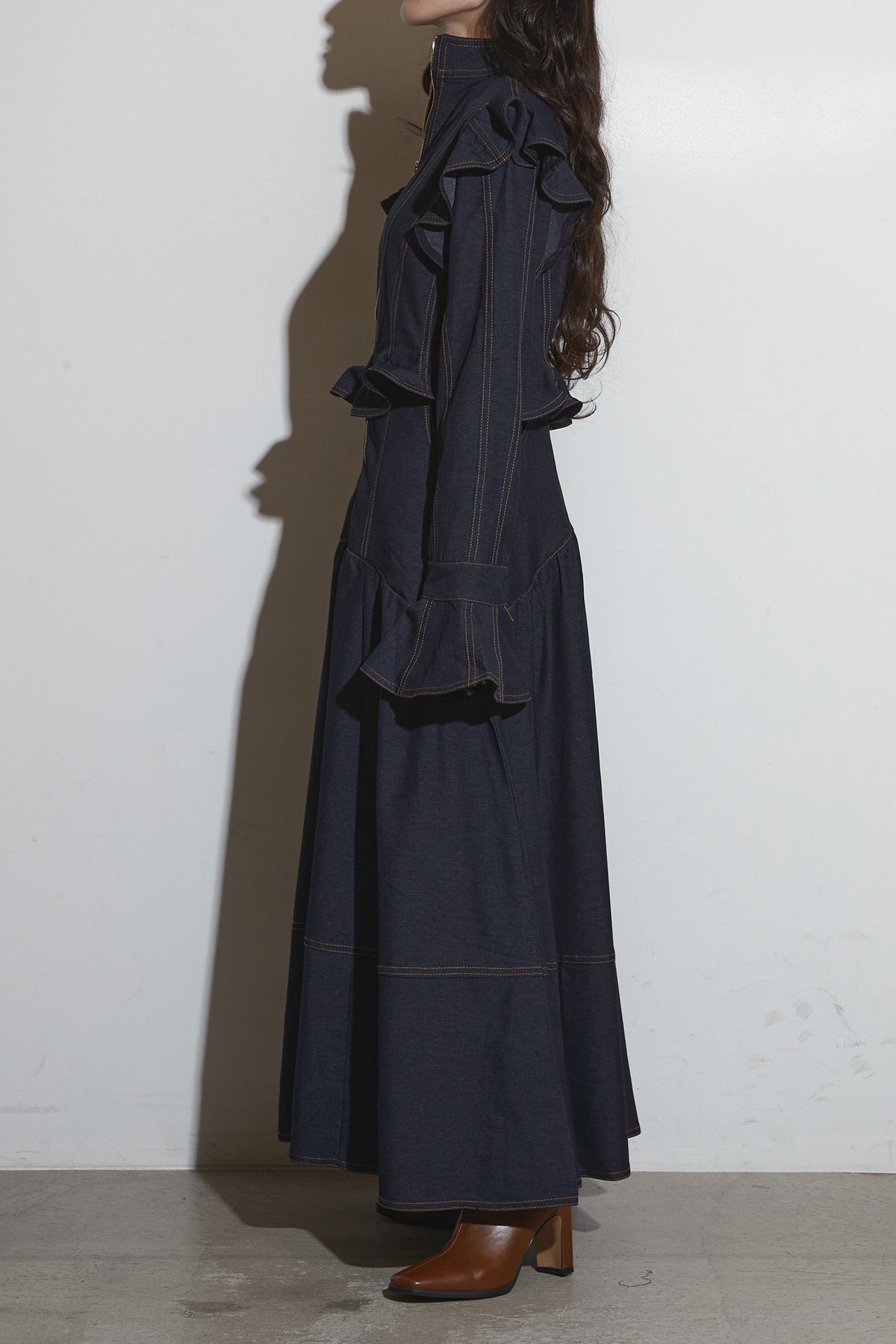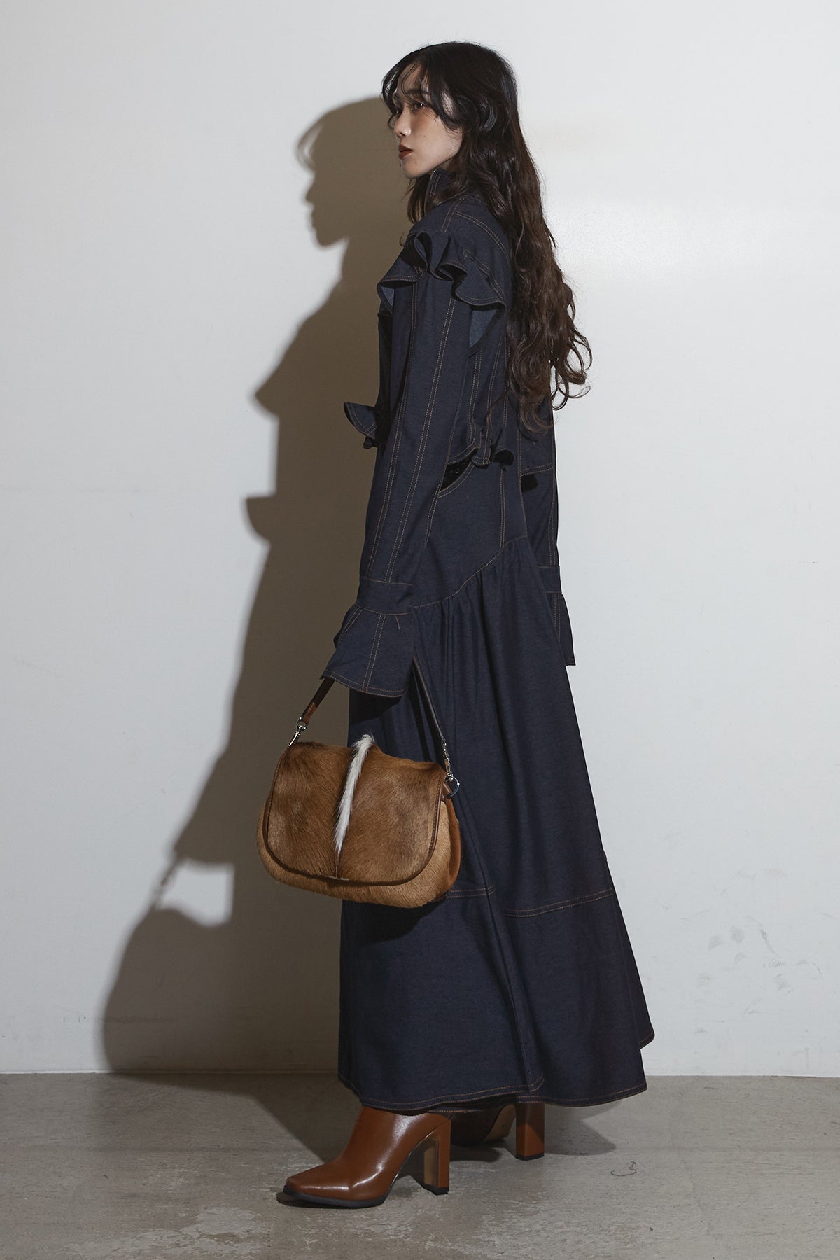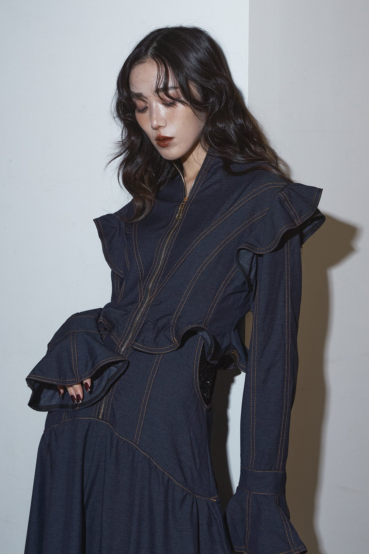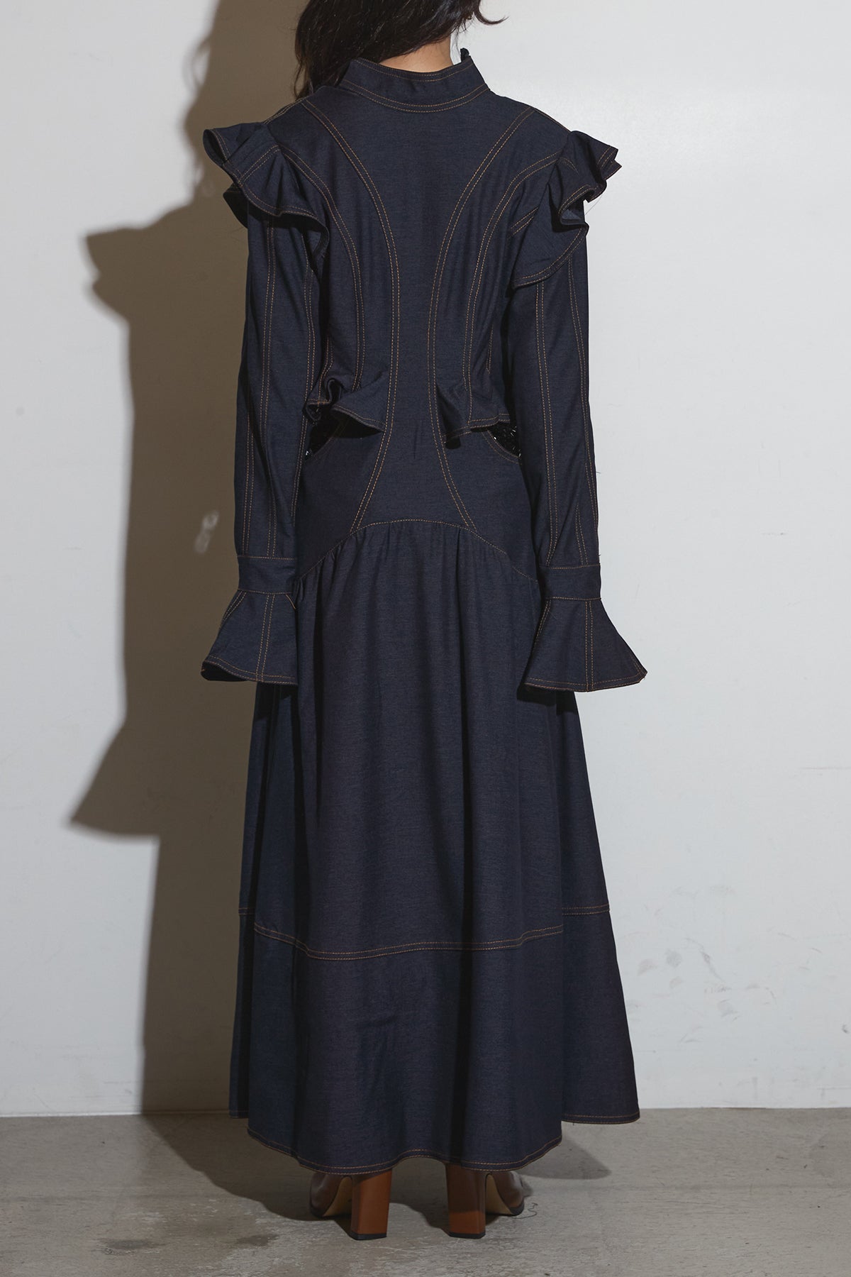 フロントジップとフリル切り替えがポイントのロングワンピース。ほどよく広がるシルエットで、デニムの表情が大人っぽく着られる一枚です。