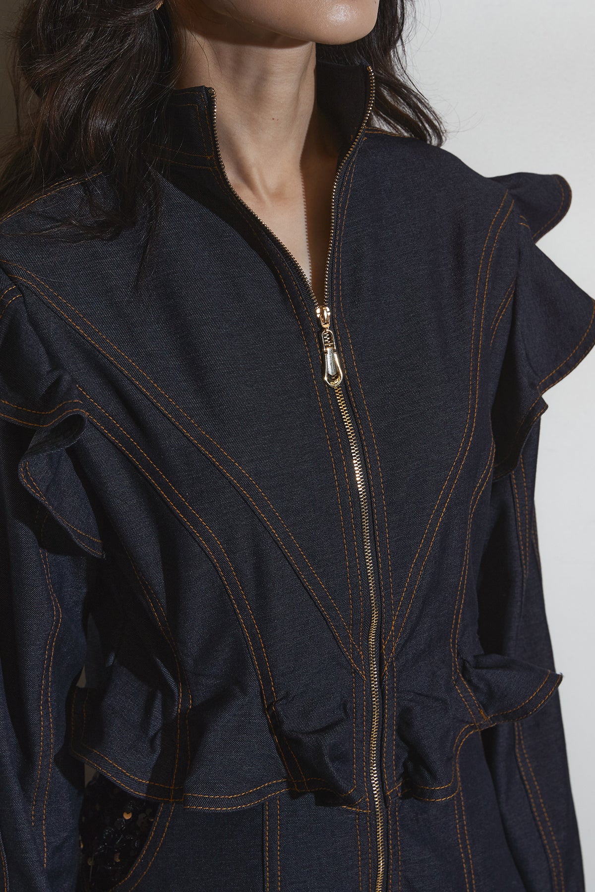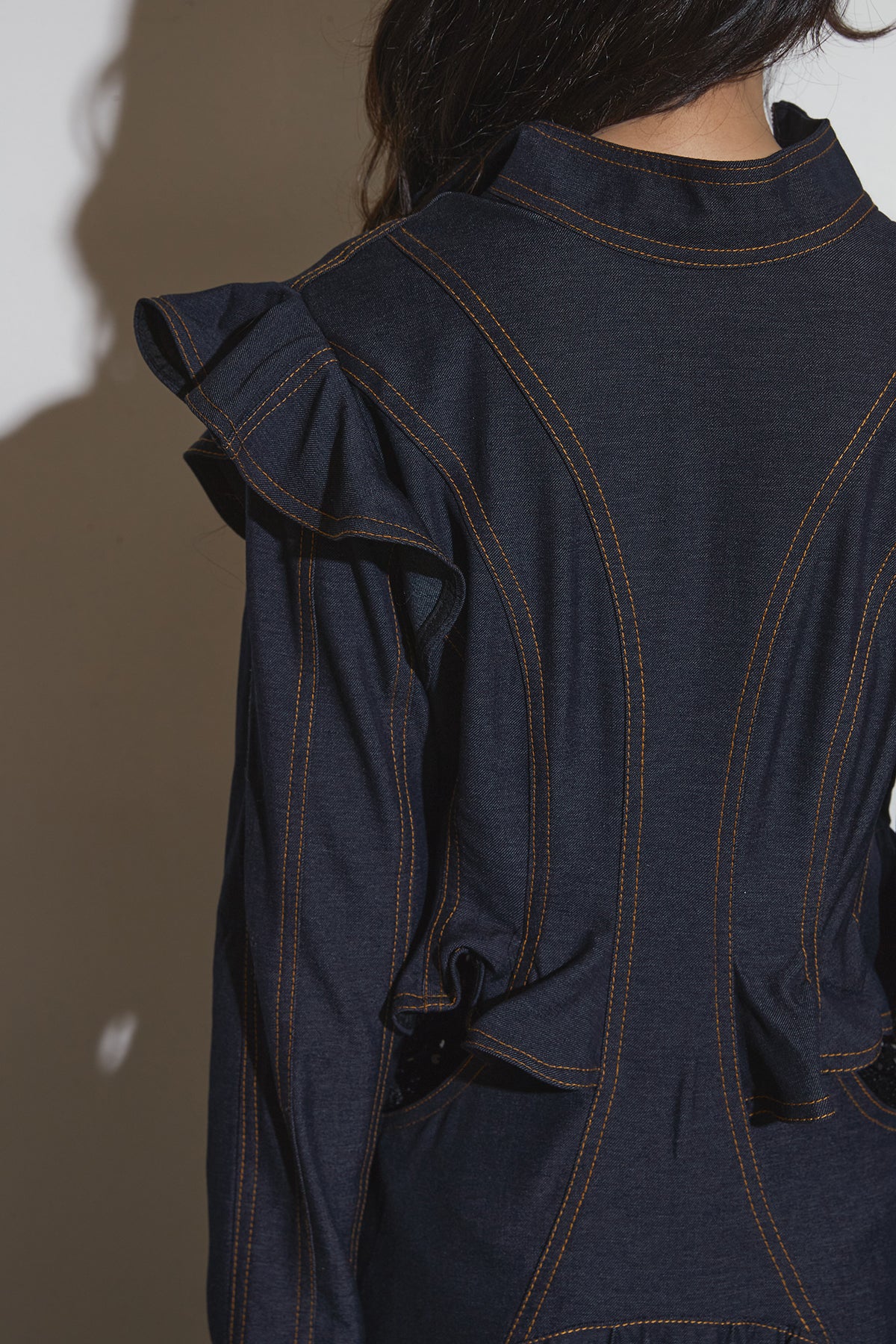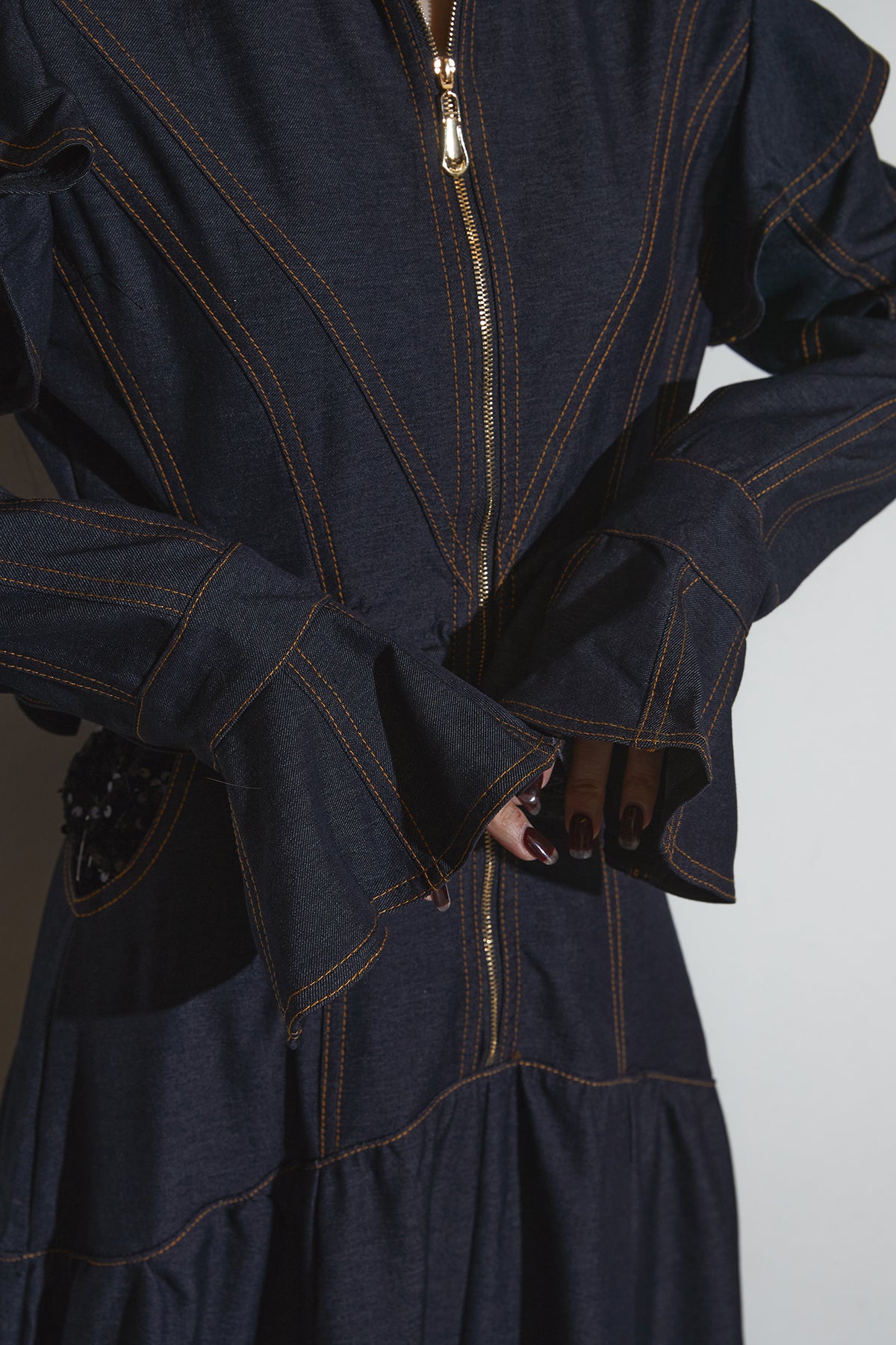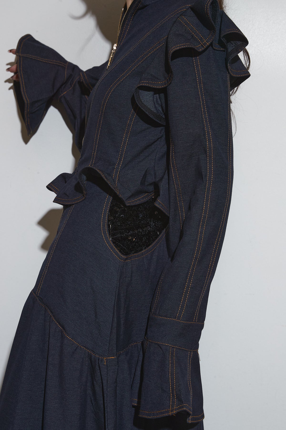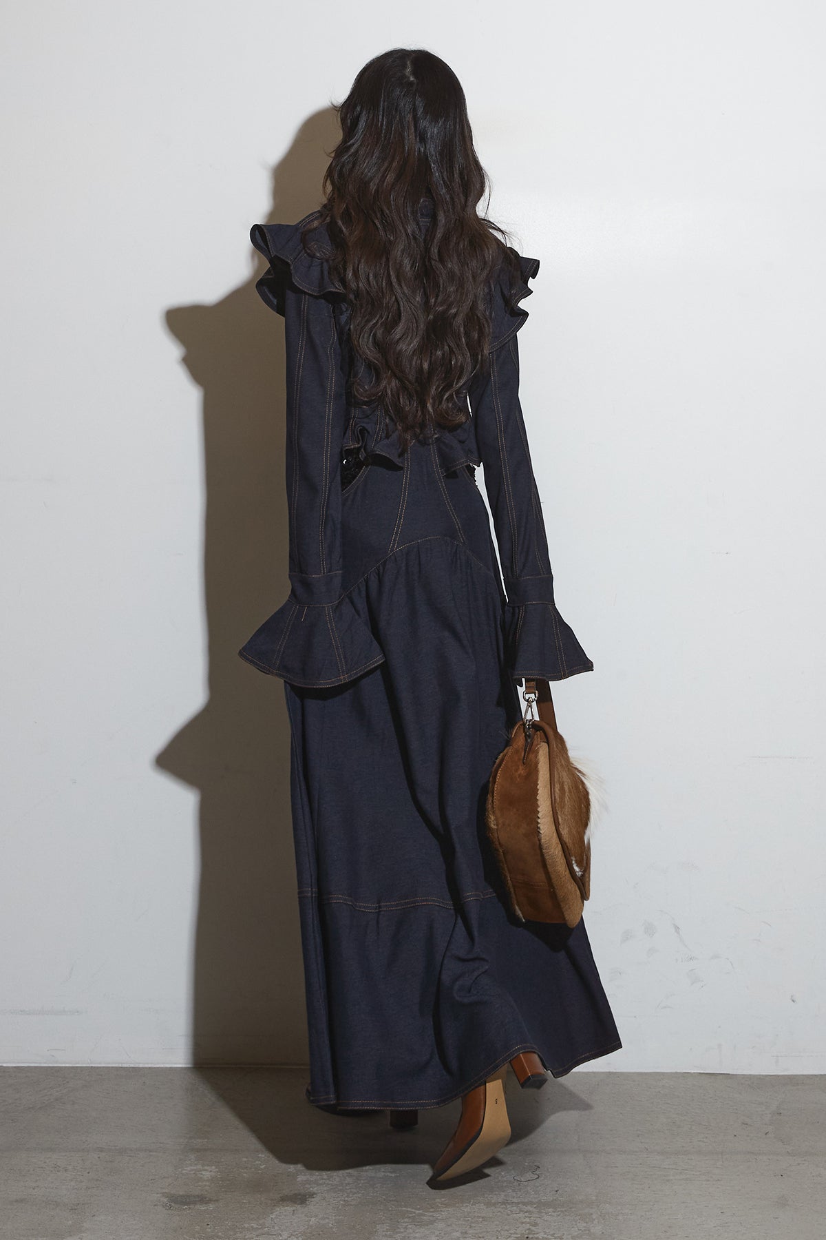 フロントジップとフリル切り替えがポイントのロングワンピース。ほどよく広がるシルエットで、デニムの表情が大人っぽく着られる一枚です。