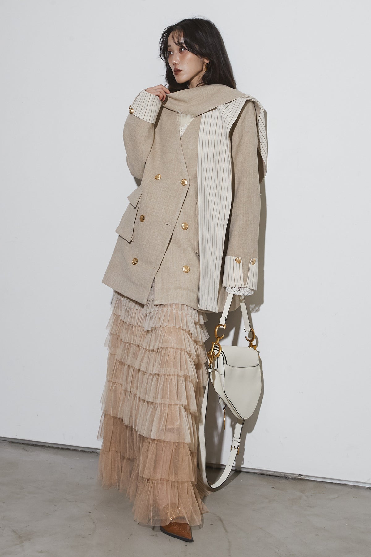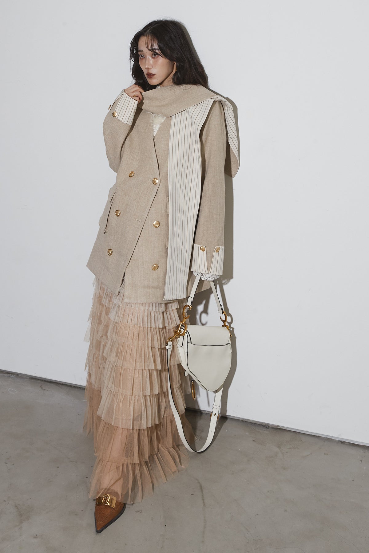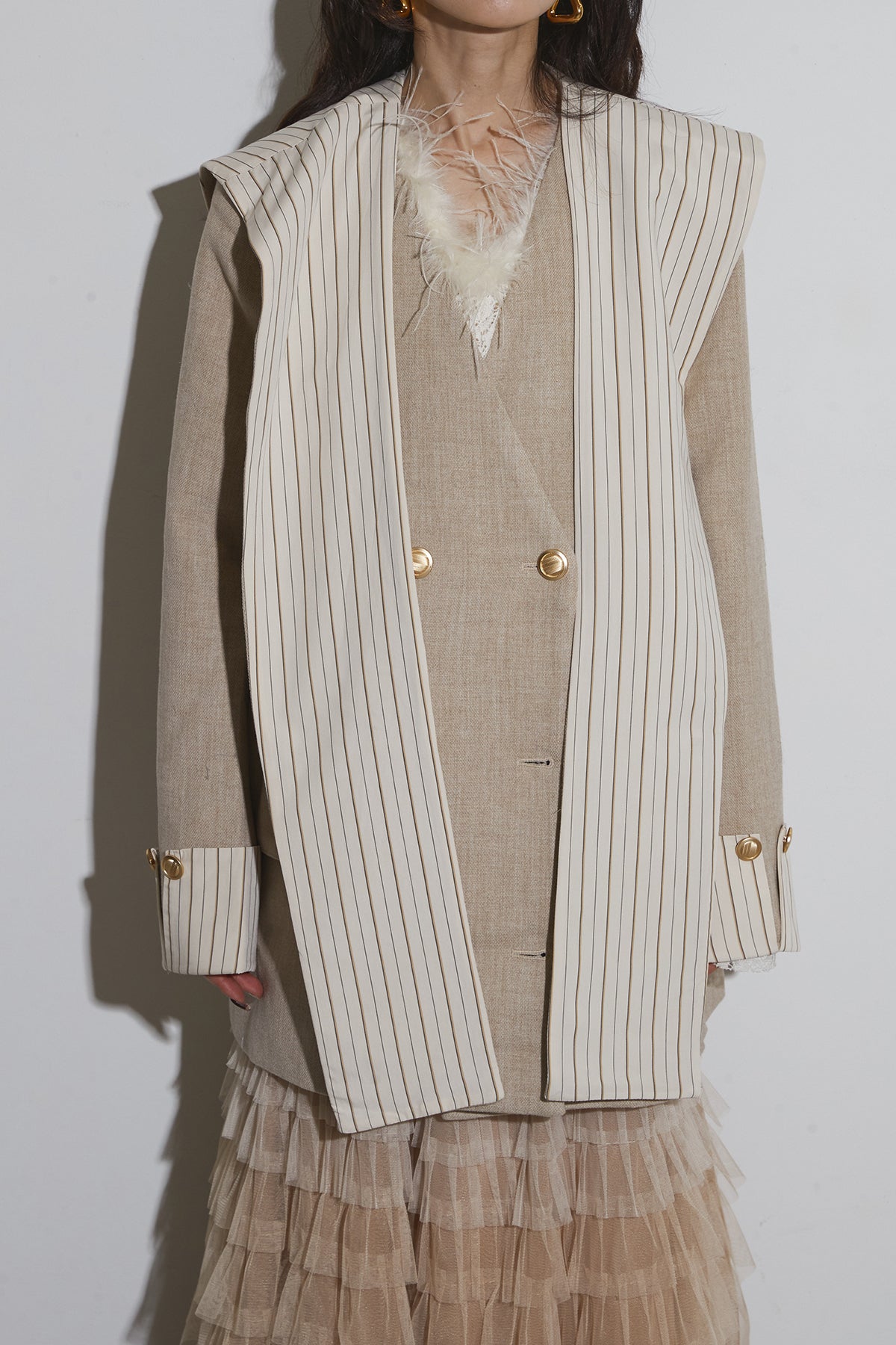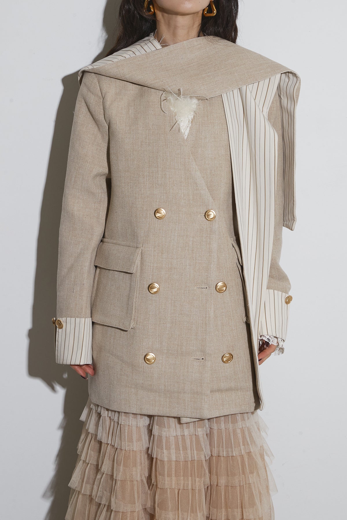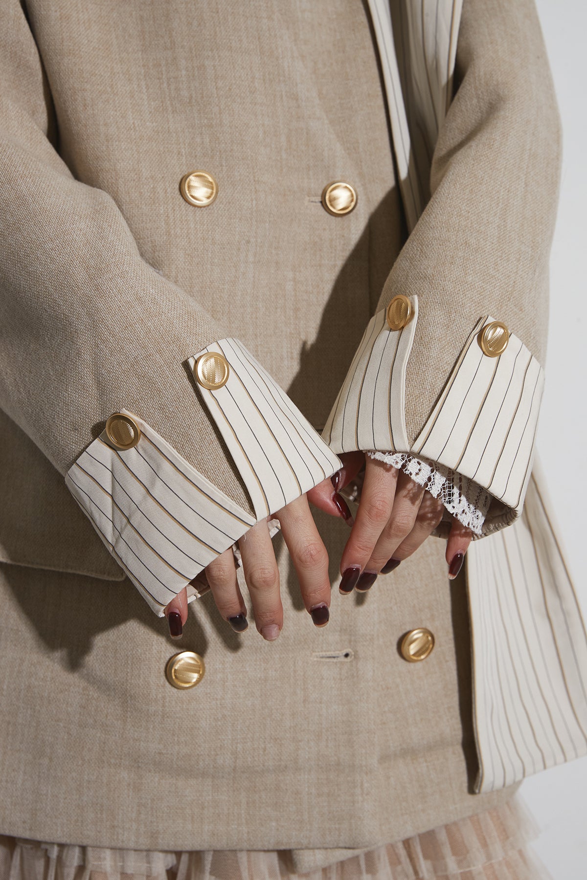 構築的なシルエットが魅力のジャケットは、ダブルボタンのクラシックなデザインに遊び心あるショルダーアクセントを組み合わせ、さらりと羽織るだけでモード感を引き立てる一着です。