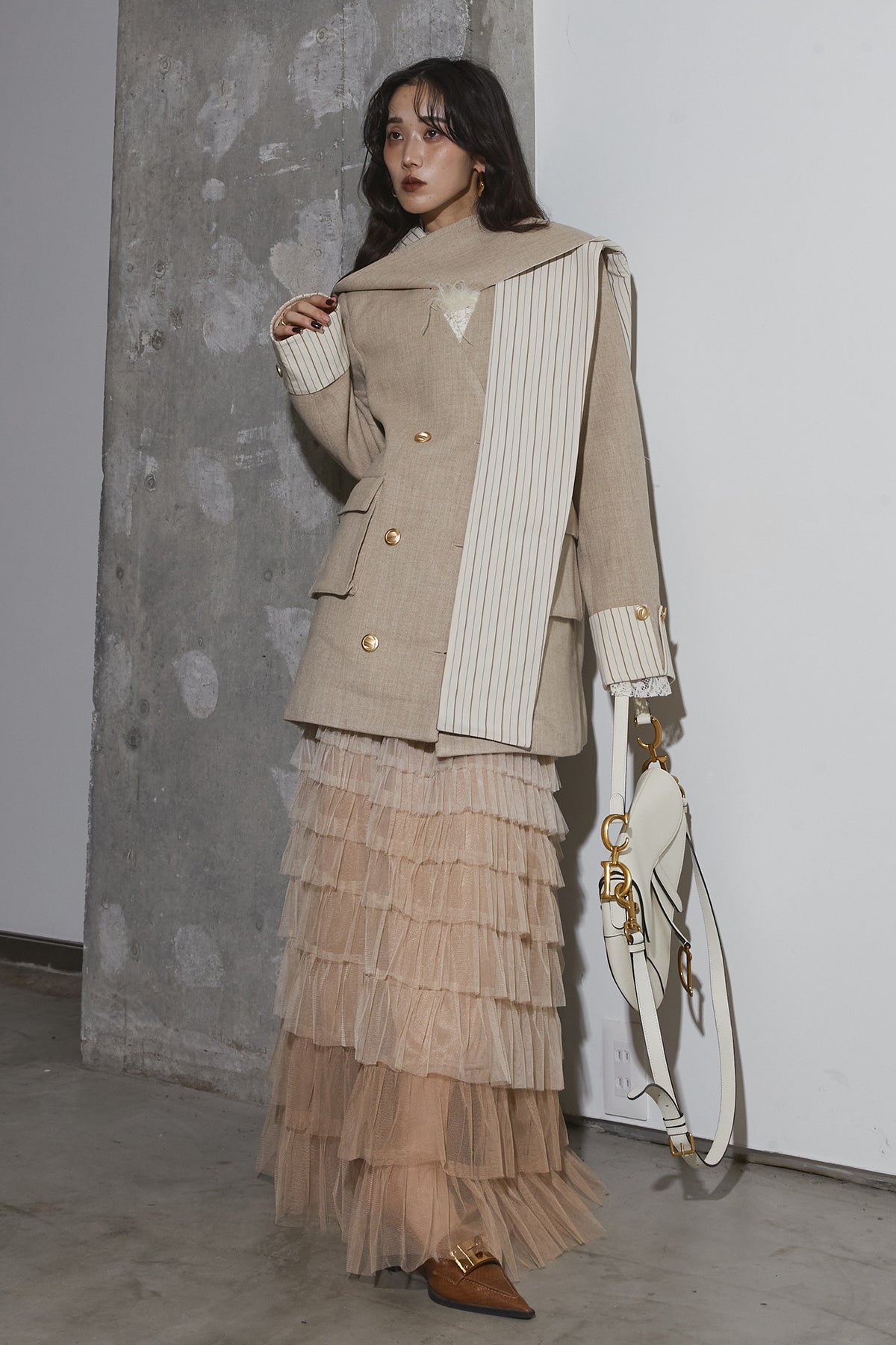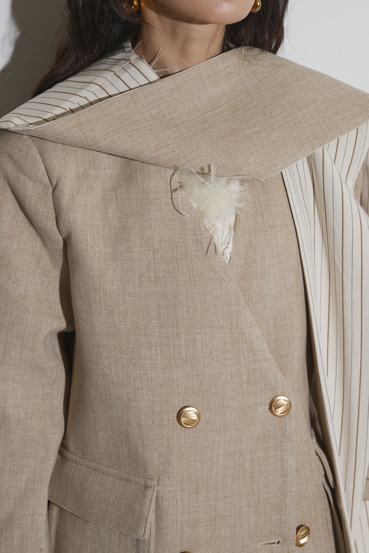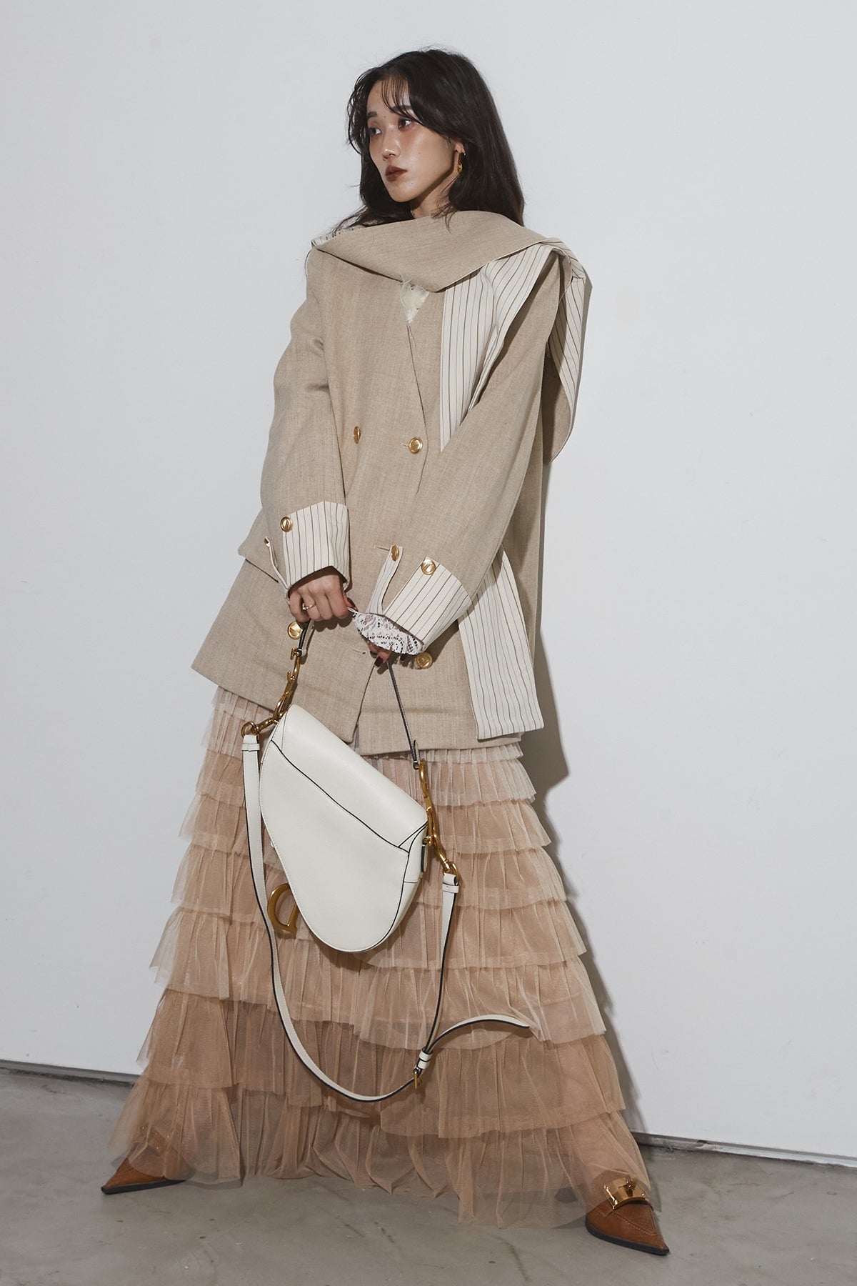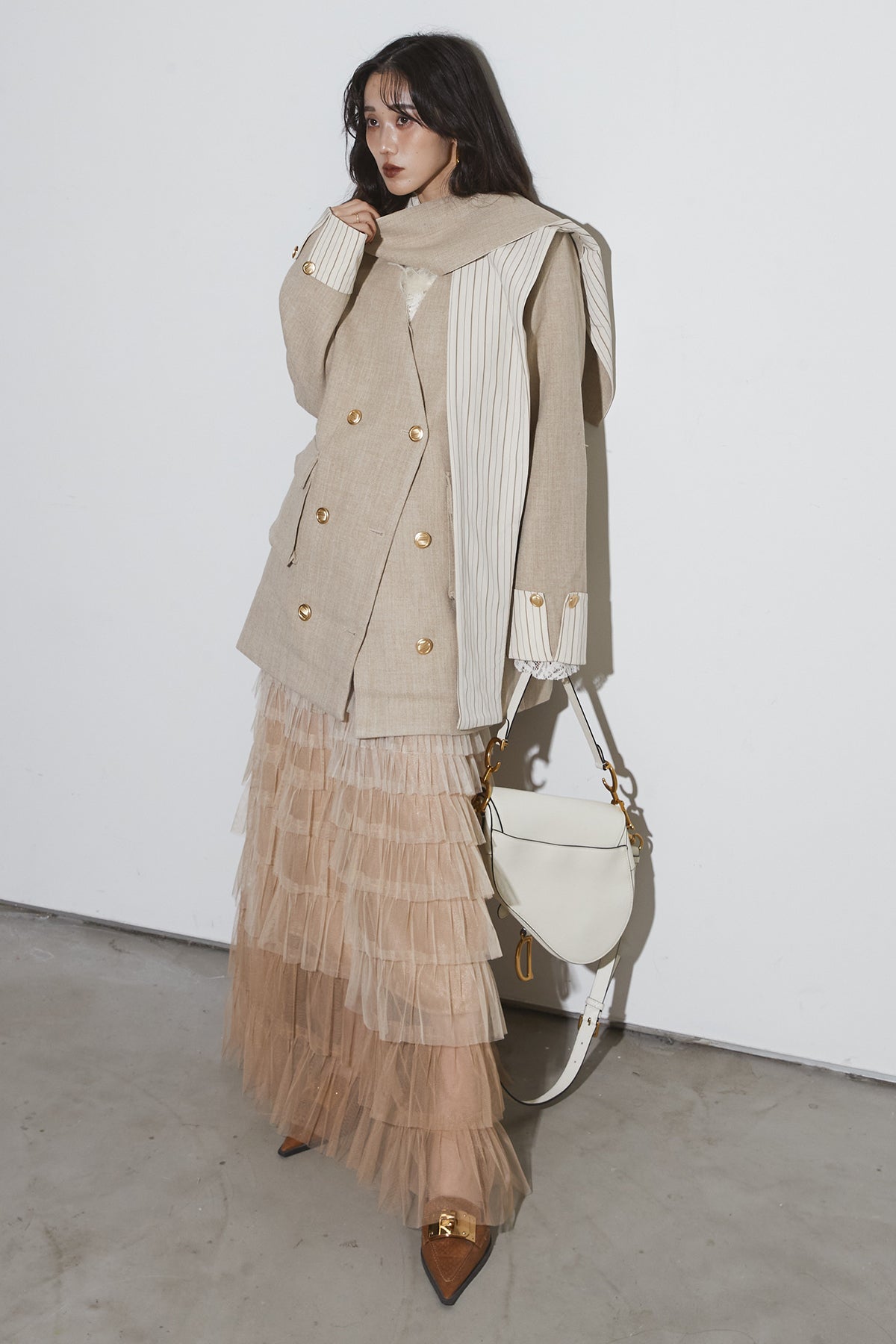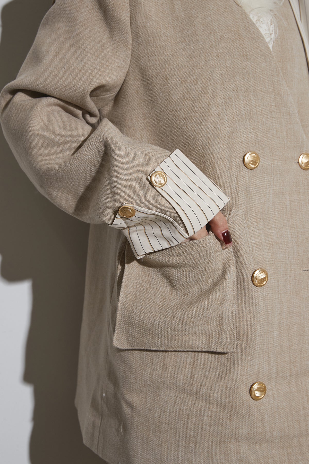構築的なシルエットが魅力のジャケットは、ダブルボタンのクラシックなデザインに遊び心あるショルダーアクセントを組み合わせ、さらりと羽織るだけでモード感を引き立てる一着です。