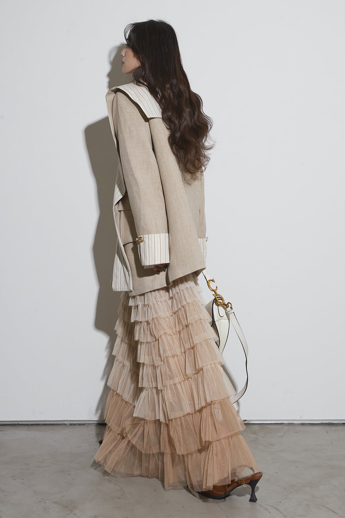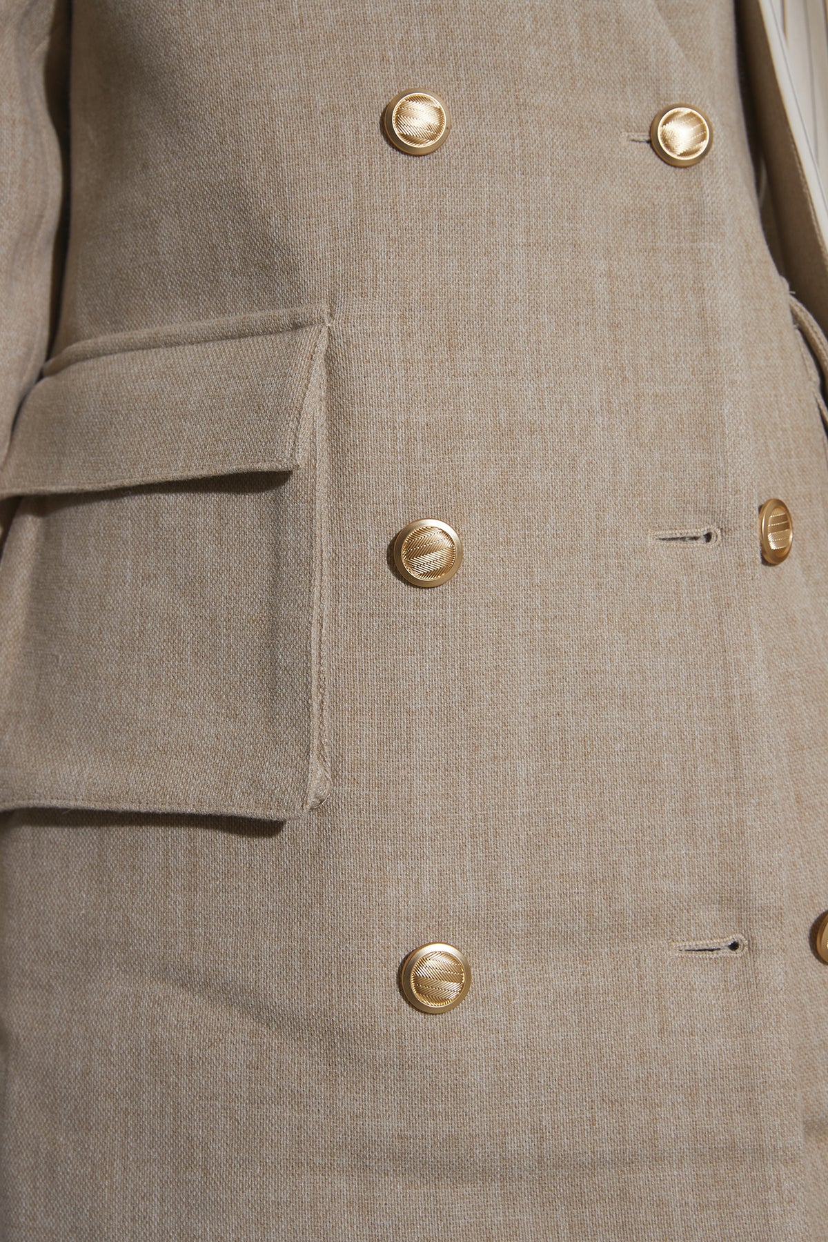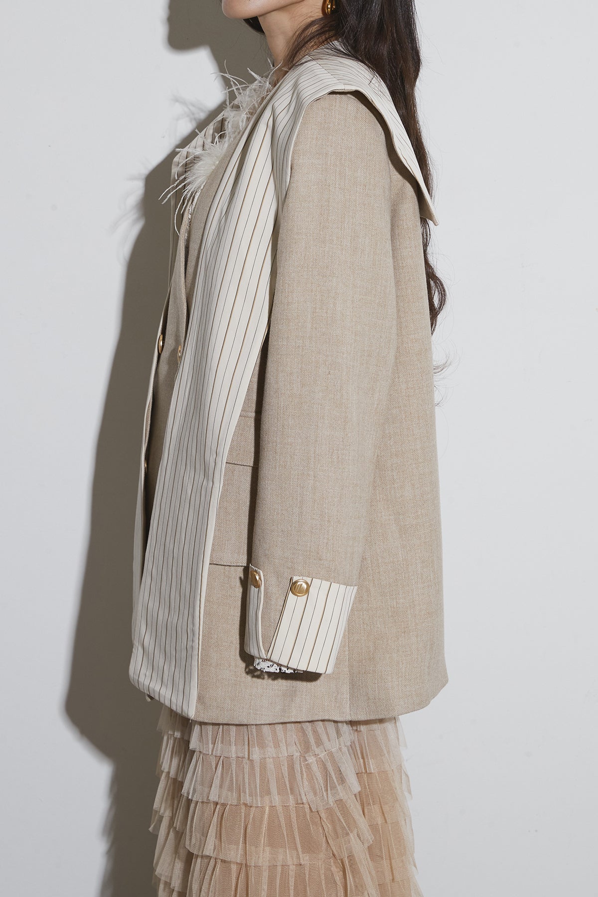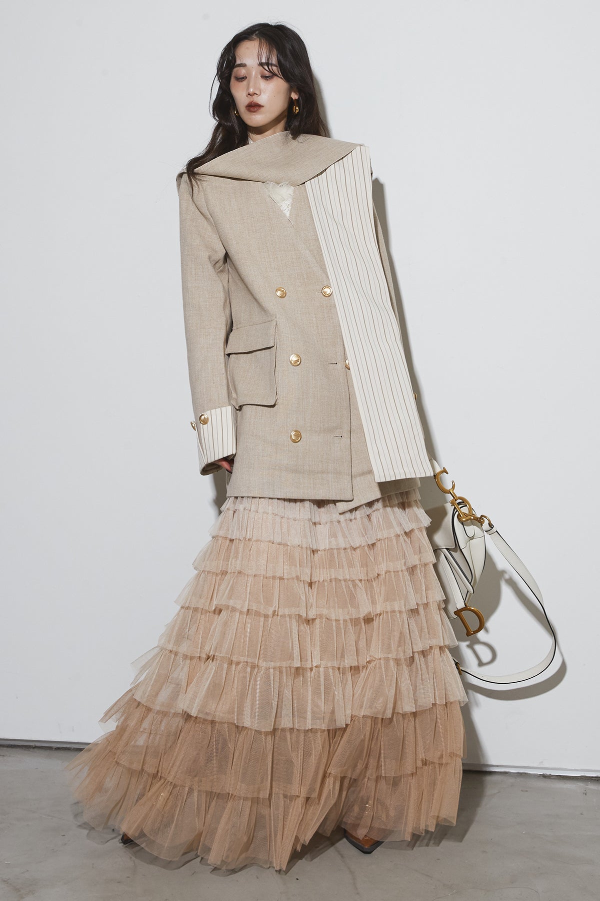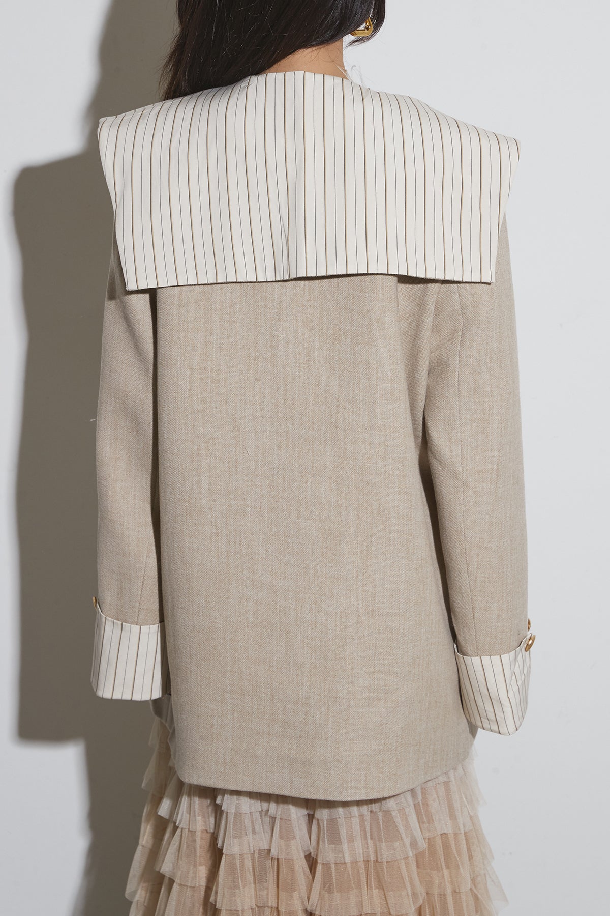 構築的なシルエットが魅力のジャケットは、ダブルボタンのクラシックなデザインに遊び心あるショルダーアクセントを組み合わせ、さらりと羽織るだけでモード感を引き立てる一着です。