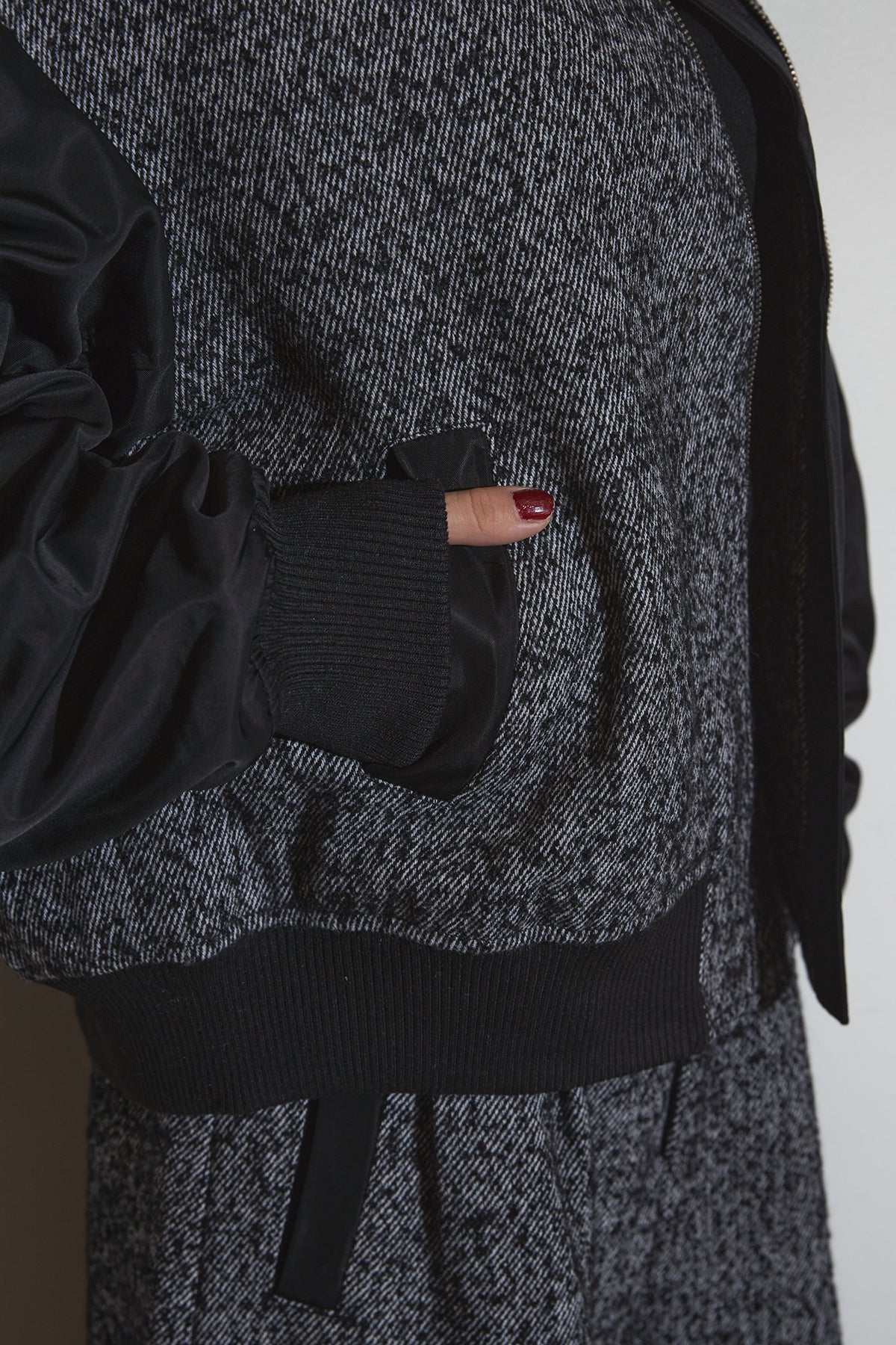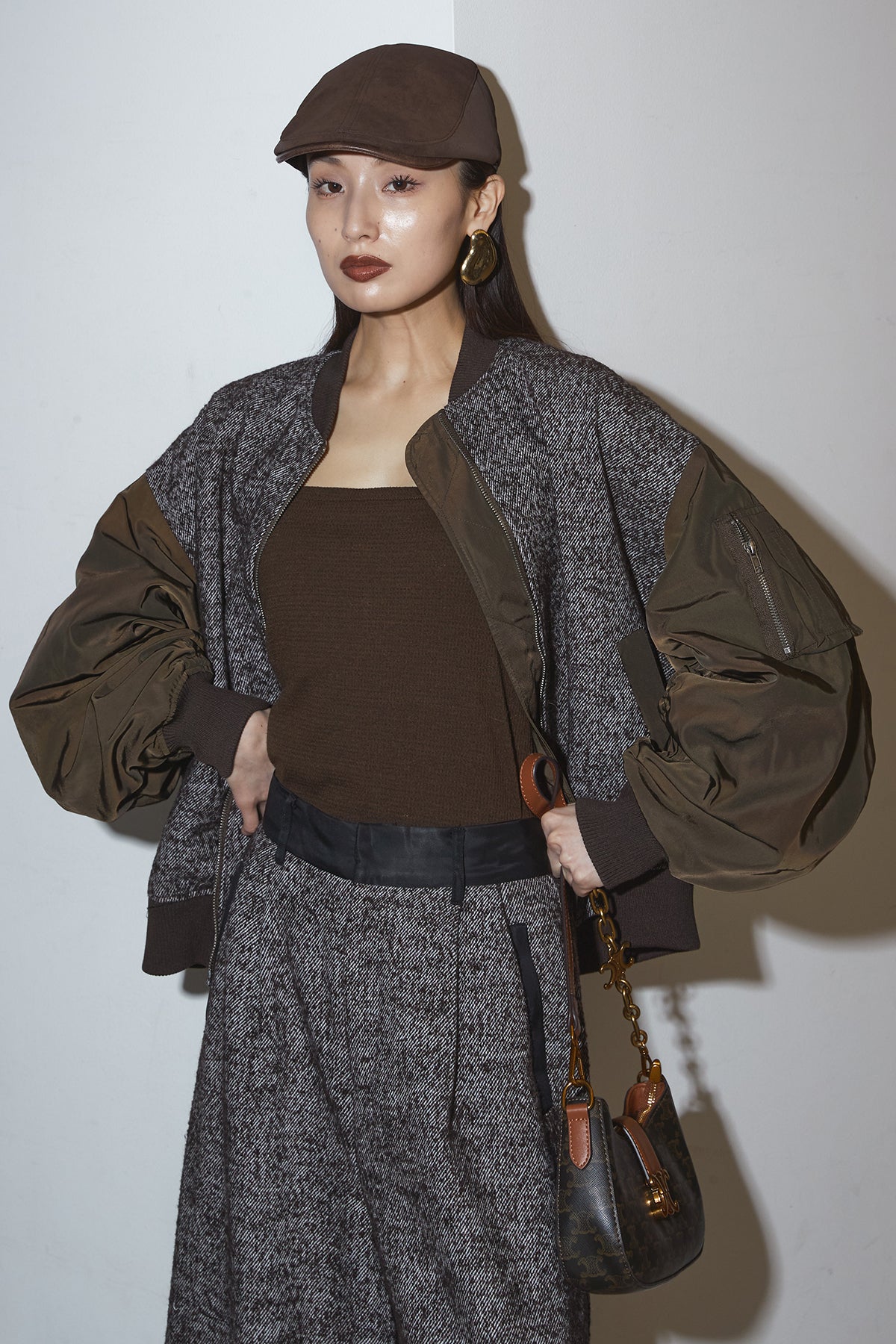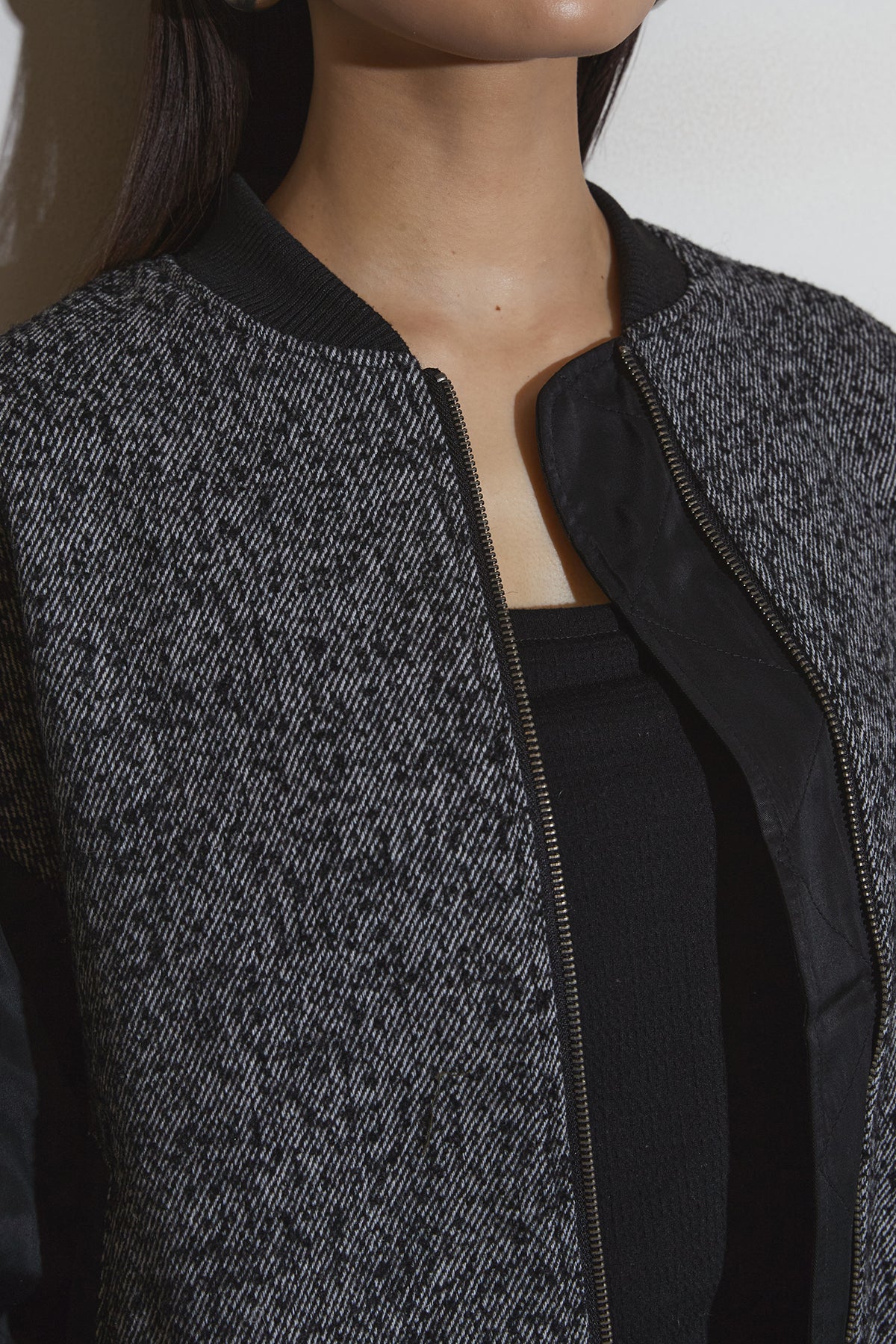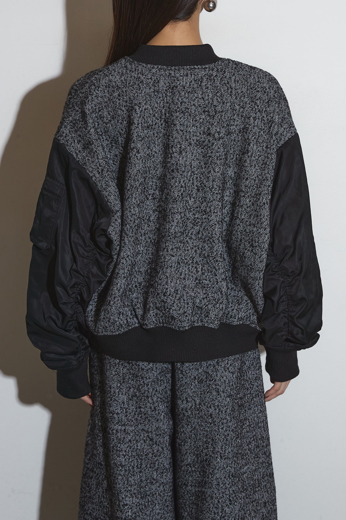ご注文前に必ずページ下部「お届け期間」をご確認くださいませ。異素材切り替えのデザインが印象的なジャケット。身頃は表情のあるテクスチャー生地、袖は滑らかな質感の素材で切り替えられ、ほどよいボリューム感がアウターとしての存在感を引き立てます。フロントはジップ開閉で、カジュアルにもモードにも合わせやすい一枚。