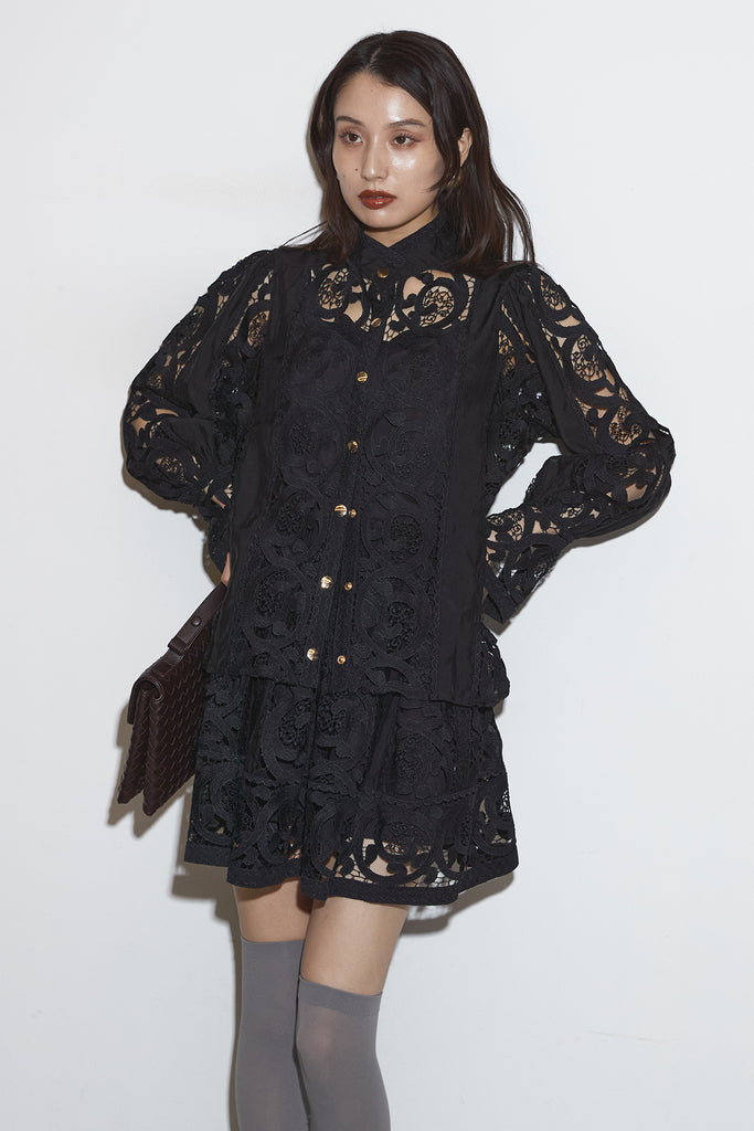 【SET】ビジューエンブロイダリーカーデ+レザーIラインスカート