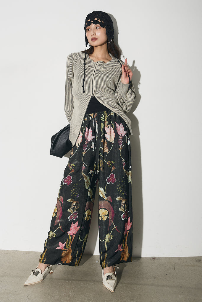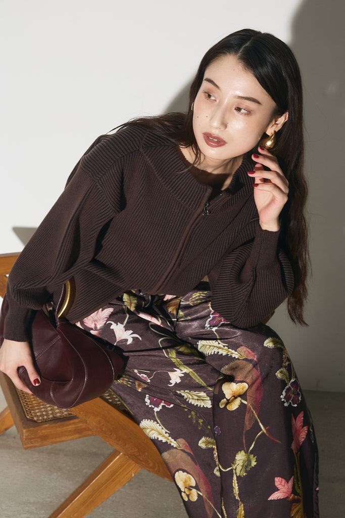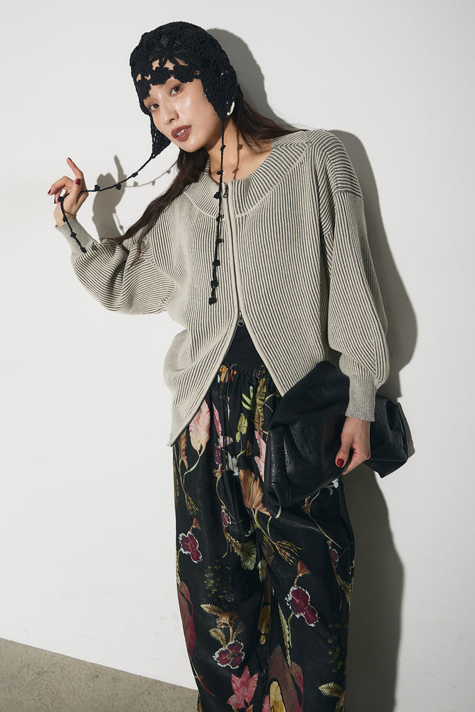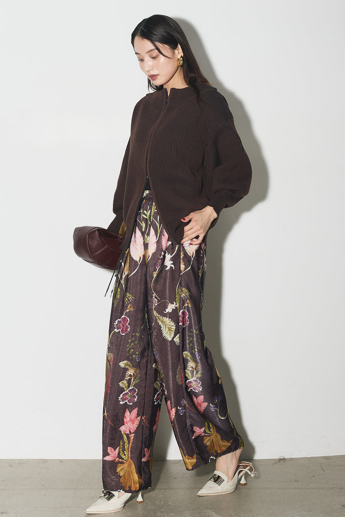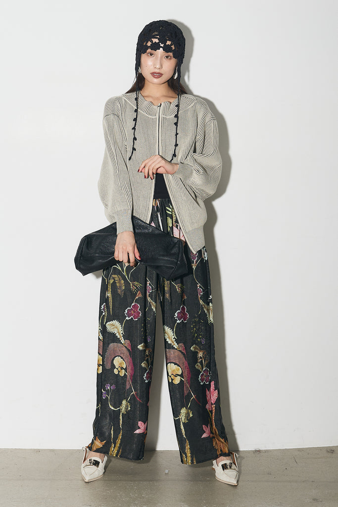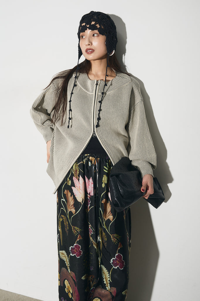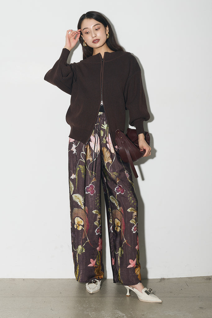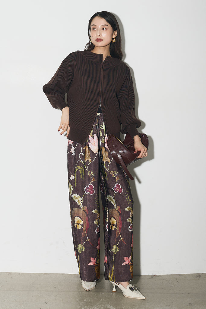 【SET】配色リブジップニット+ボタニカルリラックスパンツ