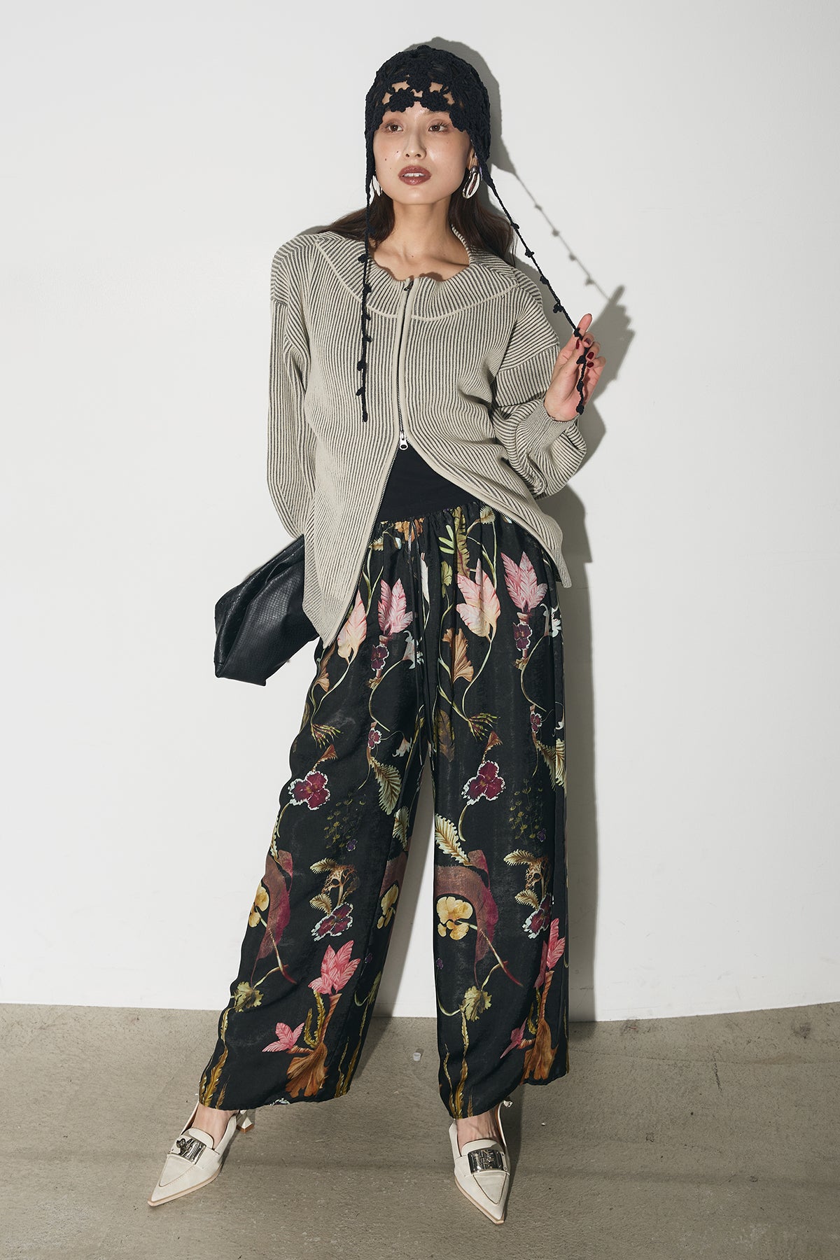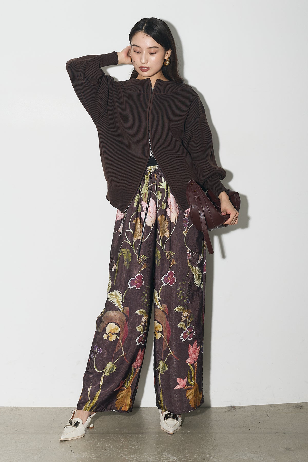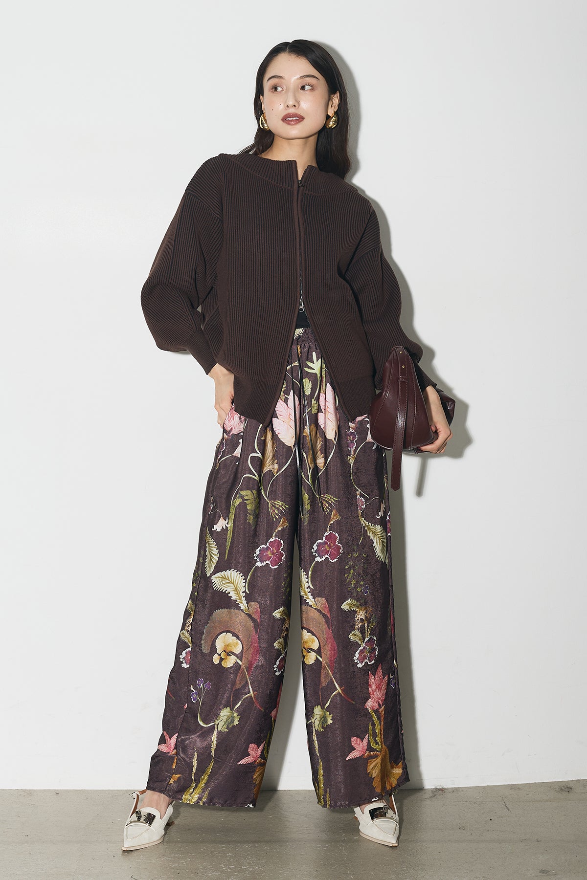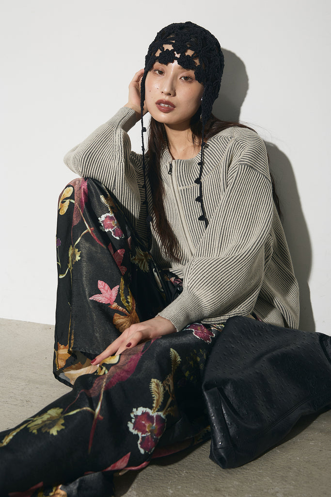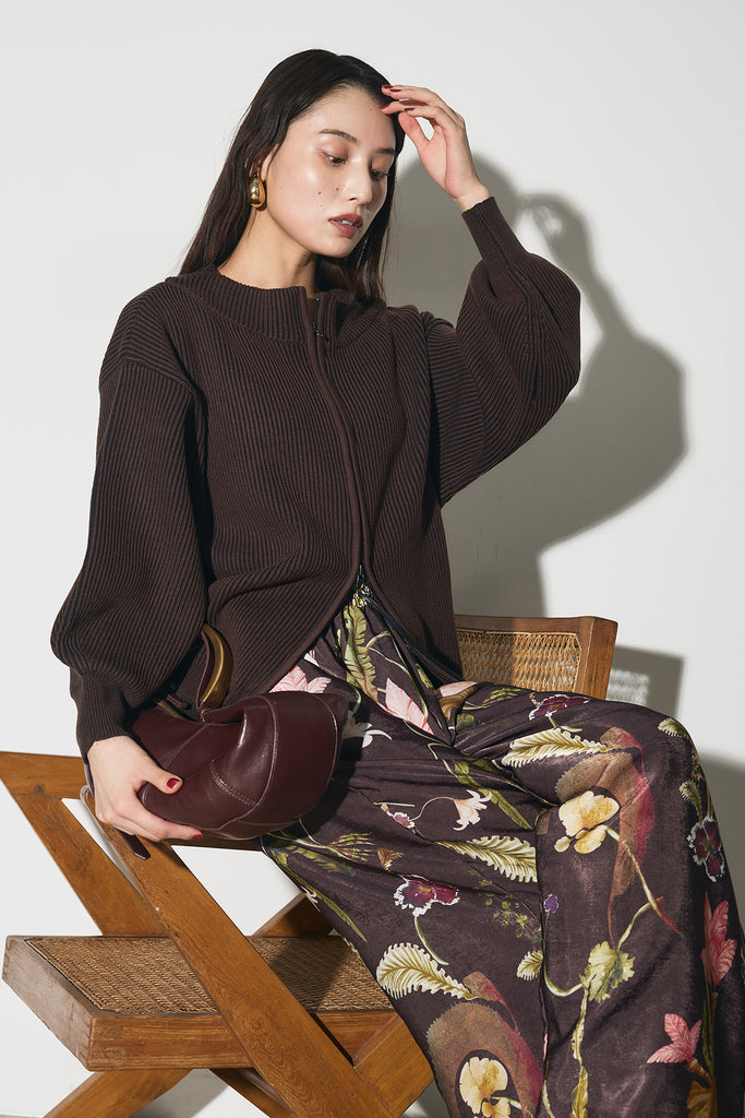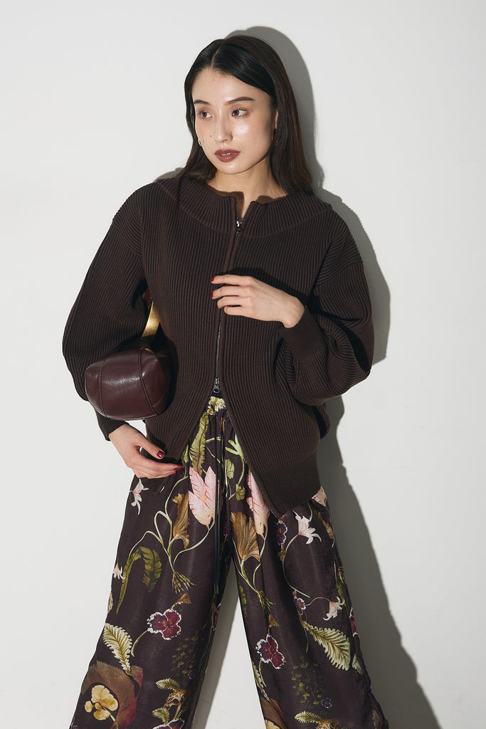 【SET】配色リブジップニット+ボタニカルリラックスパンツ