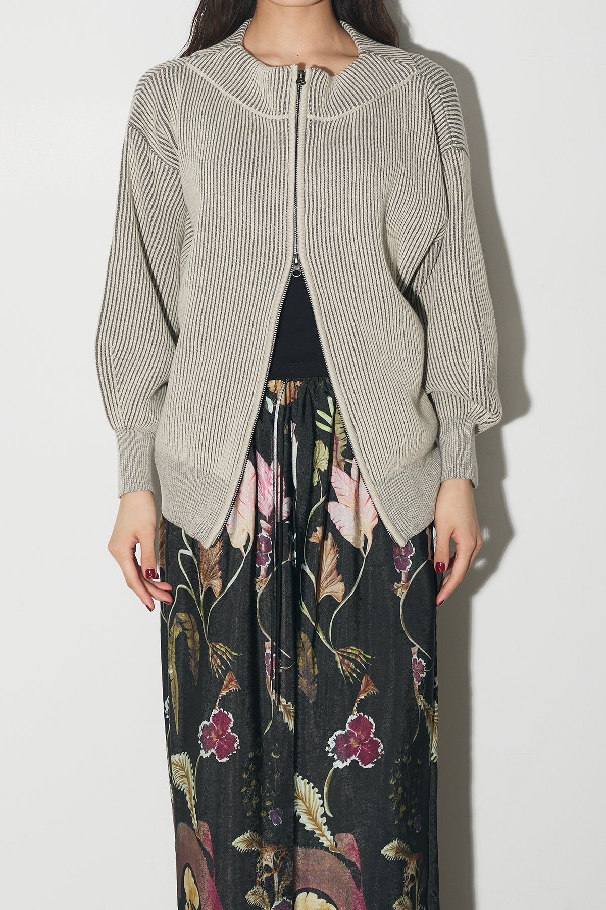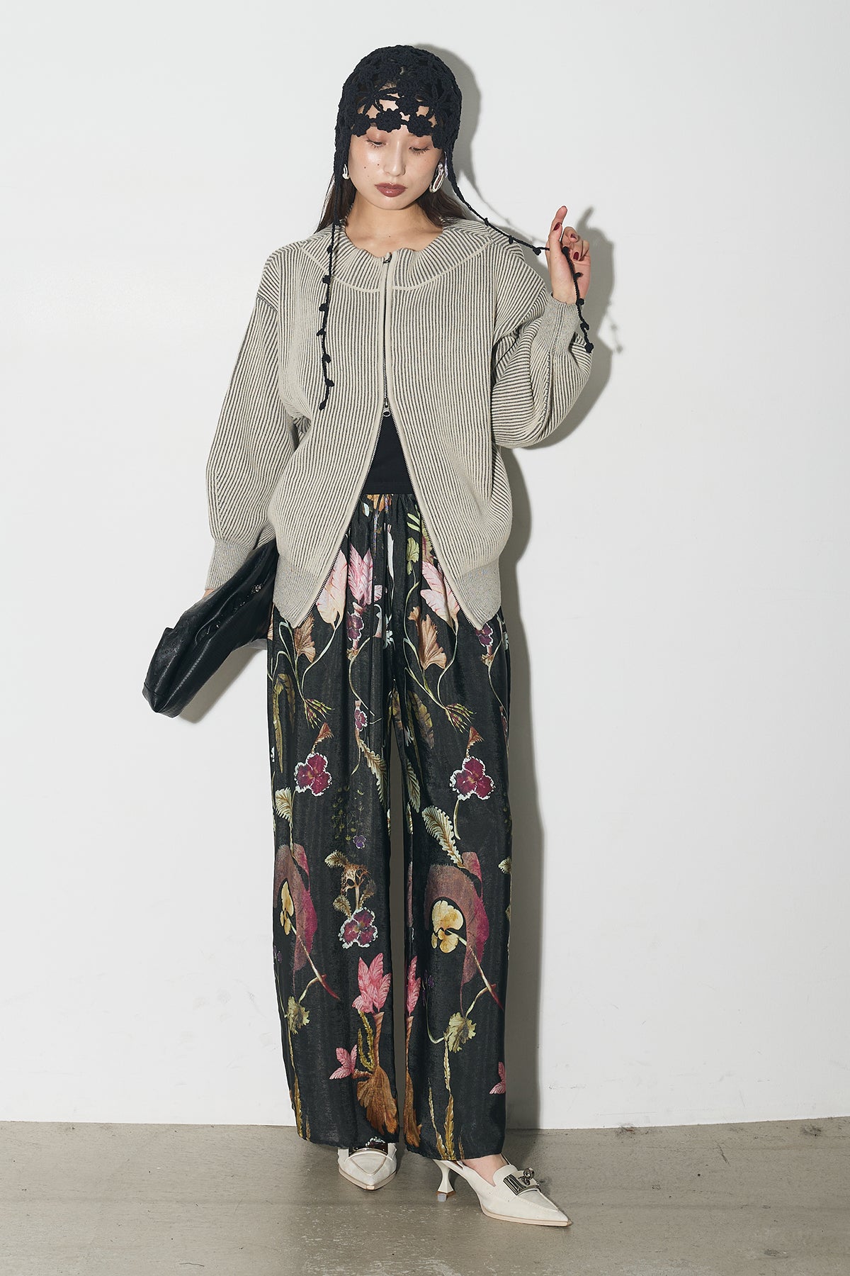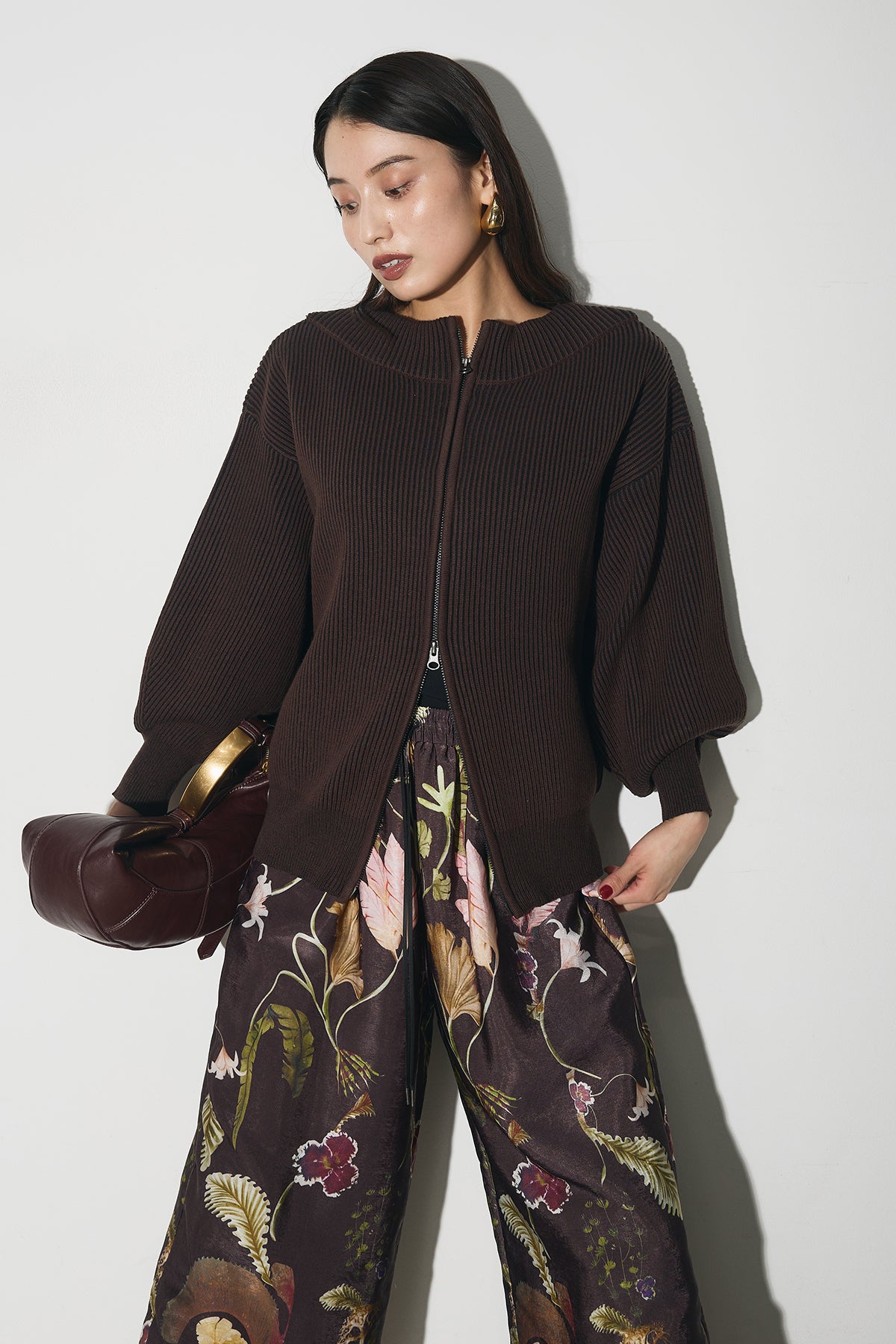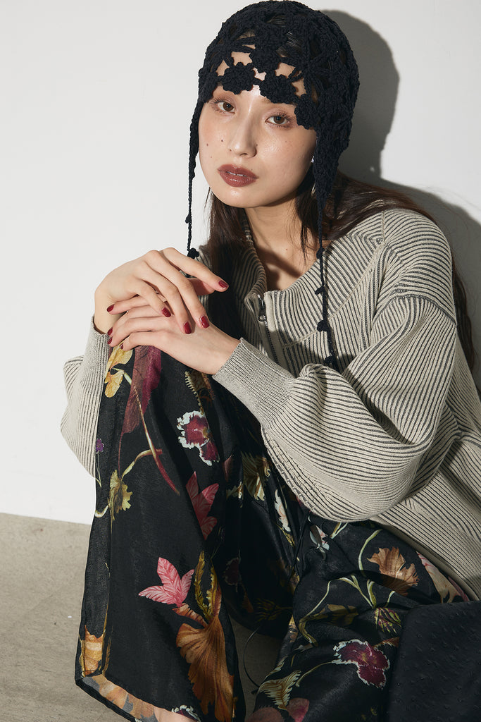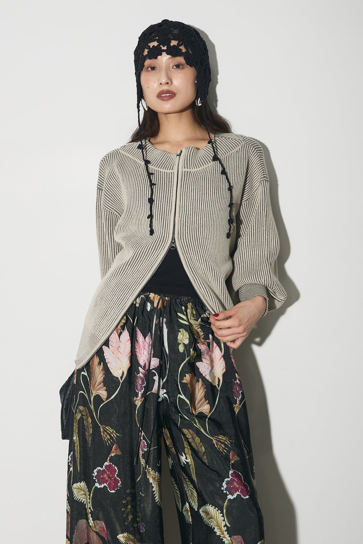 【SET】配色リブジップニット+ボタニカルリラックスパンツ