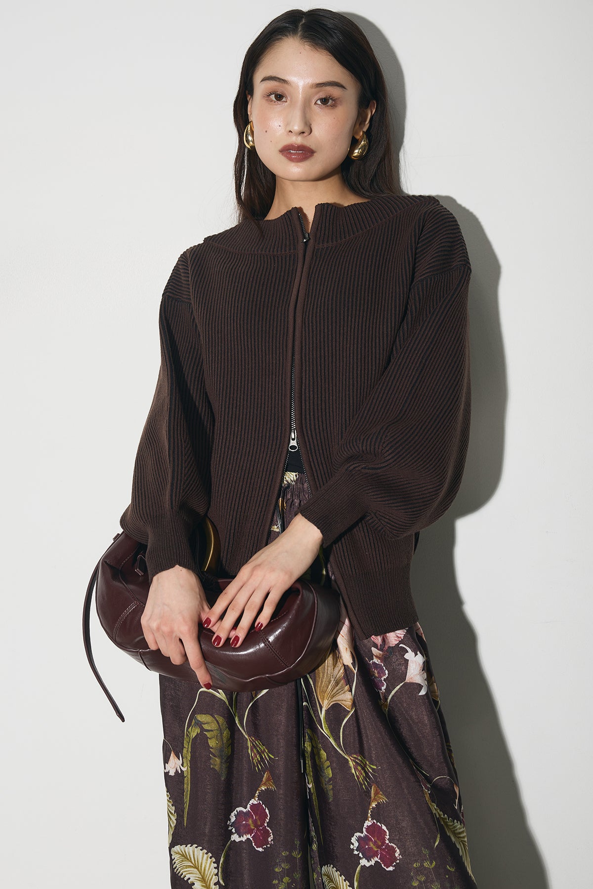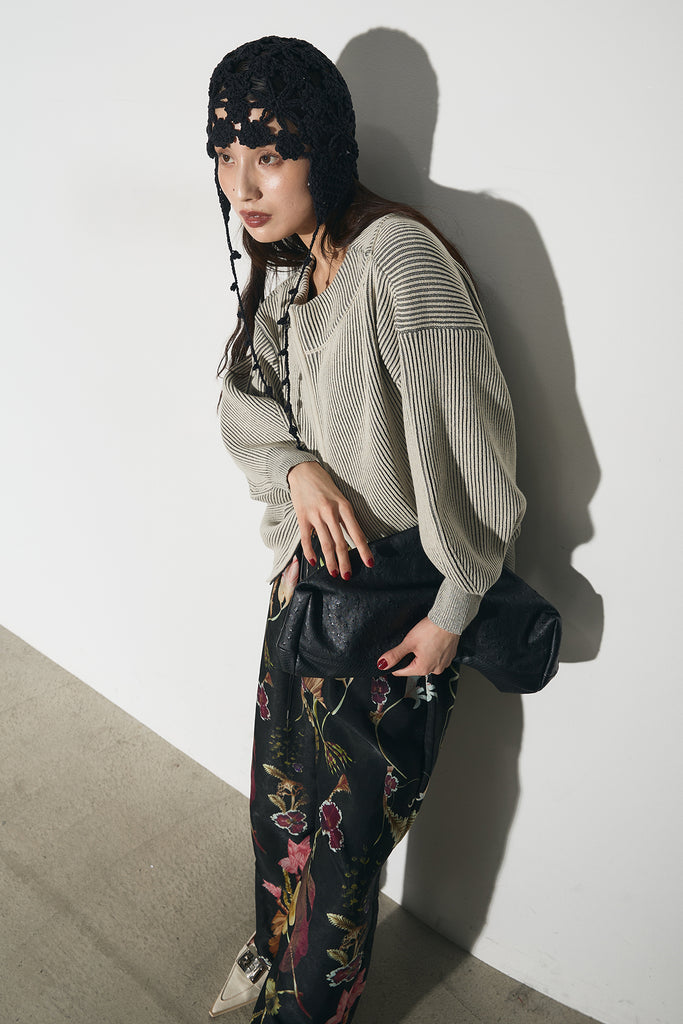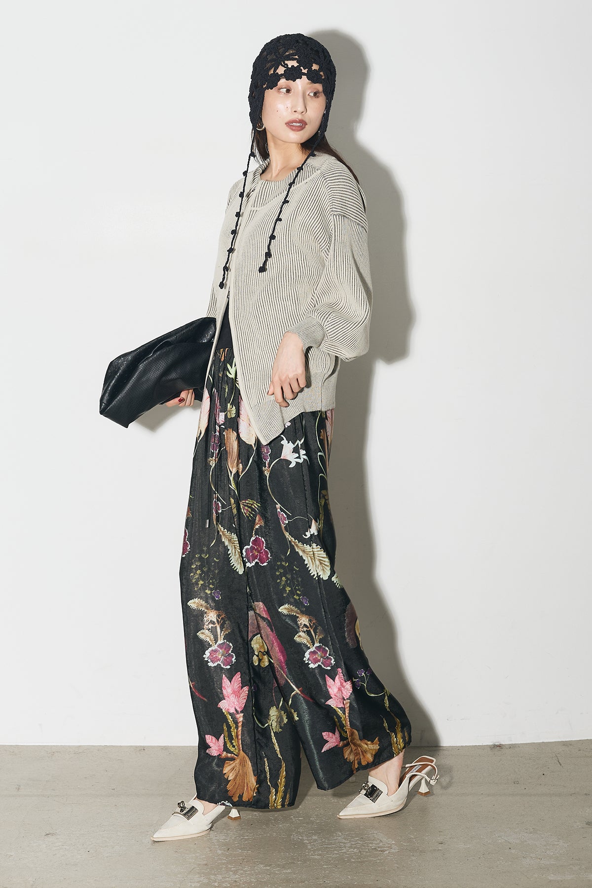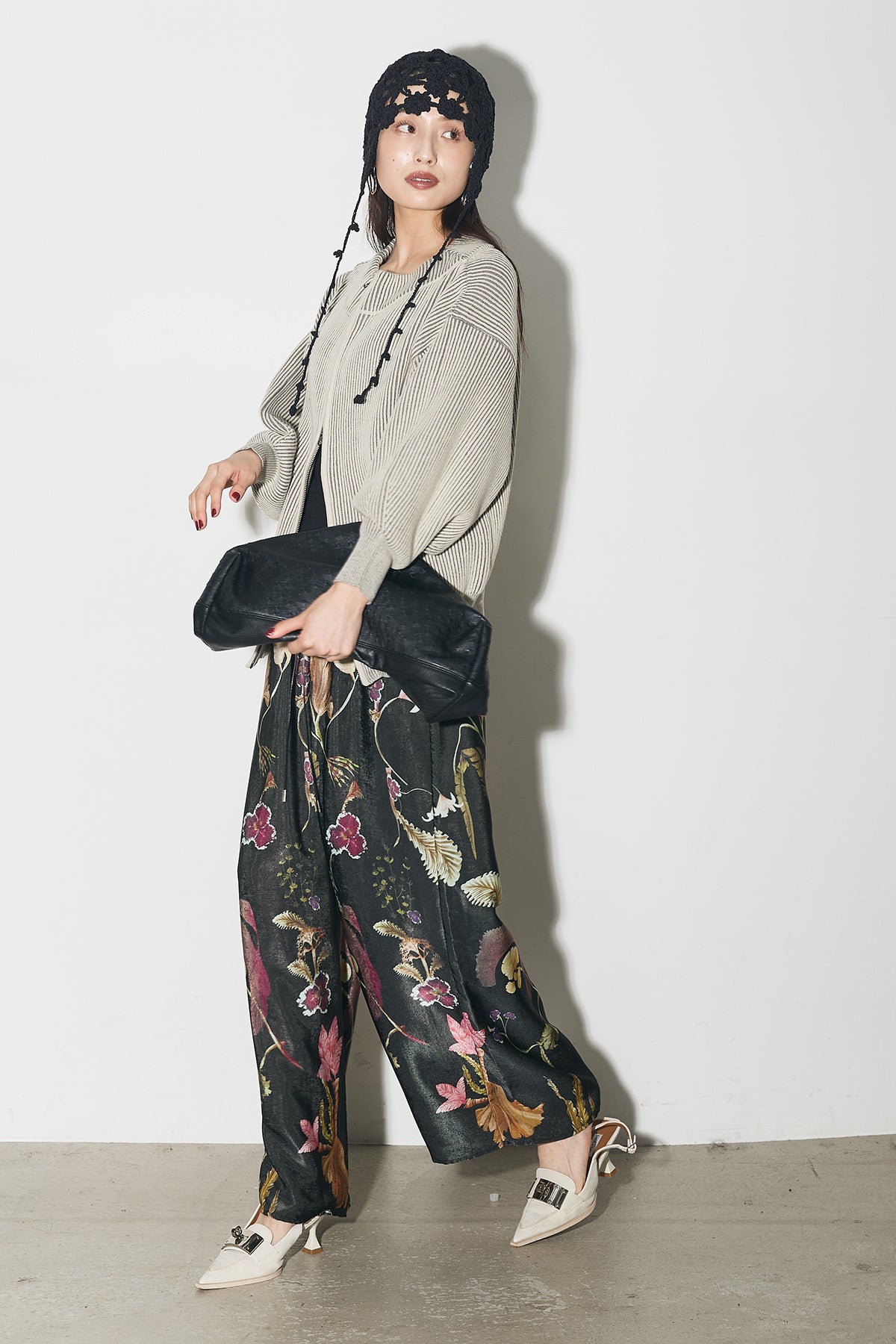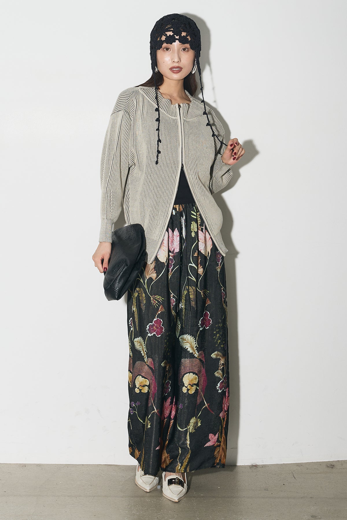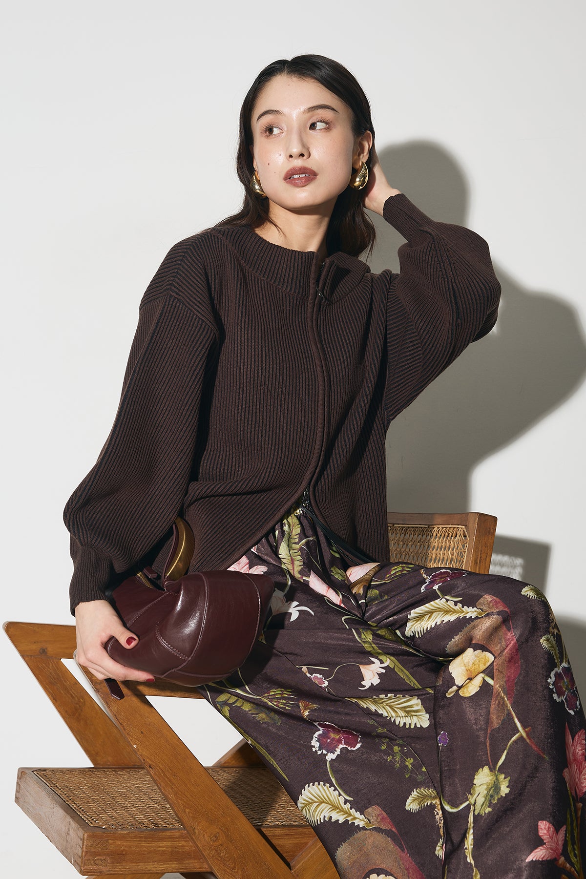 【SET】配色リブジップニット+ボタニカルリラックスパンツ