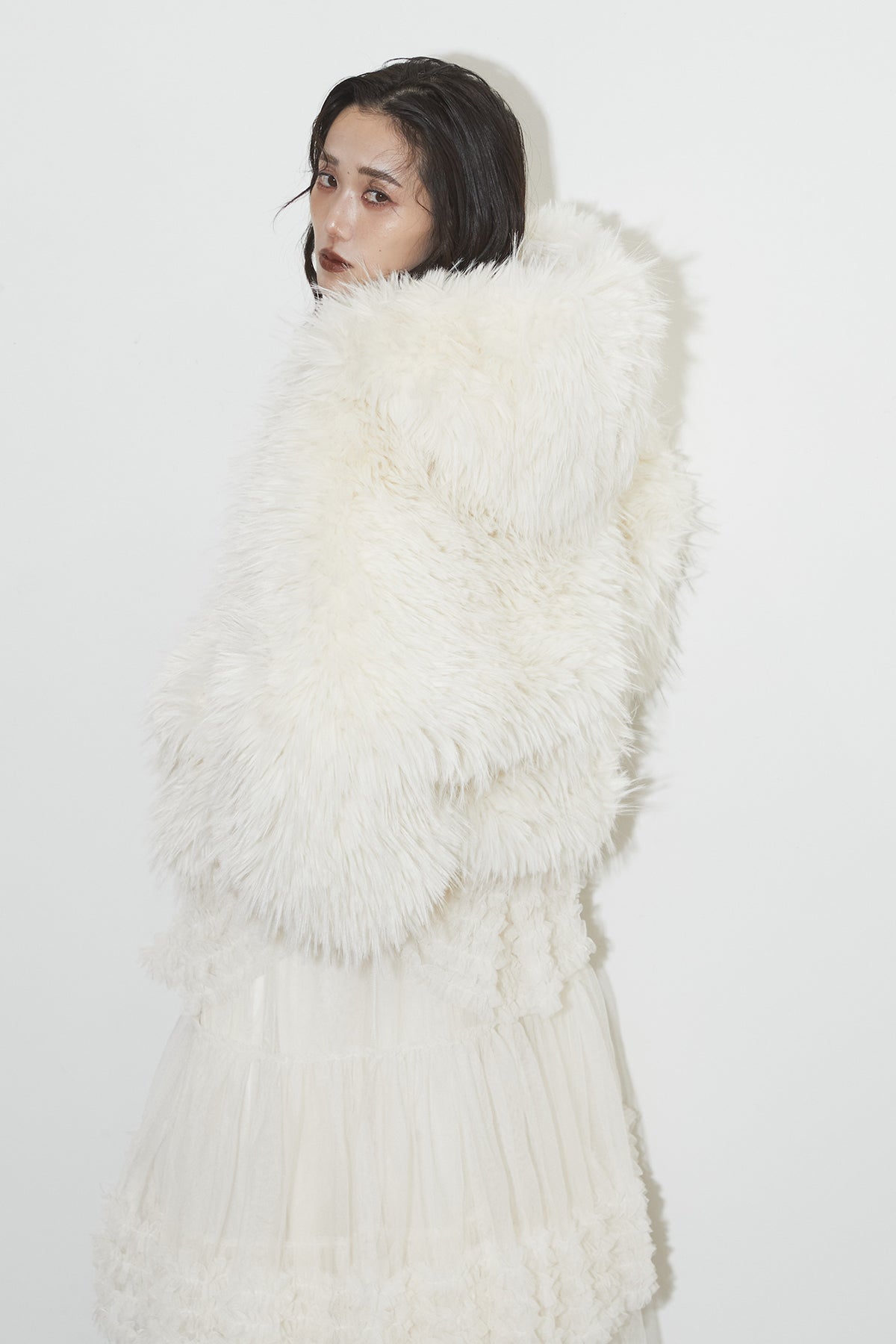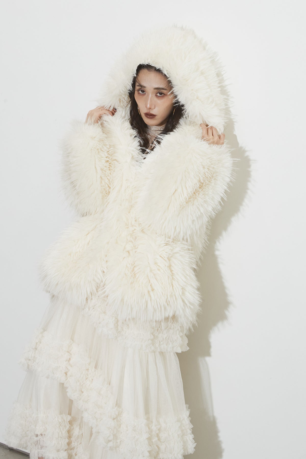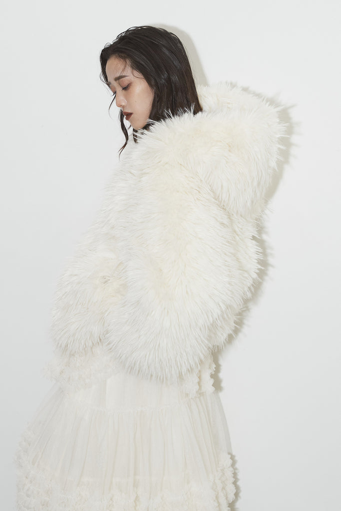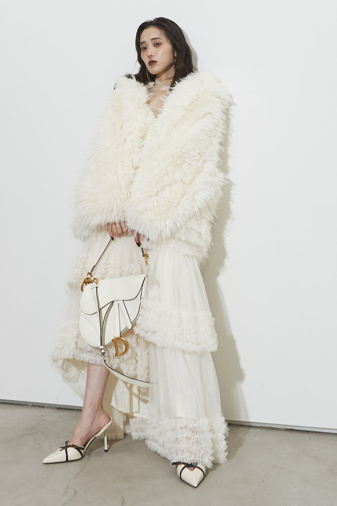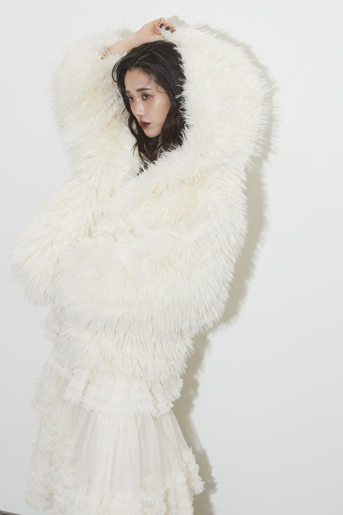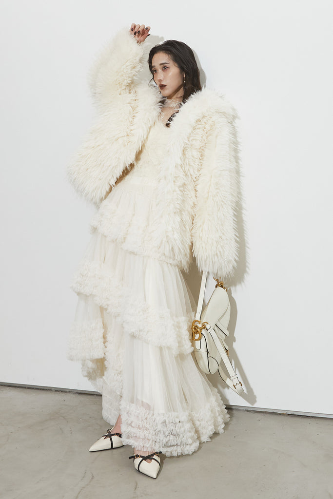 【SET】シャギーファーフードジャケット+チュールラインティアードスカート