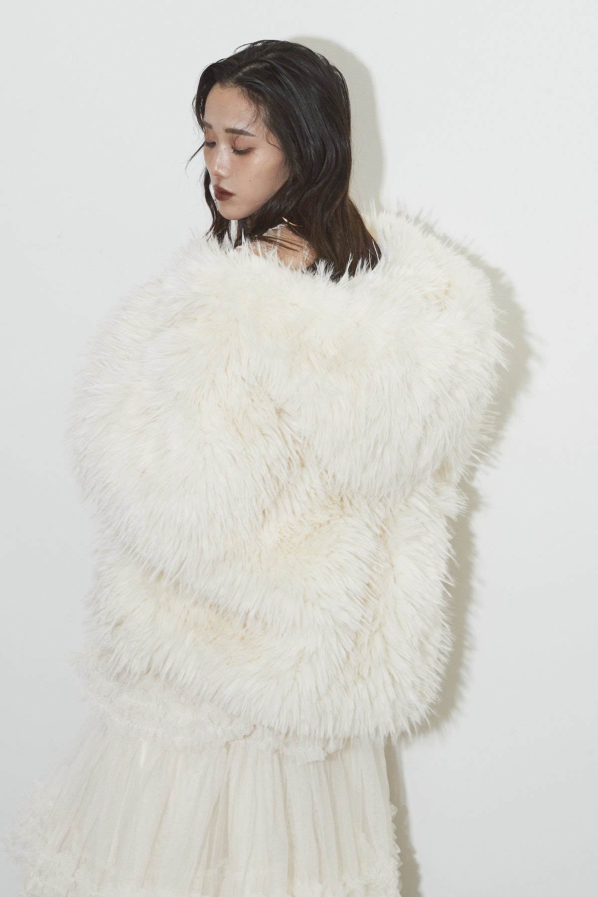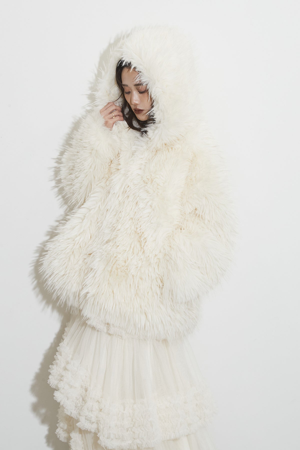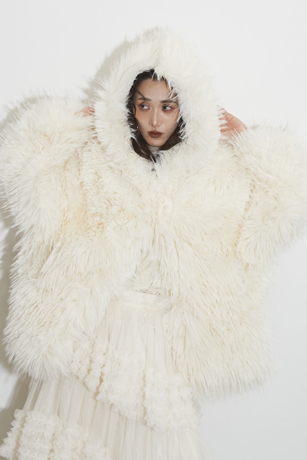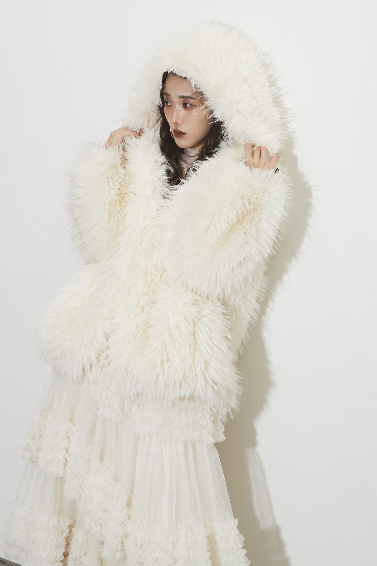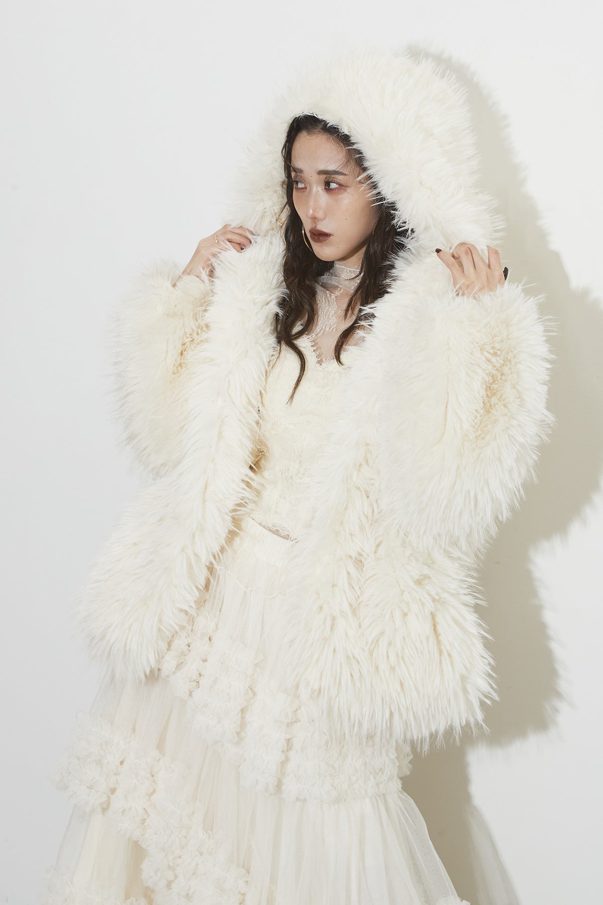 【SET】シャギーファーフードジャケット+チュールラインティアードスカート