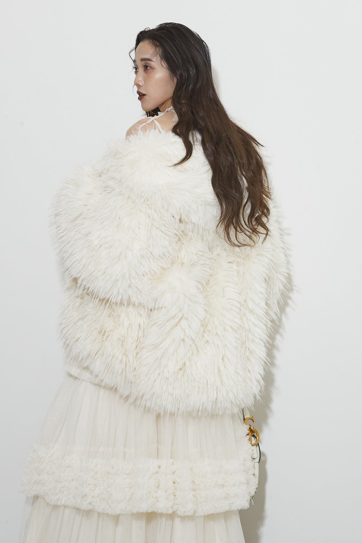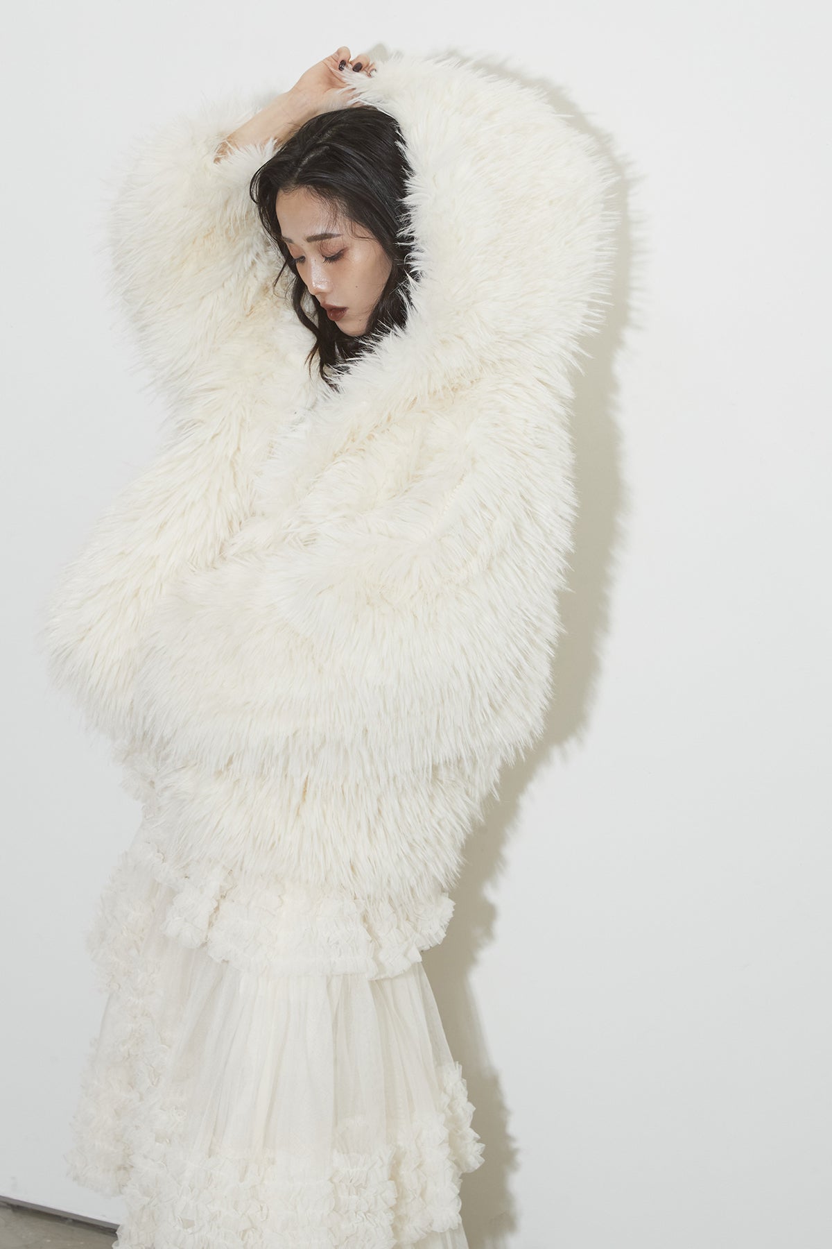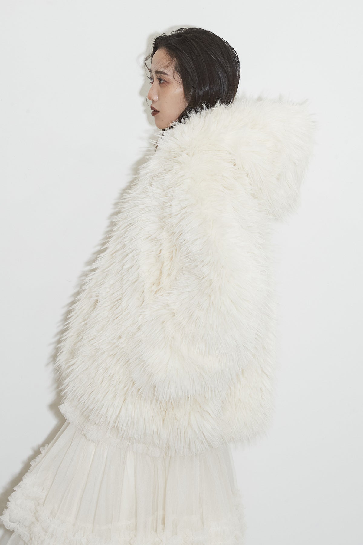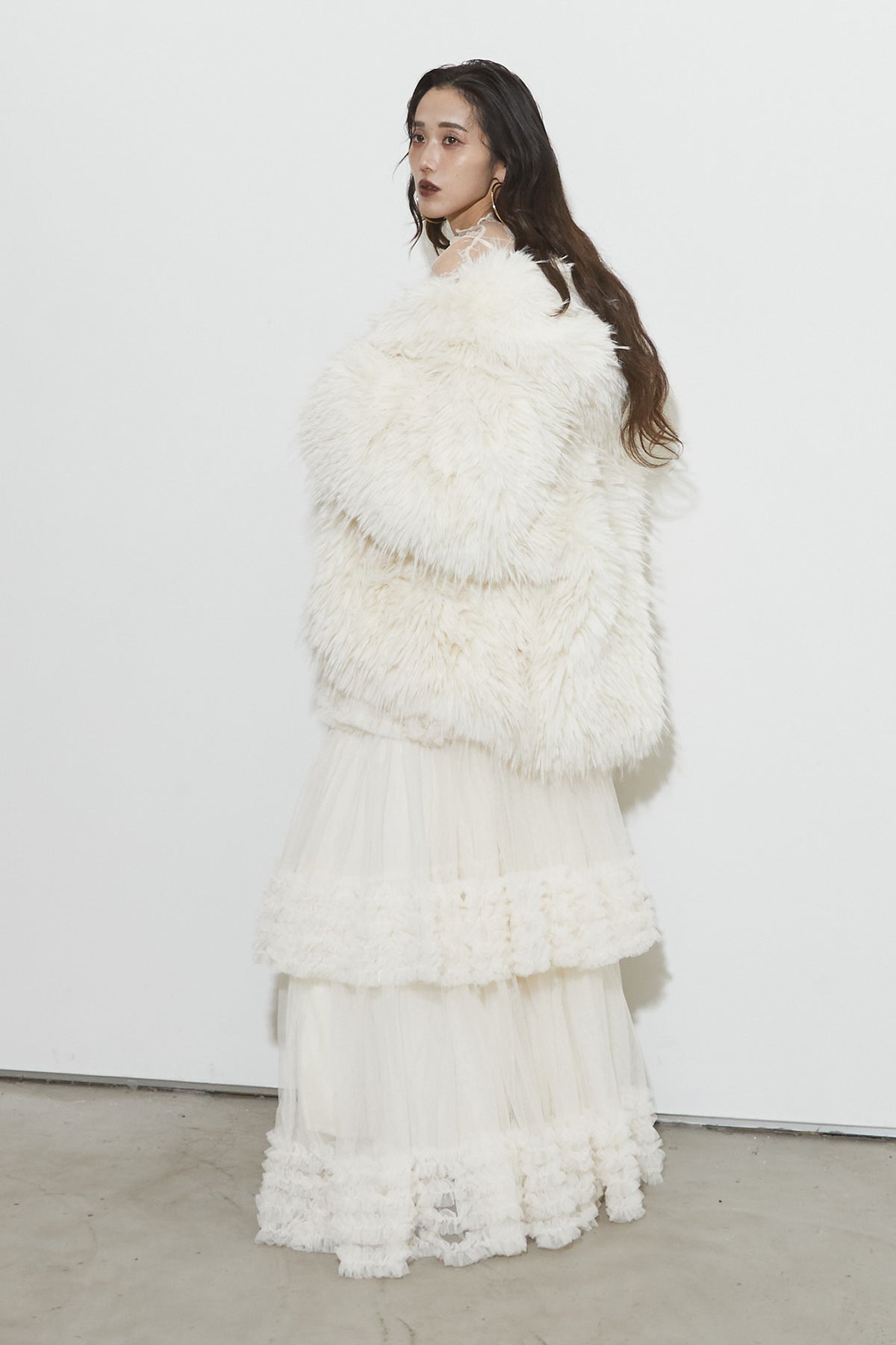 【SET】シャギーファーフードジャケット+チュールラインティアードスカート