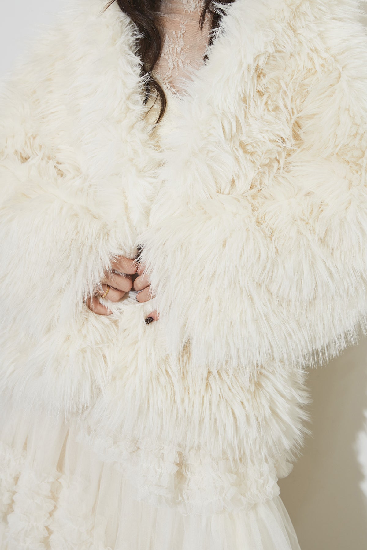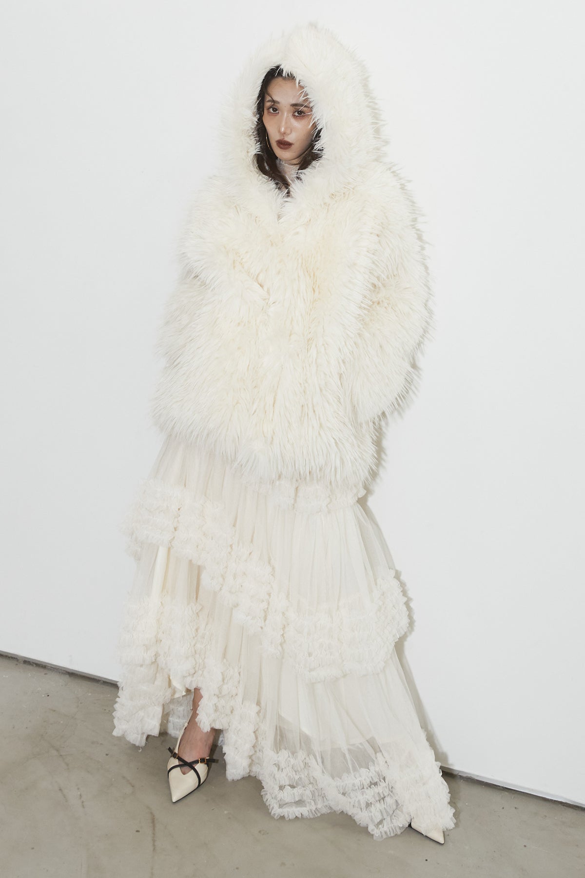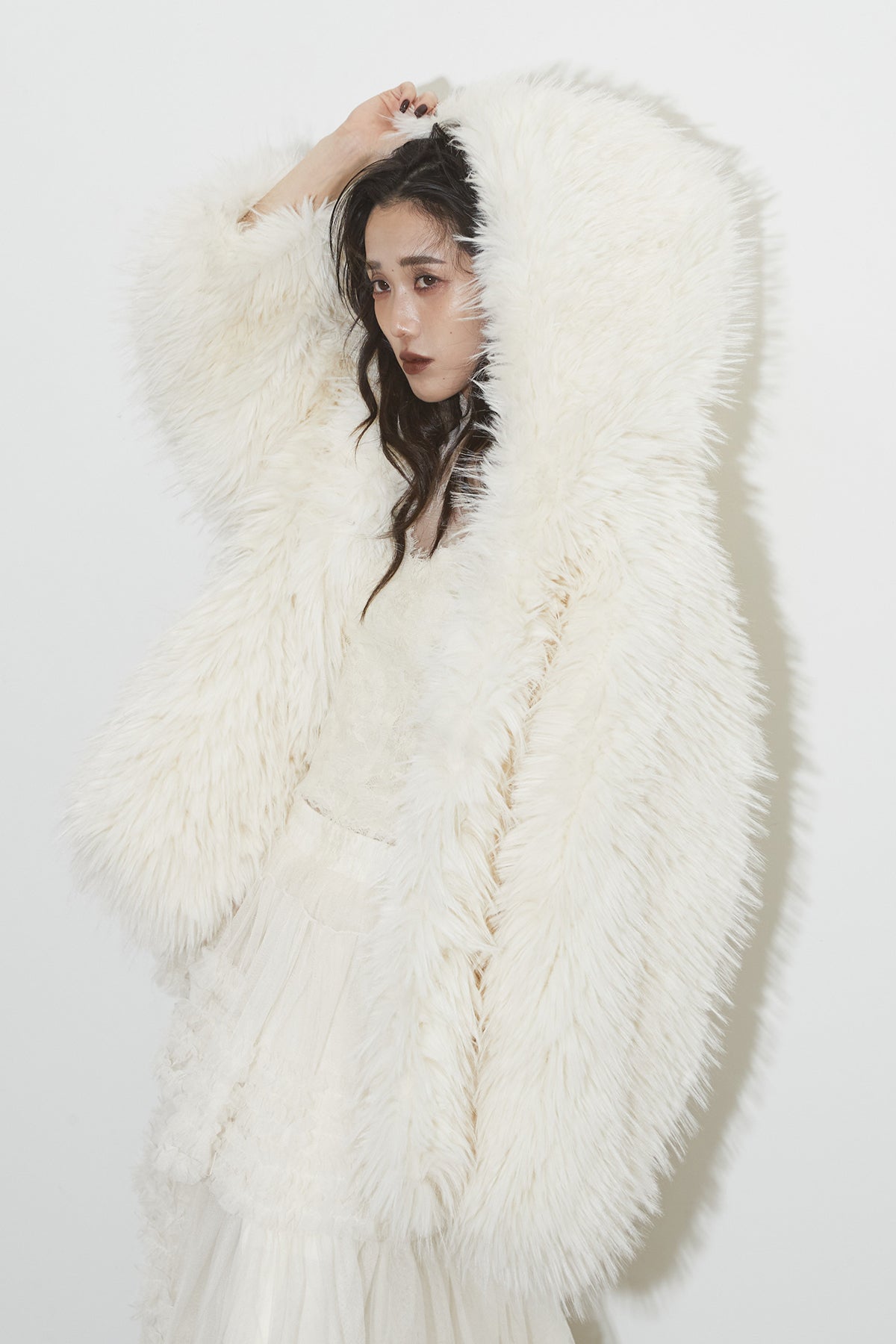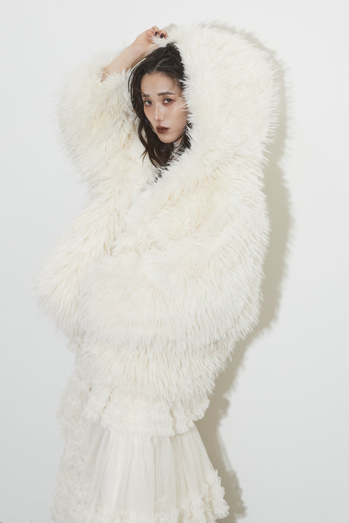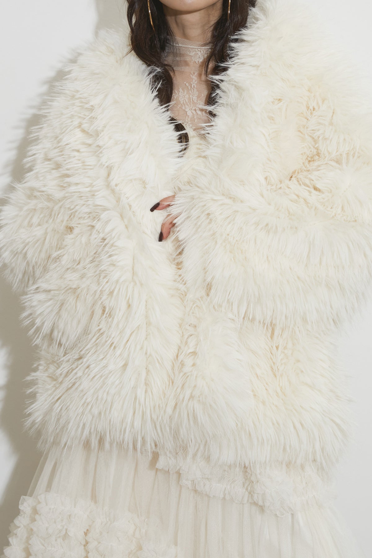 【SET】シャギーファーフードジャケット+チュールラインティアードスカート