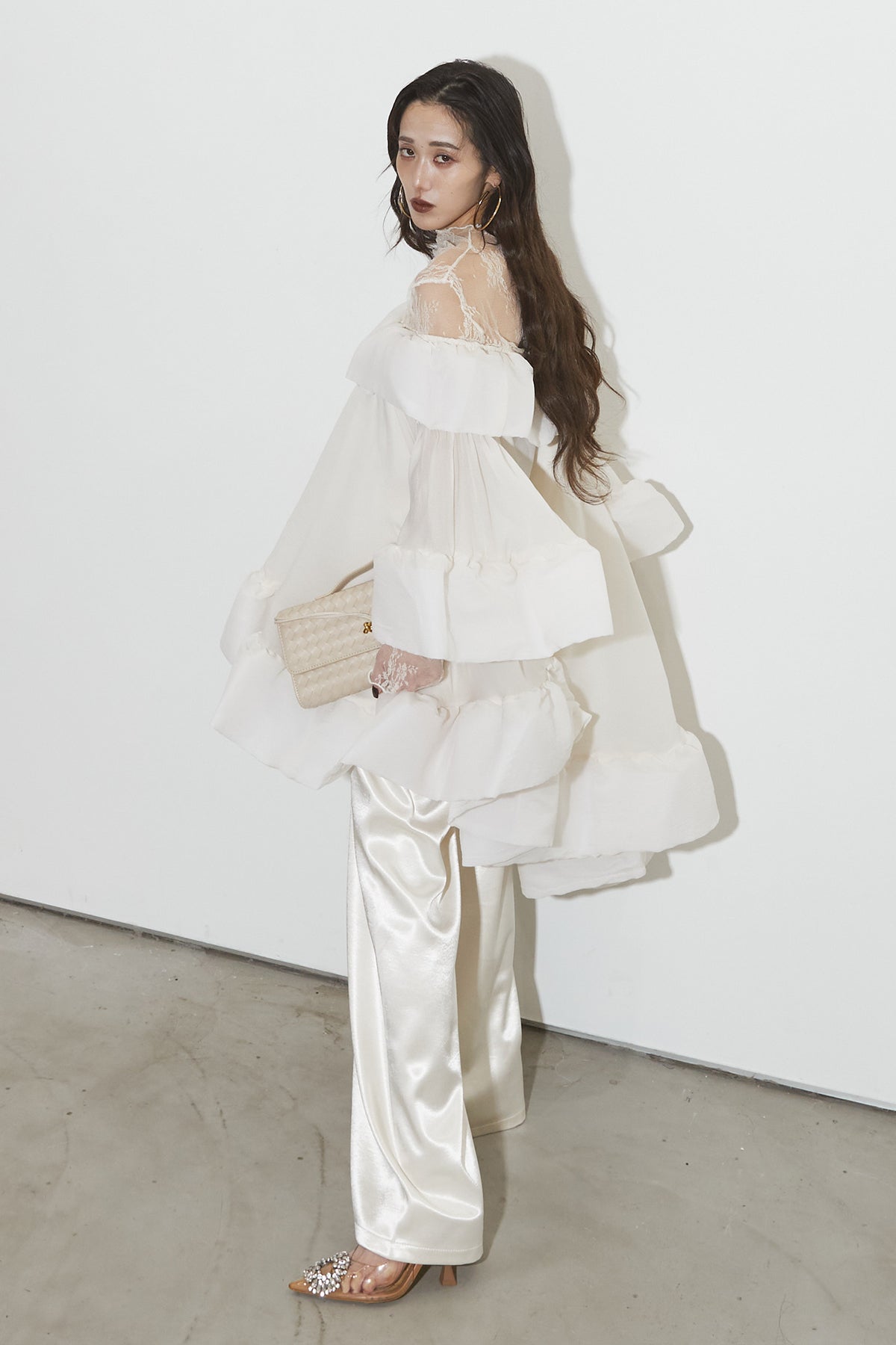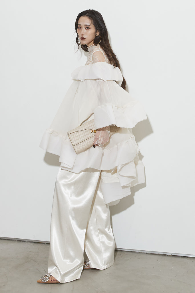 【SET】レースシアートップス+フリルオフショルチュニック+サテンコードパンツ