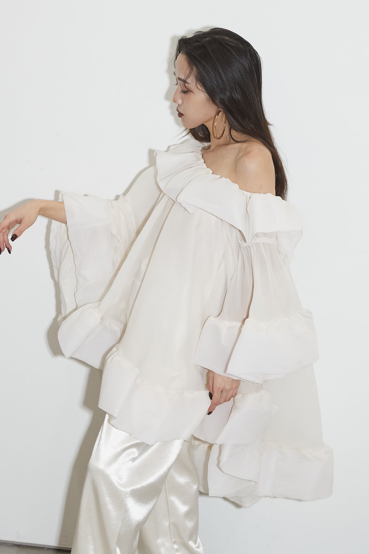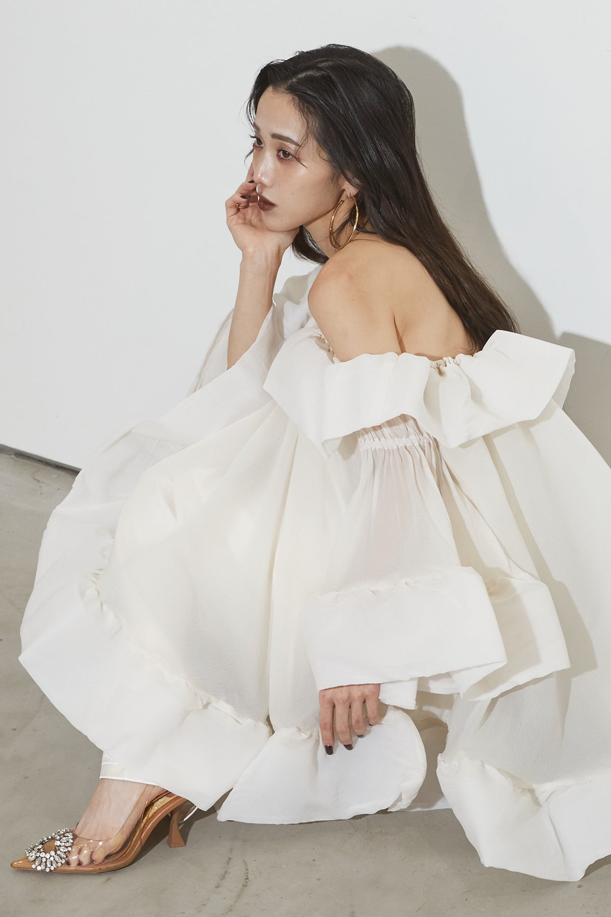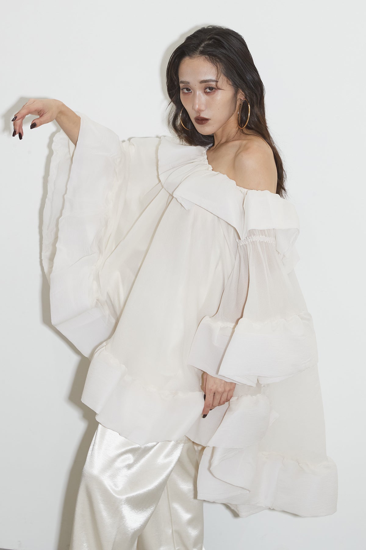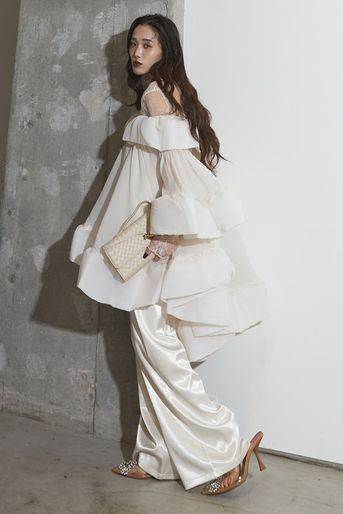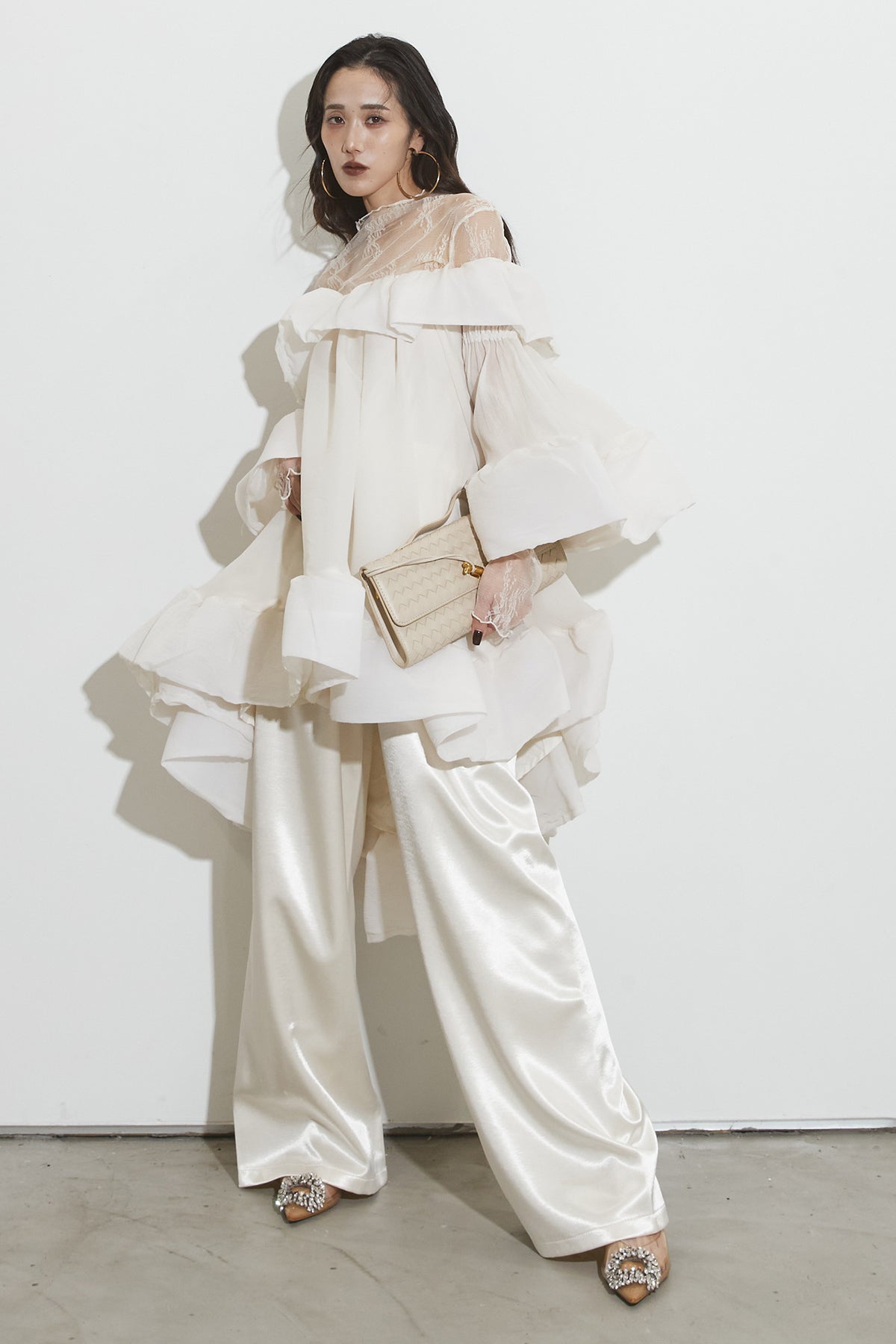 【SET】フリルオフショルチュニック+サテンコードパンツ