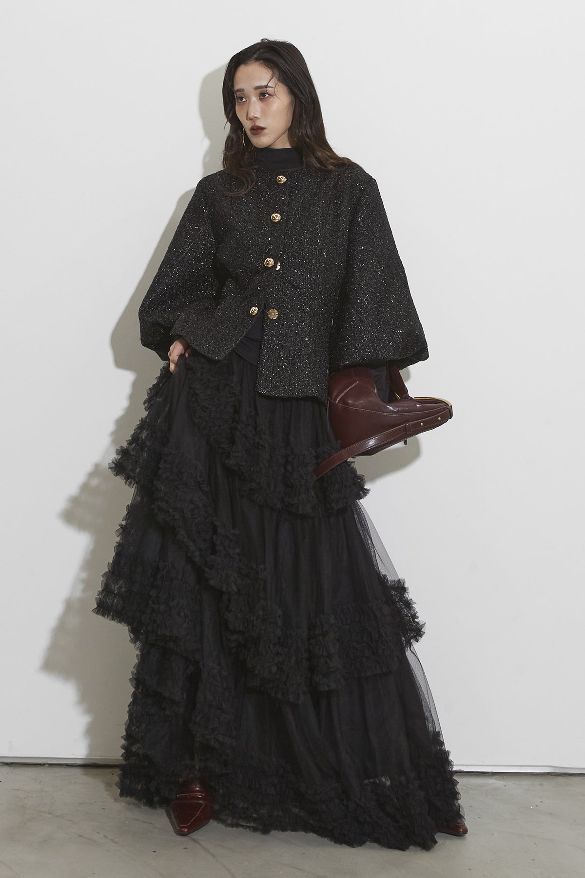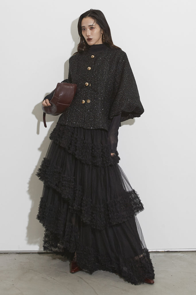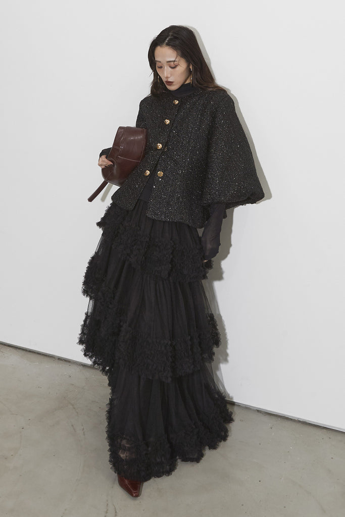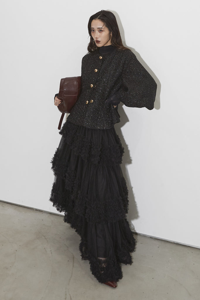【SET】シアーコントラストトップス+ツイードパフスリーブジャケット+チュールラインティアードスカート