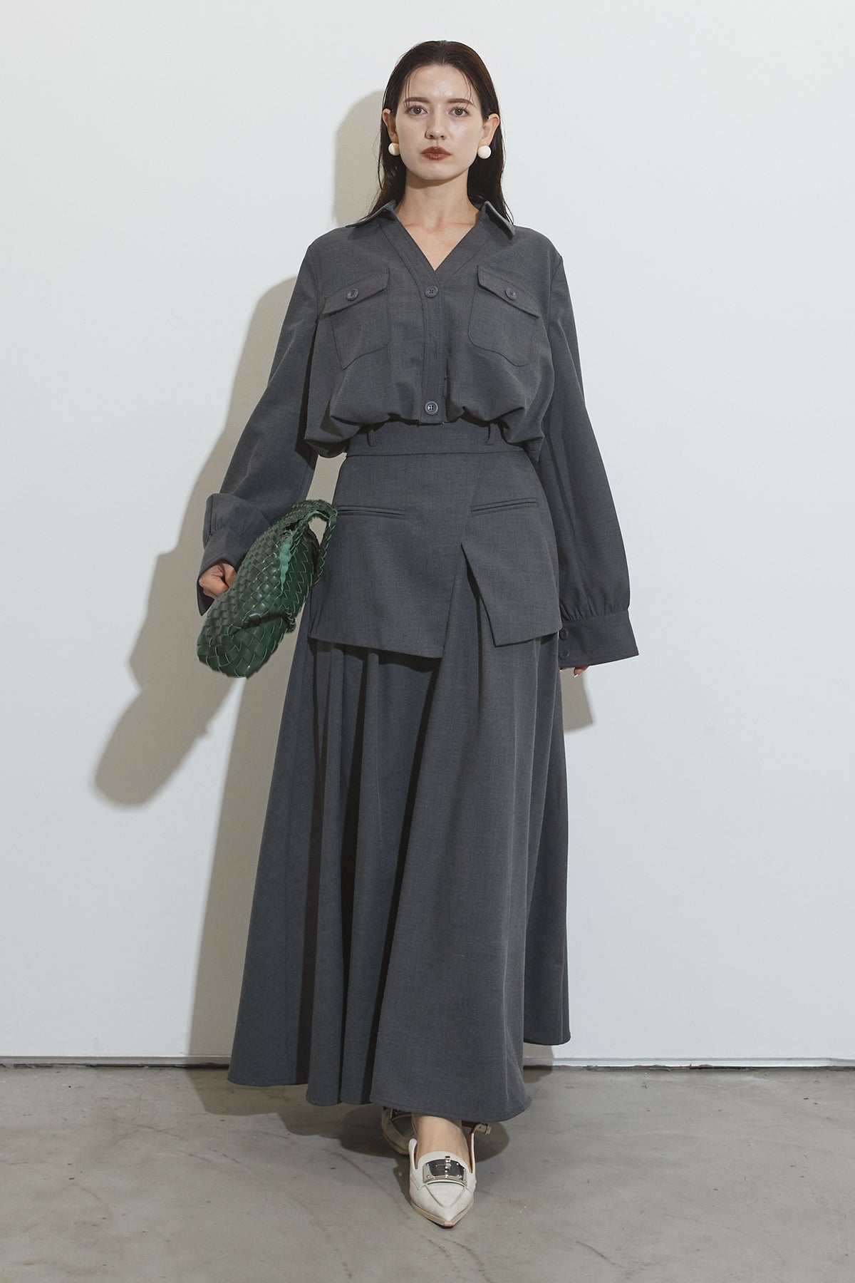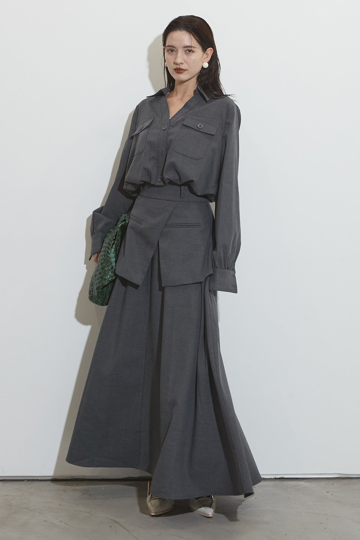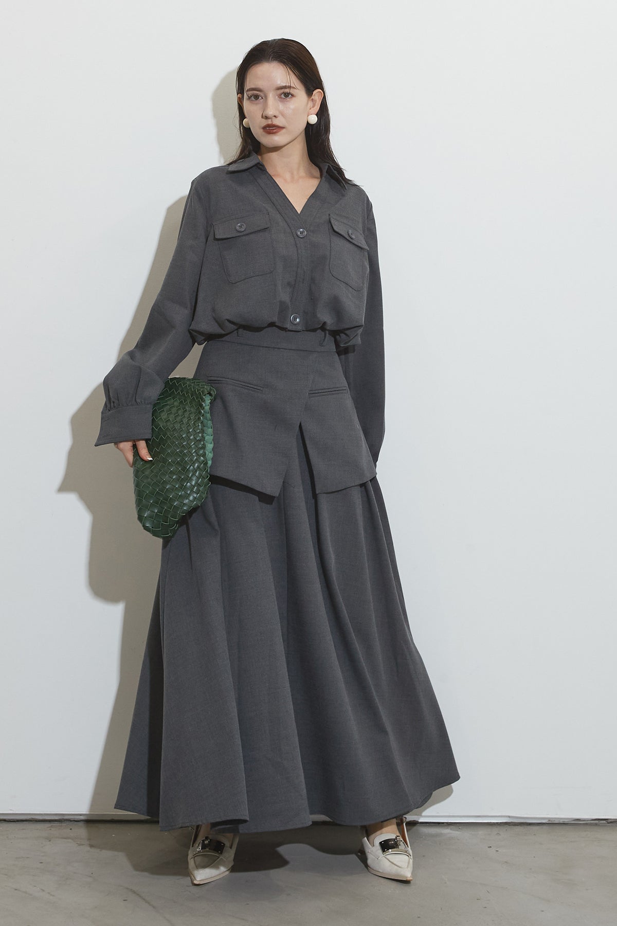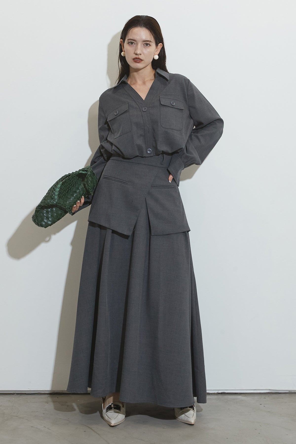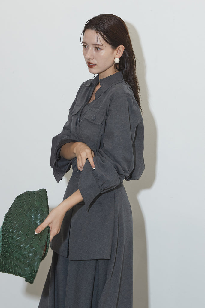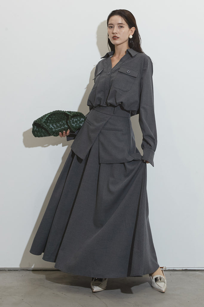 クラシカルな雰囲気漂うセットアップ。トップスはゆったりとしたシルエットで、胸元のポケットがアクセントに。スカートはレイヤード風デザインが特徴で、動くたびに美しいドレープが広がります。フォーマルにもカジュアルにも着回し可能な上品な一枚です。