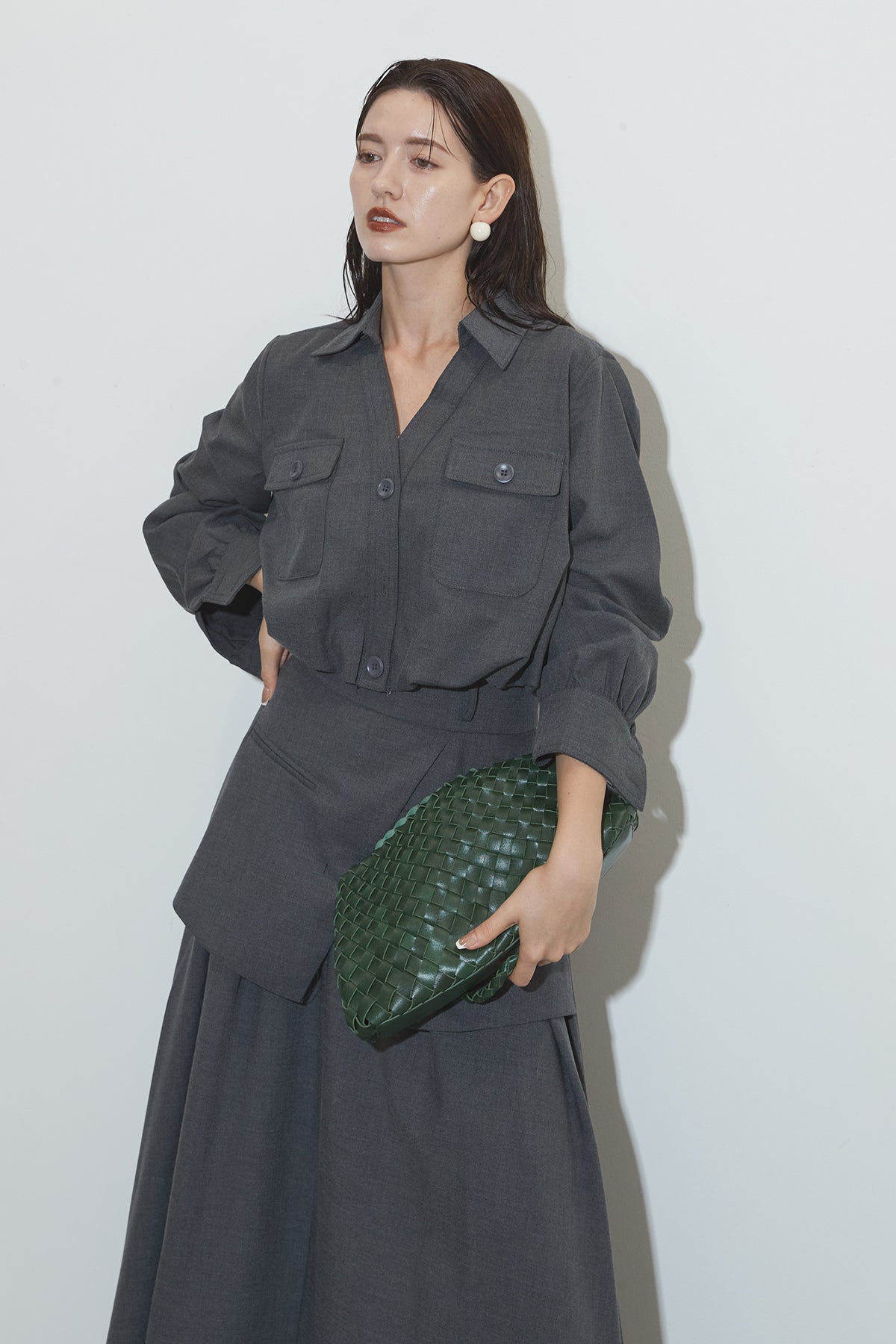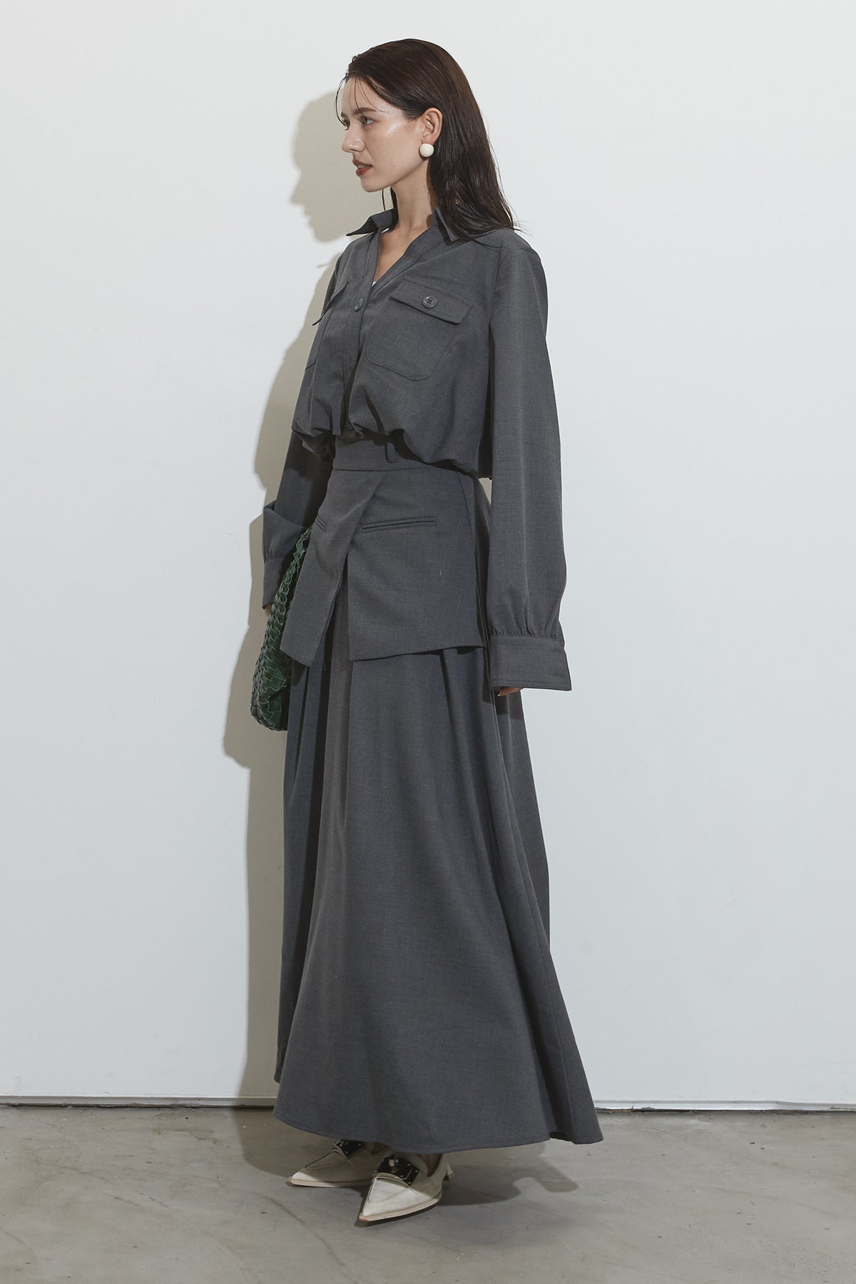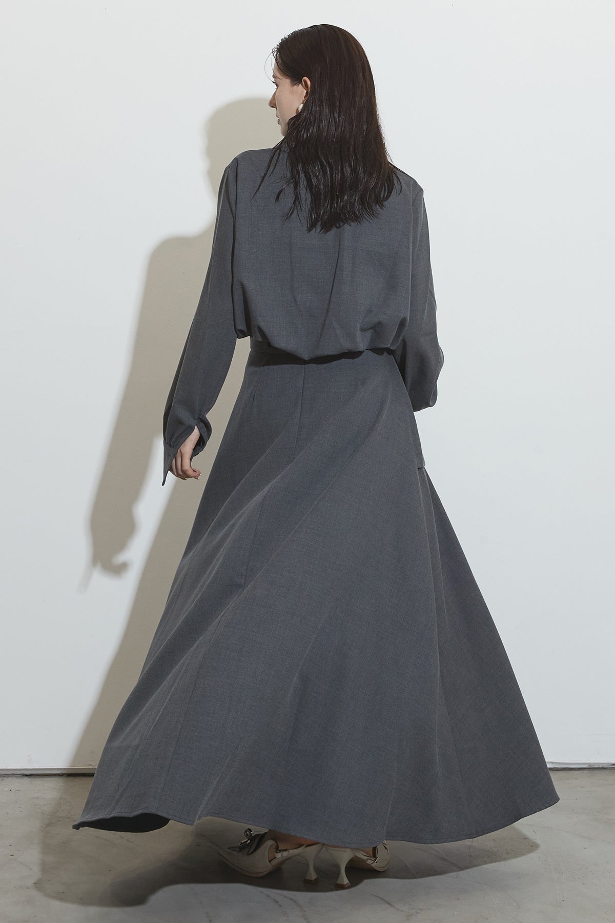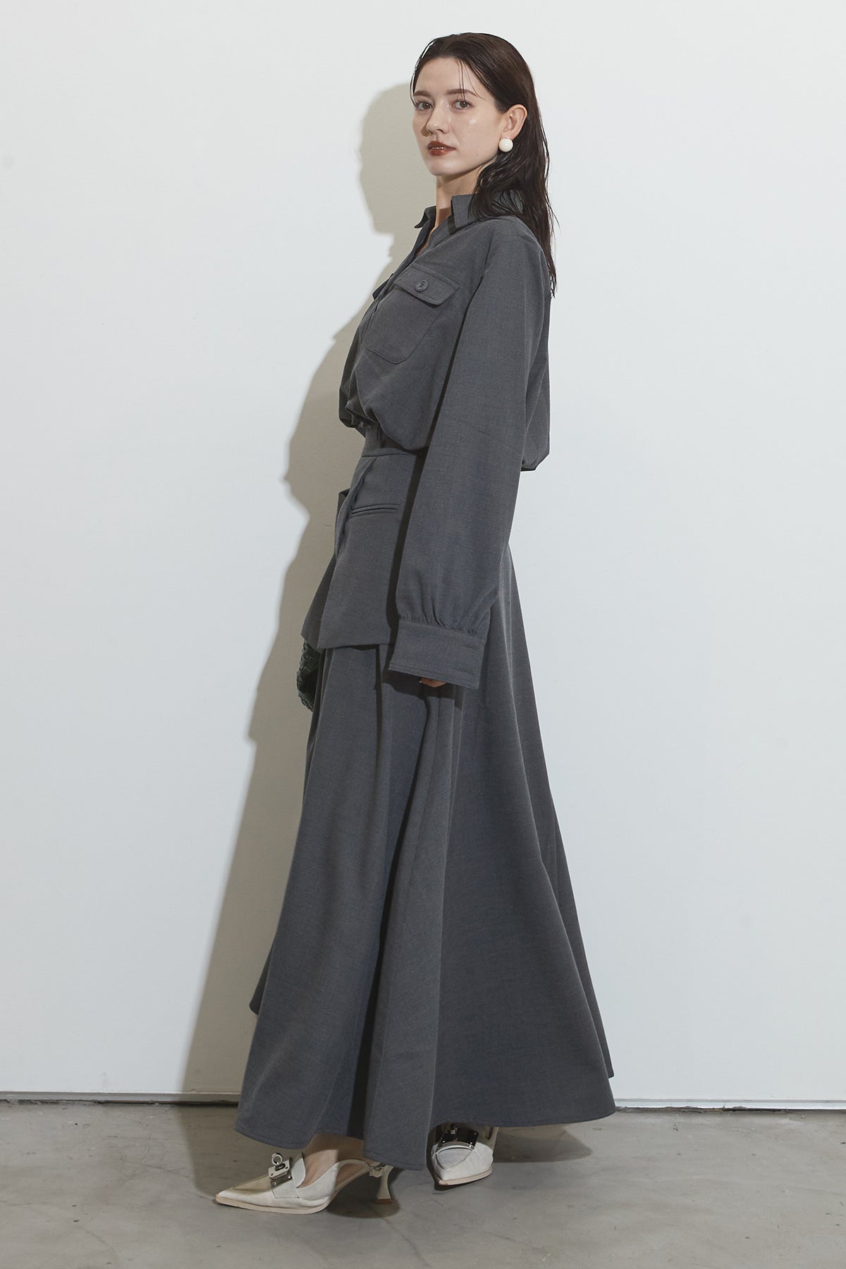 クラシカルな雰囲気漂うセットアップ。トップスはゆったりとしたシルエットで、胸元のポケットがアクセントに。スカートはレイヤード風デザインが特徴で、動くたびに美しいドレープが広がります。フォーマルにもカジュアルにも着回し可能な上品な一枚です。
