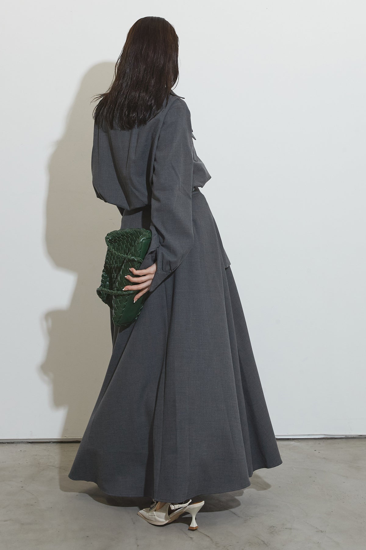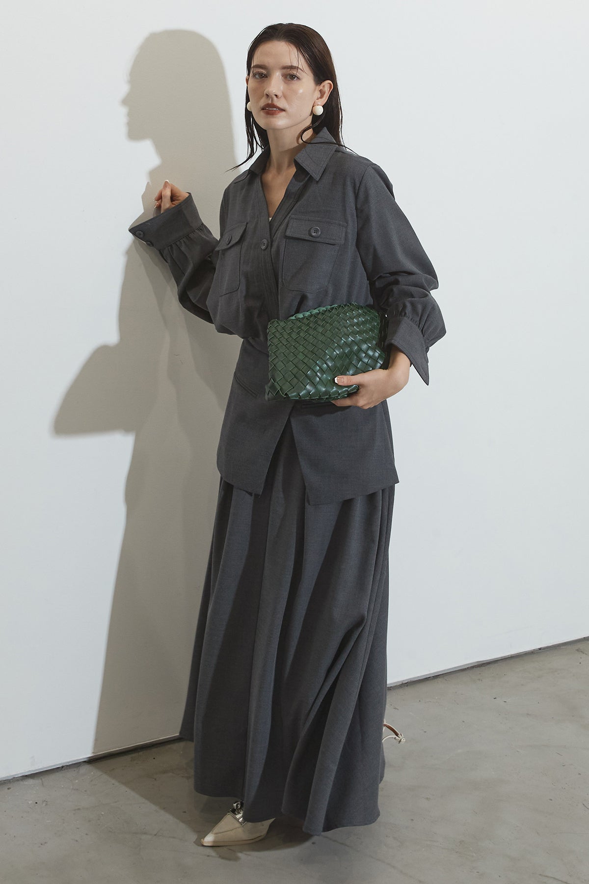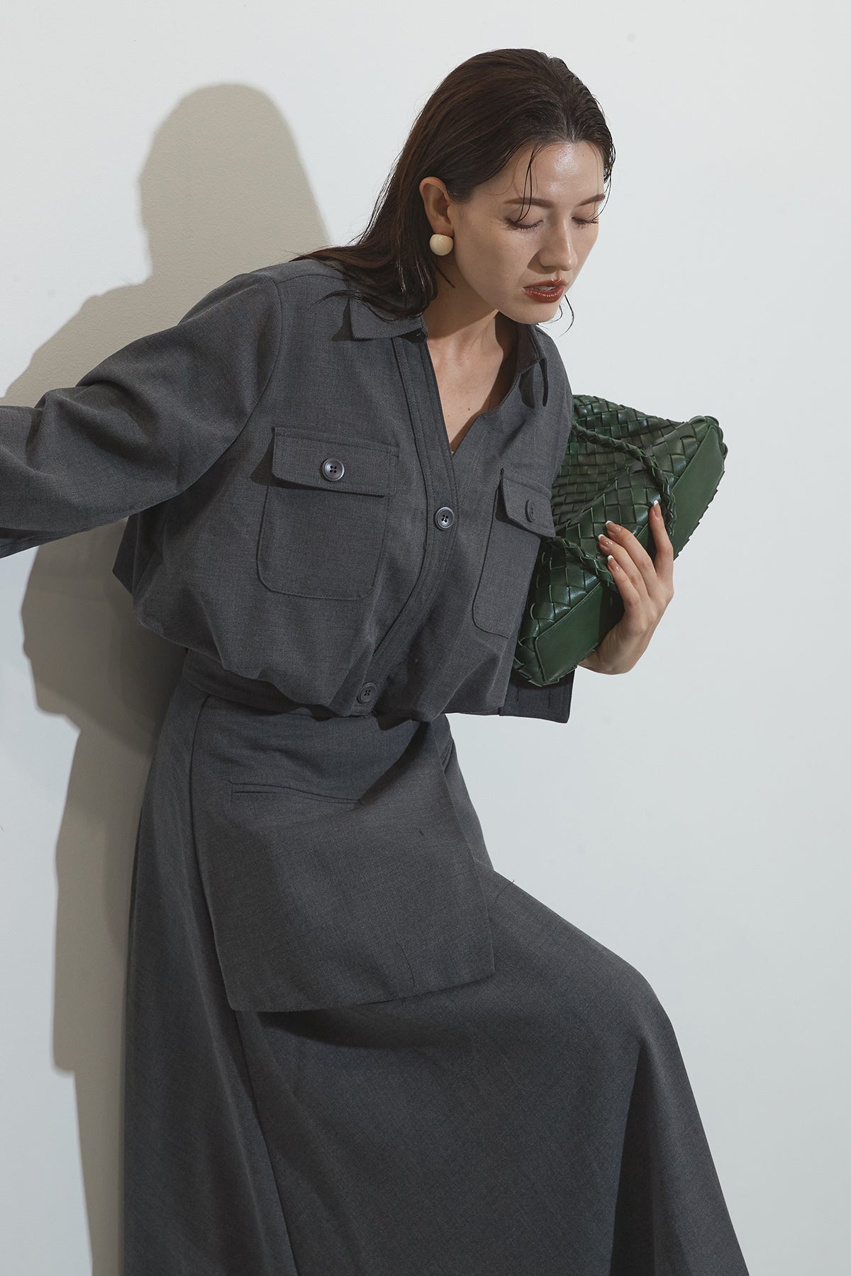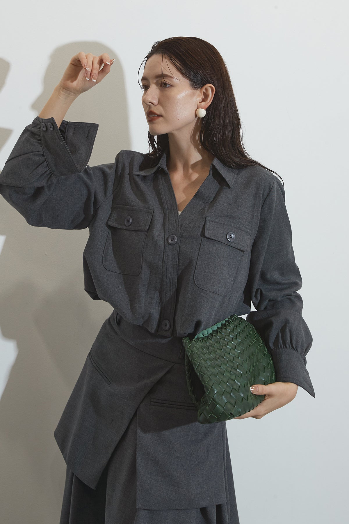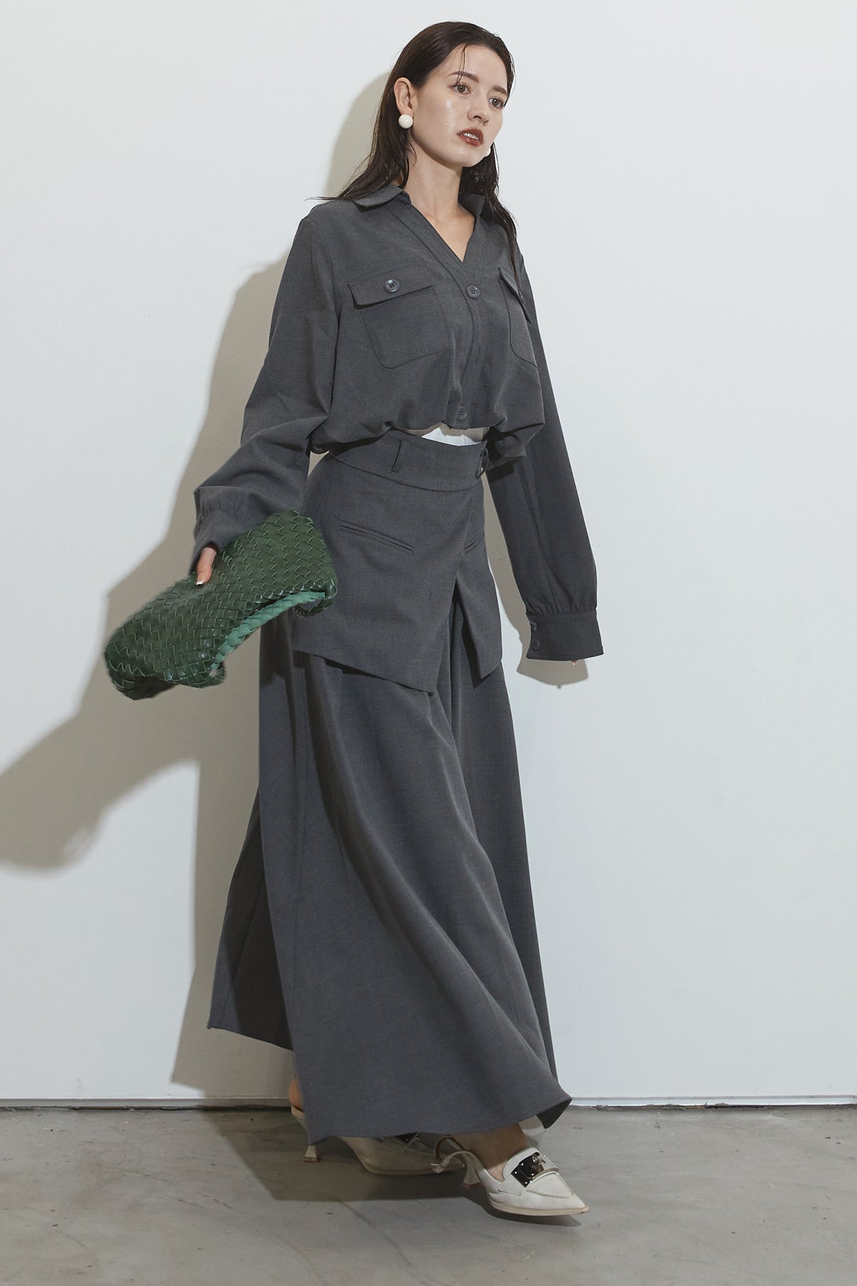 クラシカルな雰囲気漂うセットアップ。トップスはゆったりとしたシルエットで、胸元のポケットがアクセントに。スカートはレイヤード風デザインが特徴で、動くたびに美しいドレープが広がります。フォーマルにもカジュアルにも着回し可能な上品な一枚です。