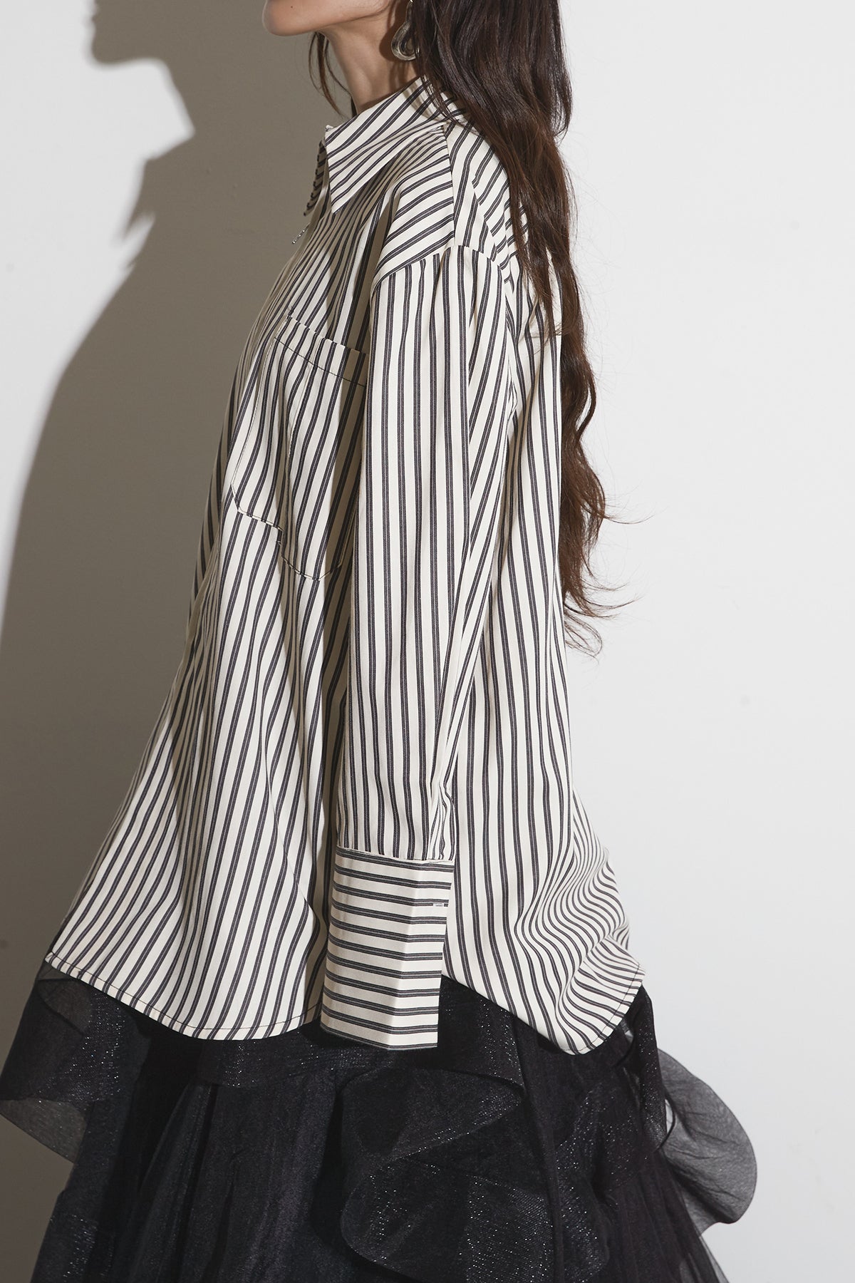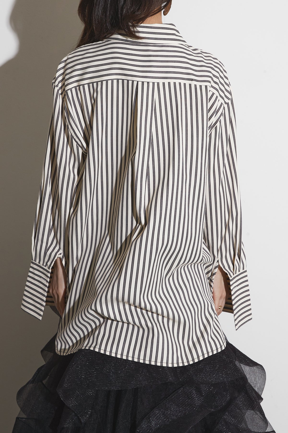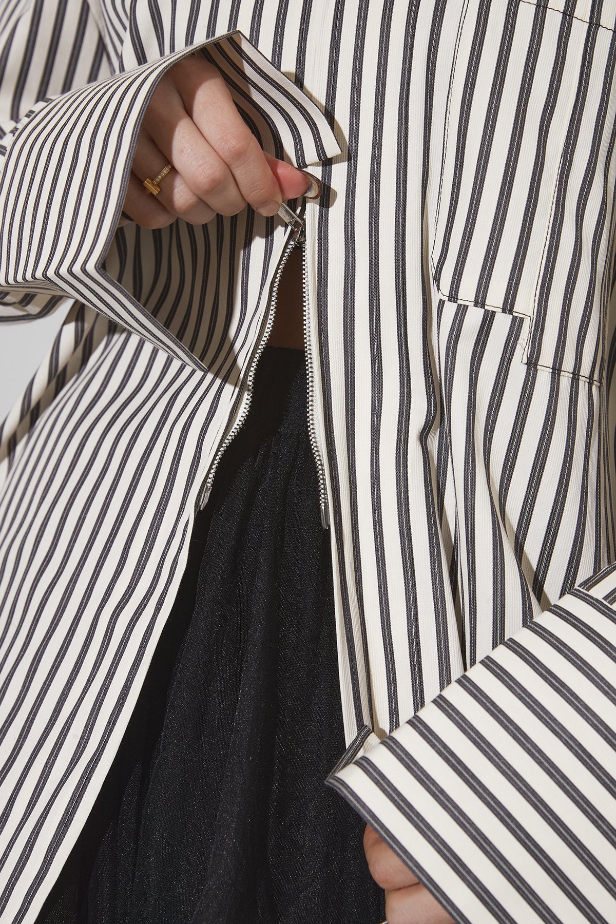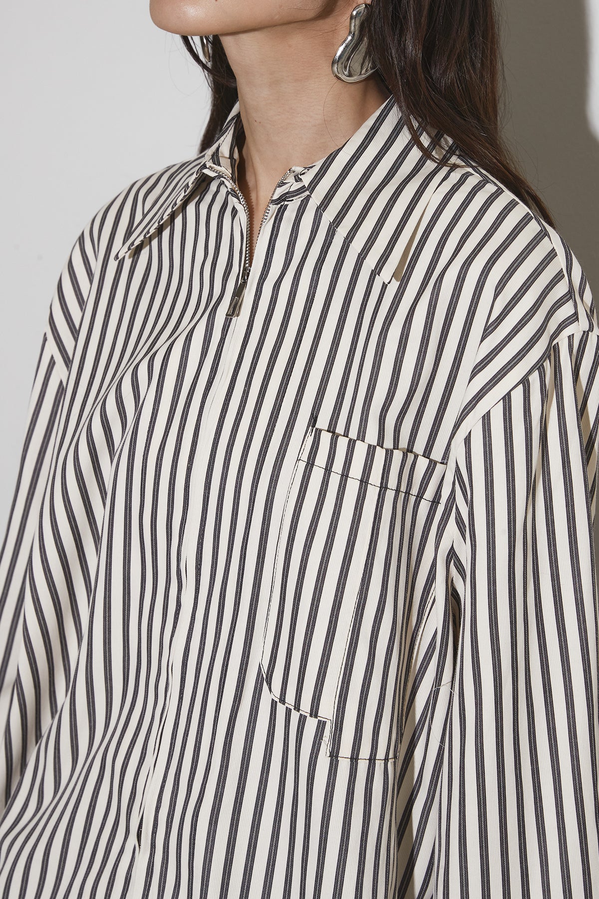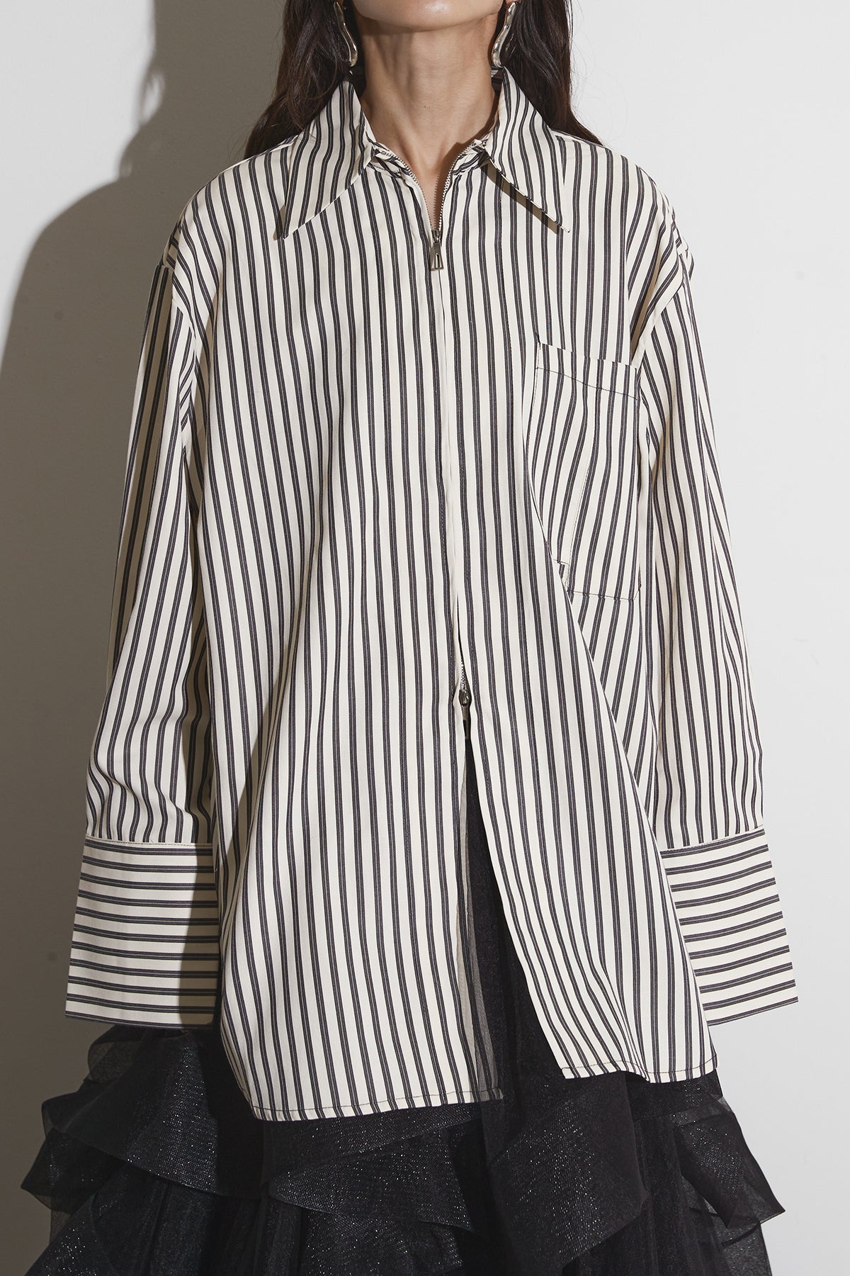 ダブルジップ仕様がアクセントになったストライプシャツ。 上下から開閉できるジップで、着こなしに変化をつけられるデザインです。 ドロップショルダーのリラックスシルエットに、胸ポケットを配したシンプルな仕上がり。 一枚着としてはもちろん、羽織りとしても活躍する万能アイテムです。