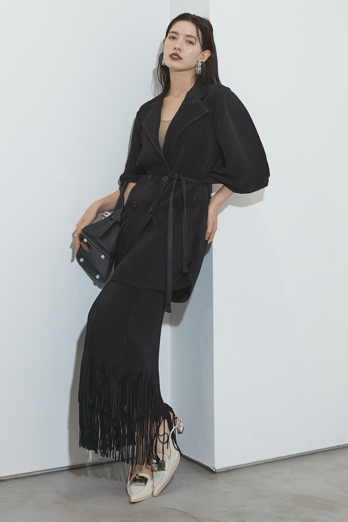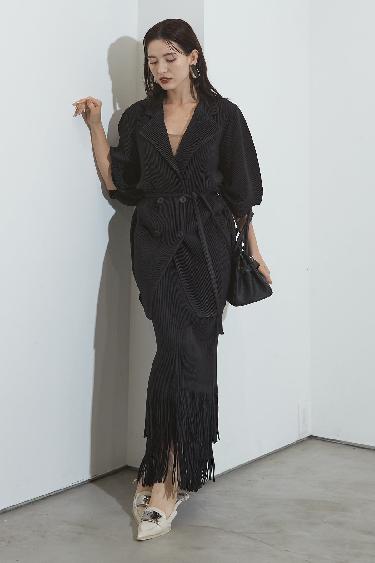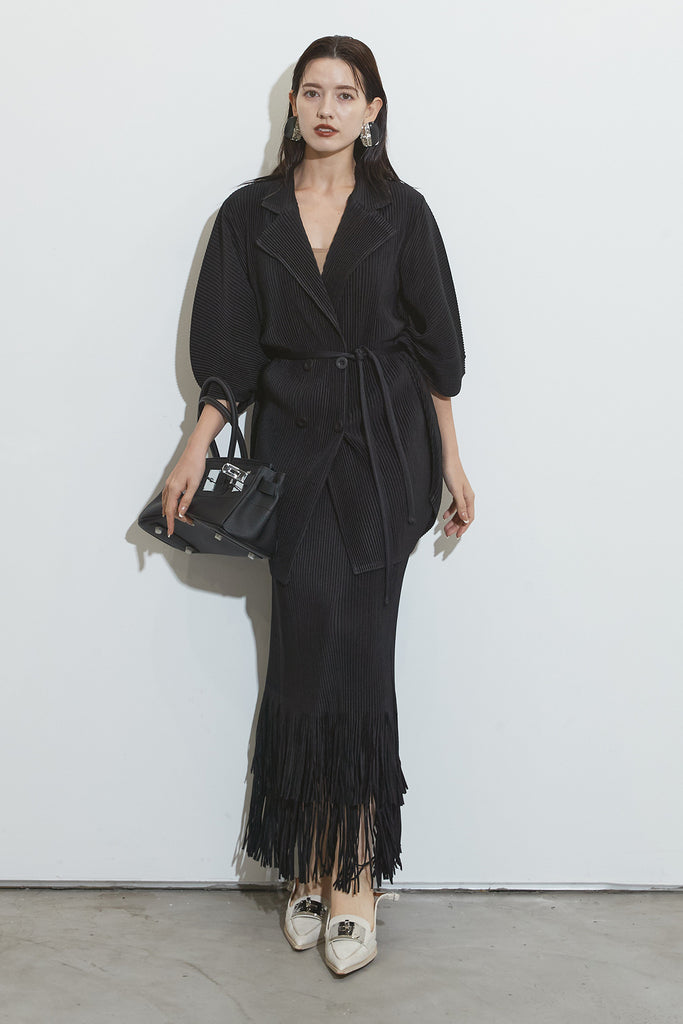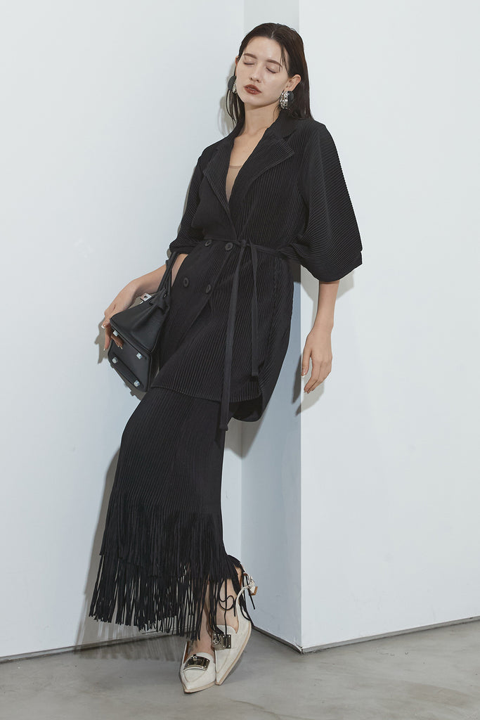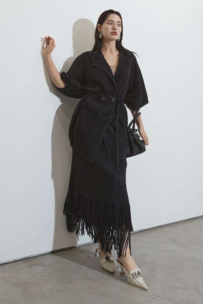 立体感のある細かいプリーツが全体をすっきりと見せ、動くたびに揺れるスカート裾のフリンジがモードなアクセントに。ジャケットは前開きのラップ風デザインで、共布ベルトでウエストマークも可能。セットではもちろん、単品使いでもスタイリングの幅が広がる一着です。