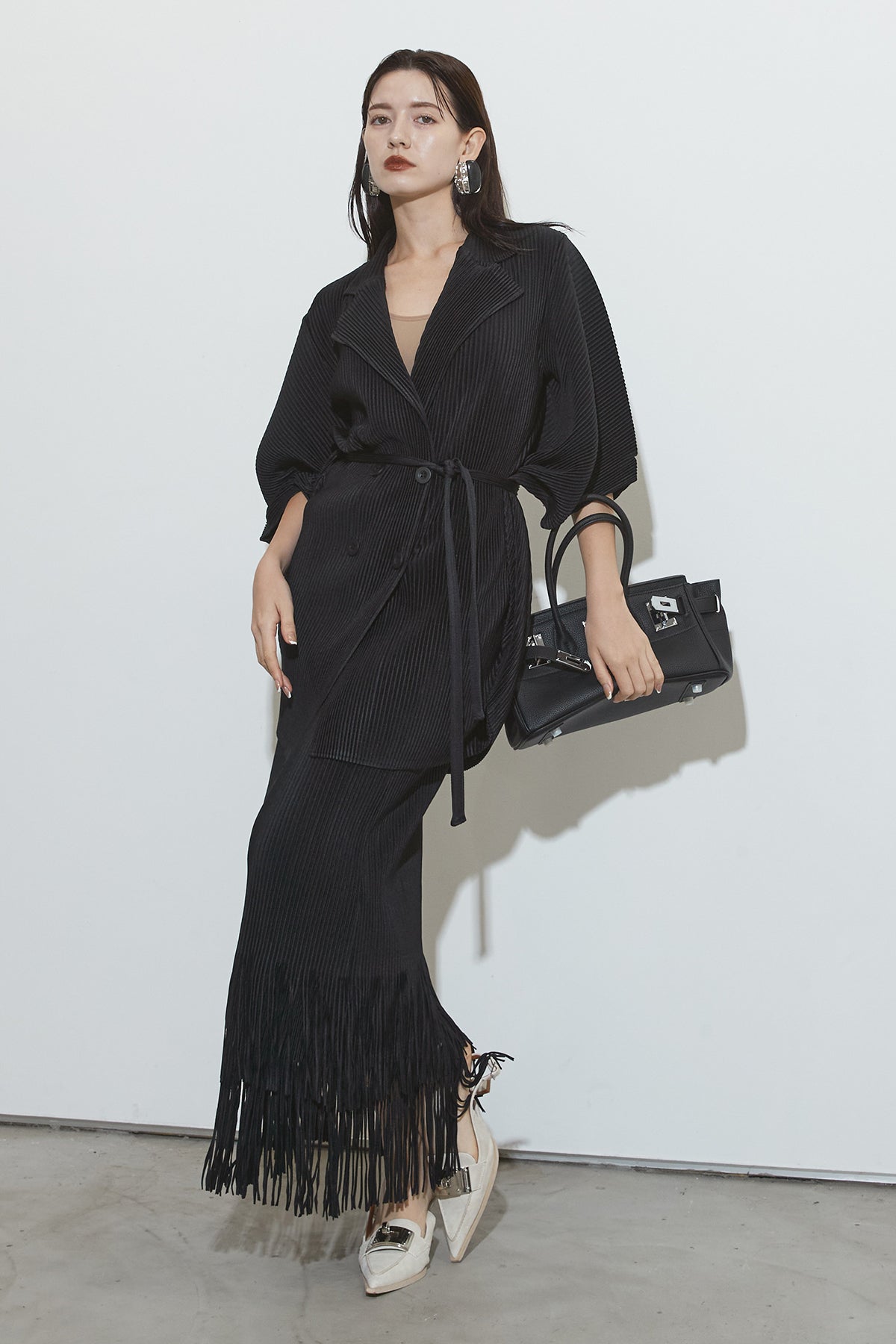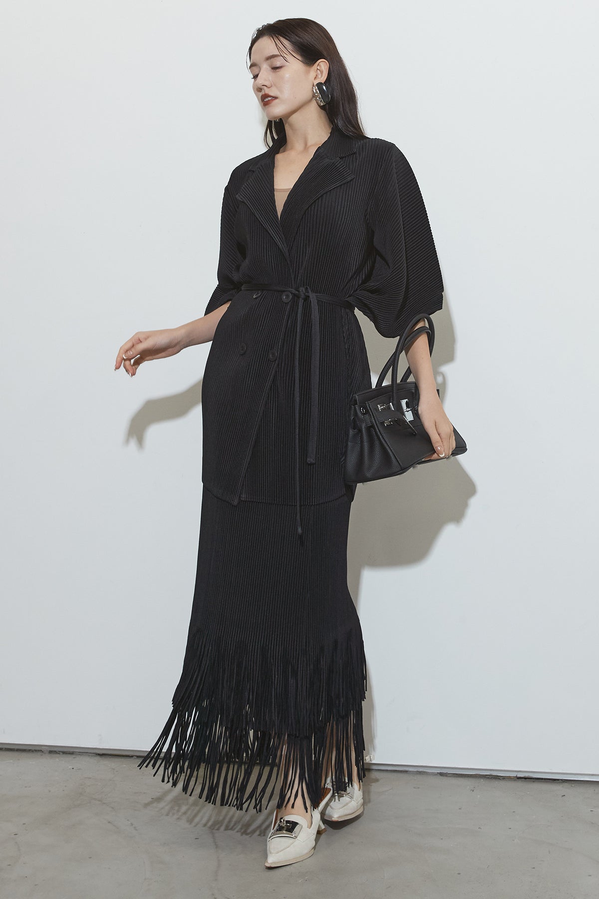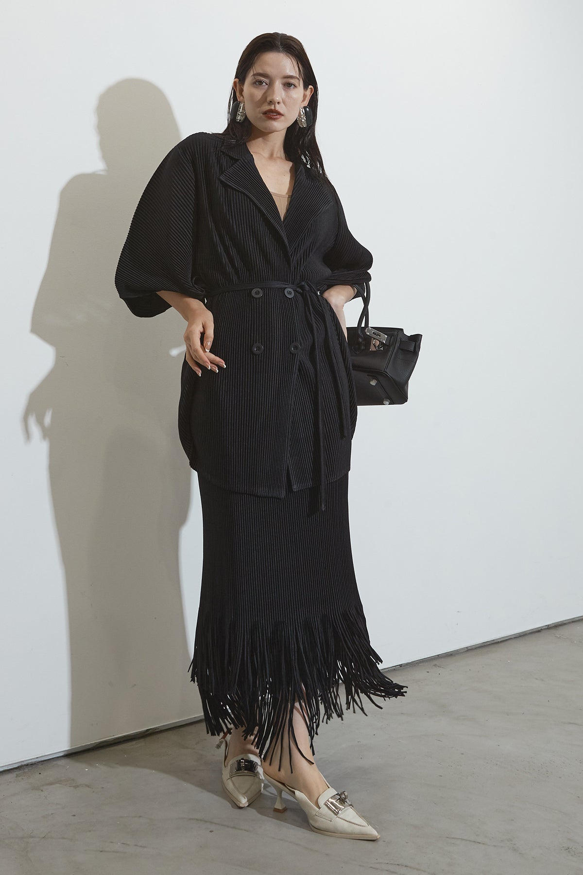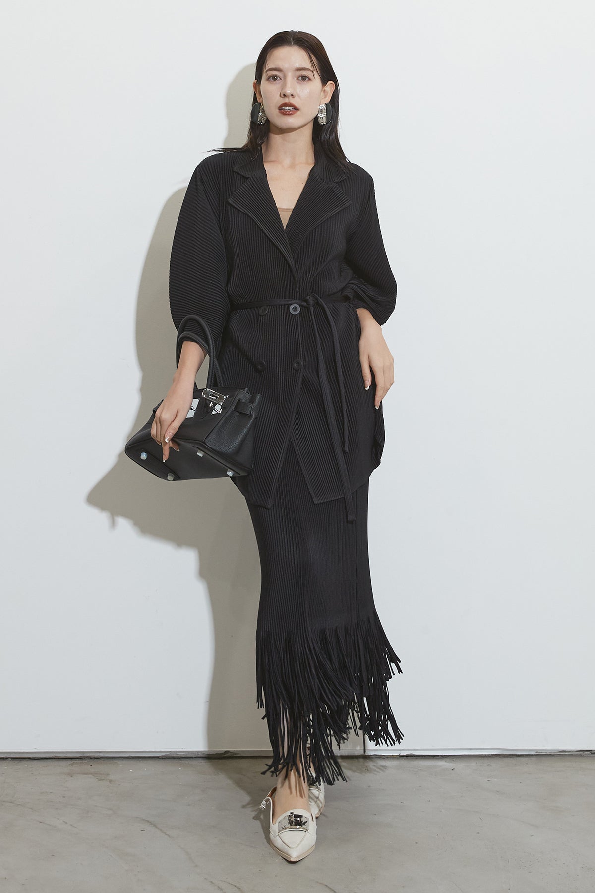 立体感のある細かいプリーツが全体をすっきりと見せ、動くたびに揺れるスカート裾のフリンジがモードなアクセントに。ジャケットは前開きのラップ風デザインで、共布ベルトでウエストマークも可能。セットではもちろん、単品使いでもスタイリングの幅が広がる一着です。