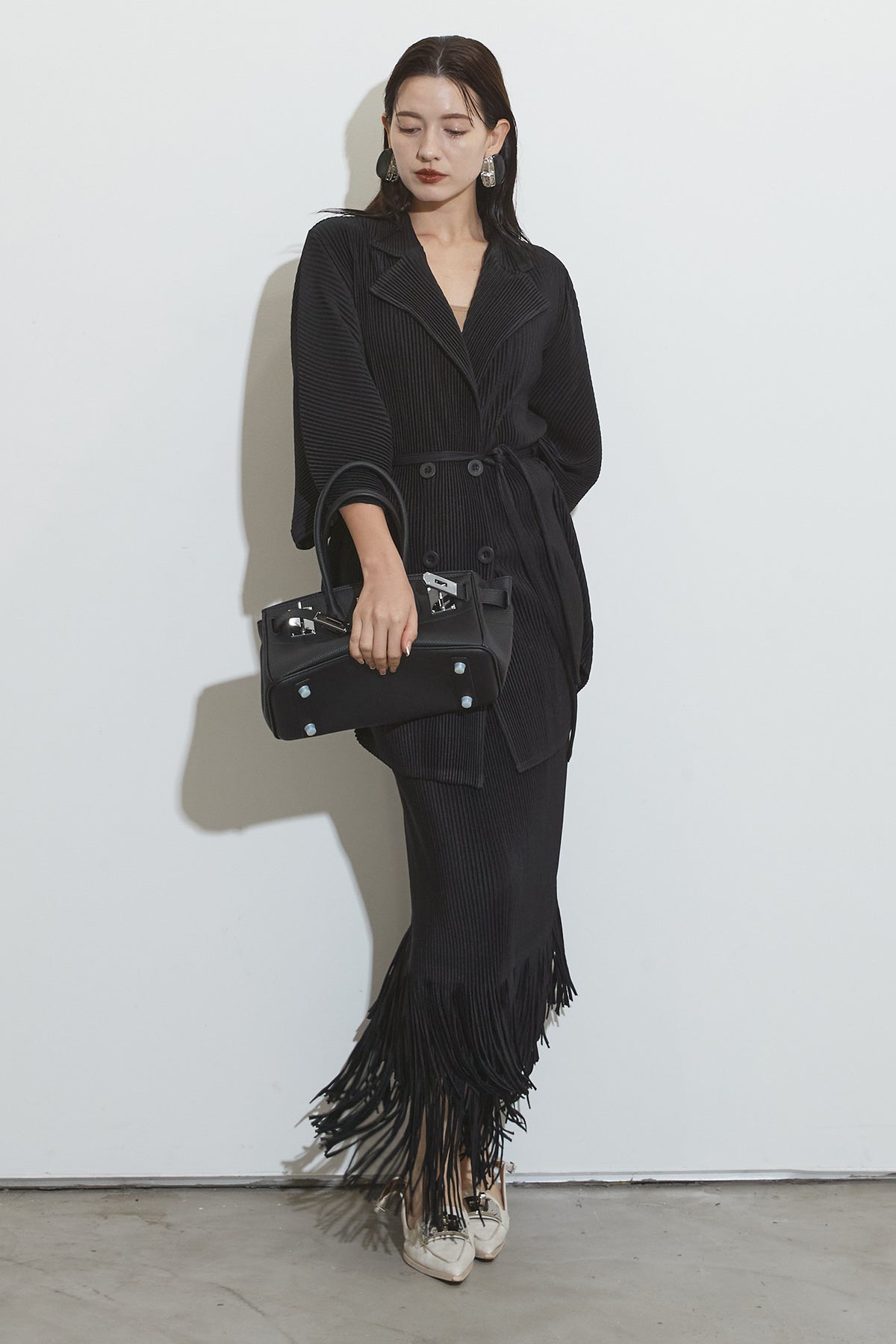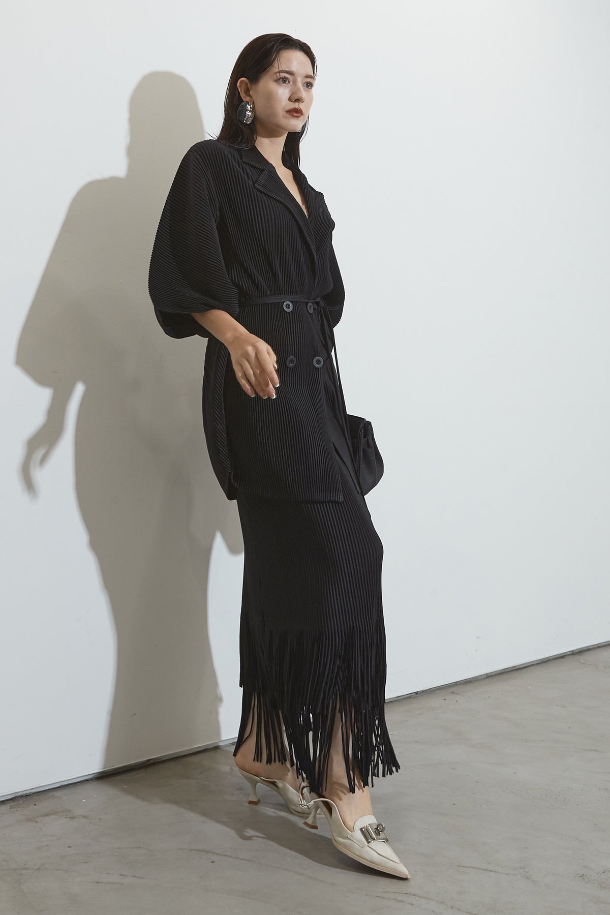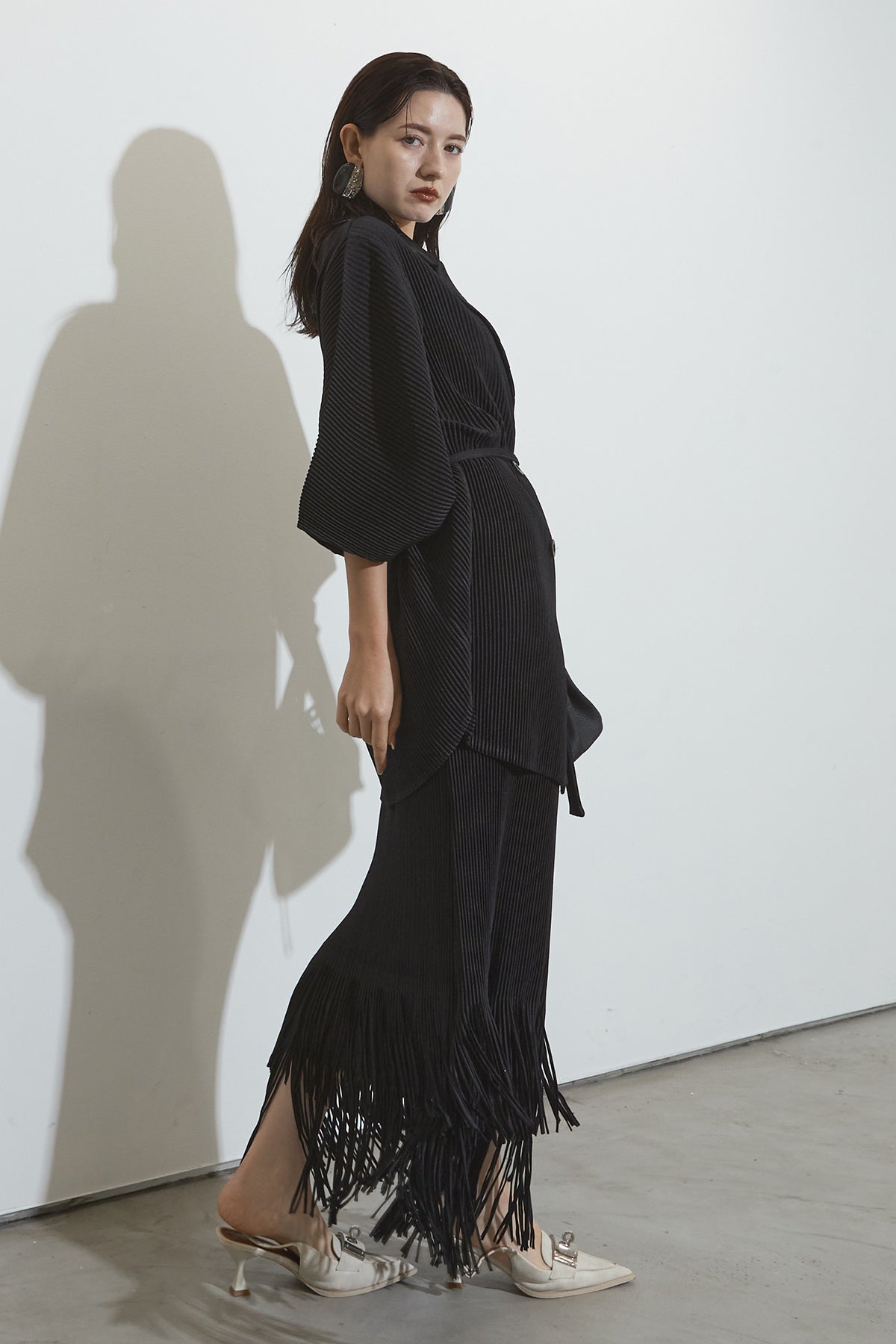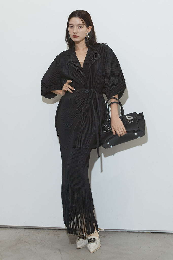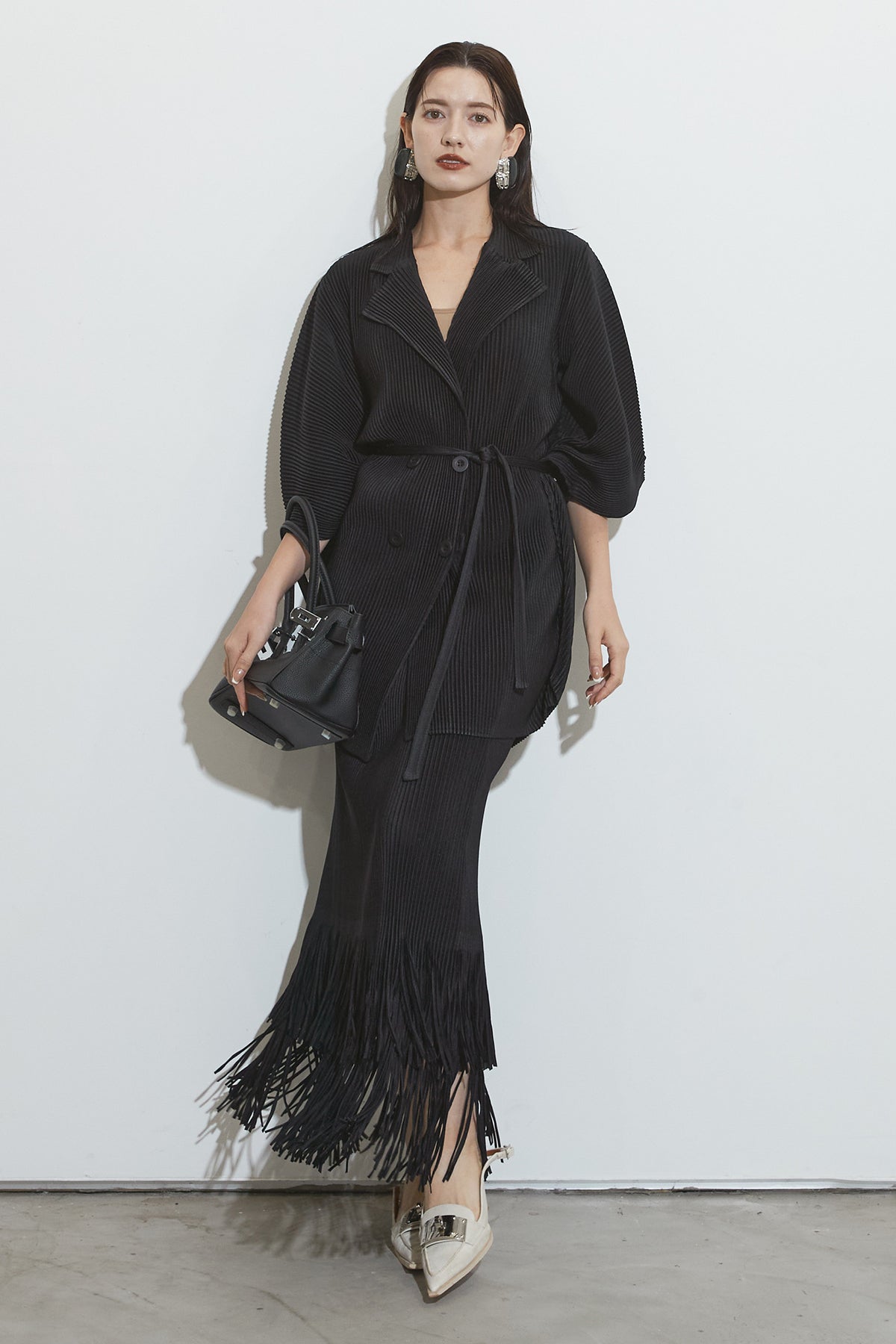 立体感のある細かいプリーツが全体をすっきりと見せ、動くたびに揺れるスカート裾のフリンジがモードなアクセントに。ジャケットは前開きのラップ風デザインで、共布ベルトでウエストマークも可能。セットではもちろん、単品使いでもスタイリングの幅が広がる一着です。