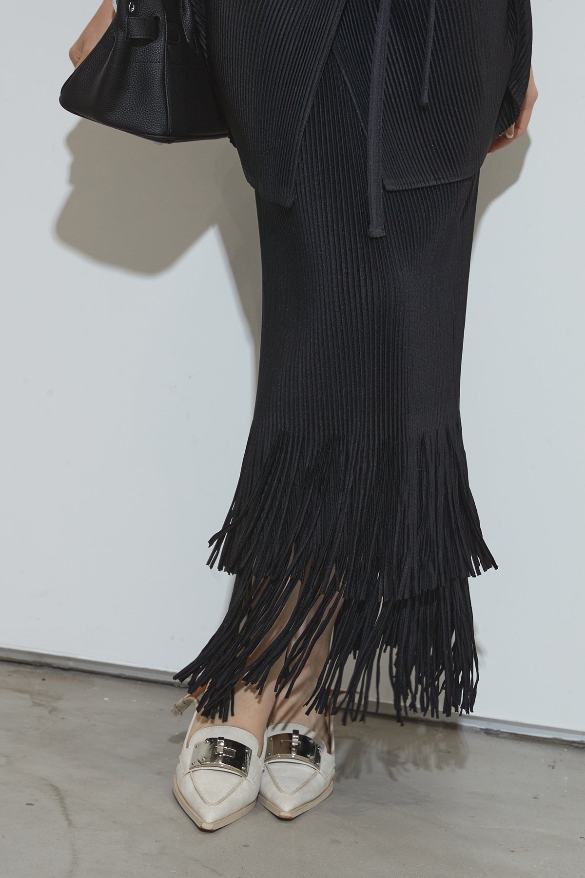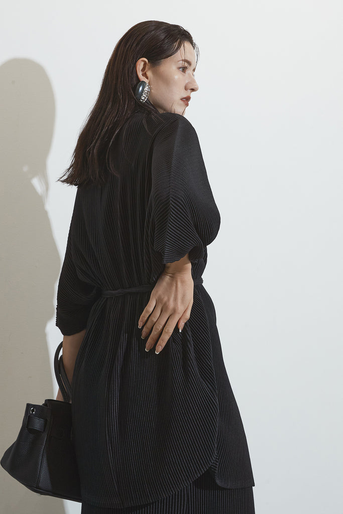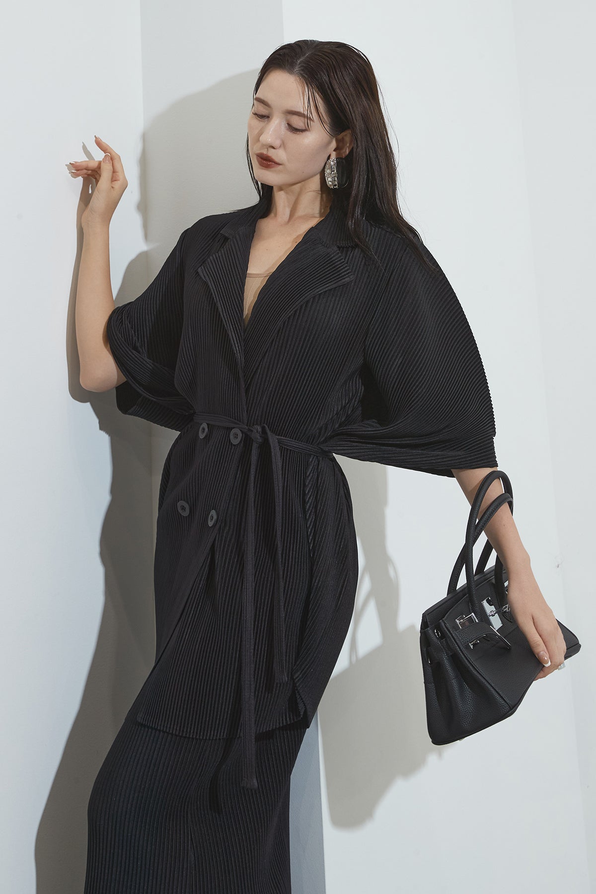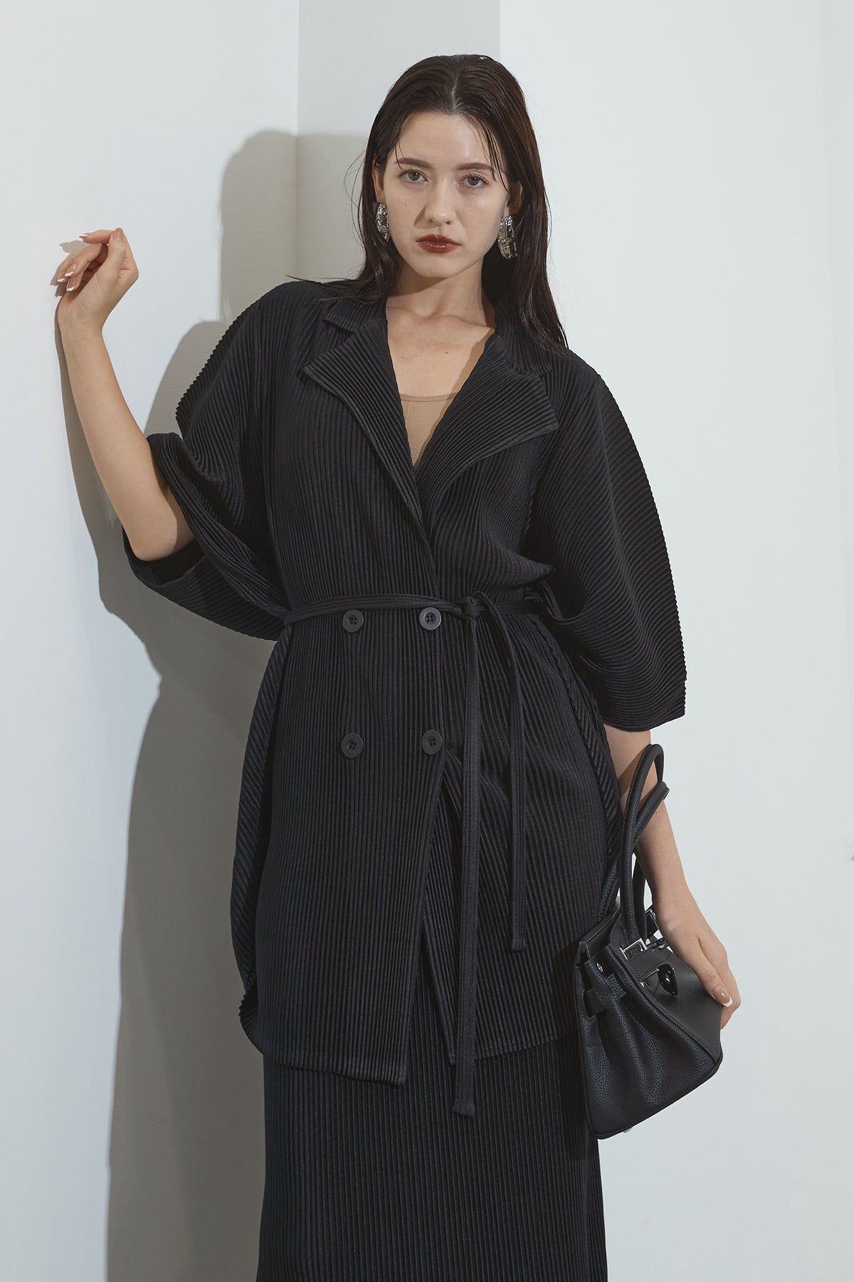 立体感のある細かいプリーツが全体をすっきりと見せ、動くたびに揺れるスカート裾のフリンジがモードなアクセントに。ジャケットは前開きのラップ風デザインで、共布ベルトでウエストマークも可能。セットではもちろん、単品使いでもスタイリングの幅が広がる一着です。