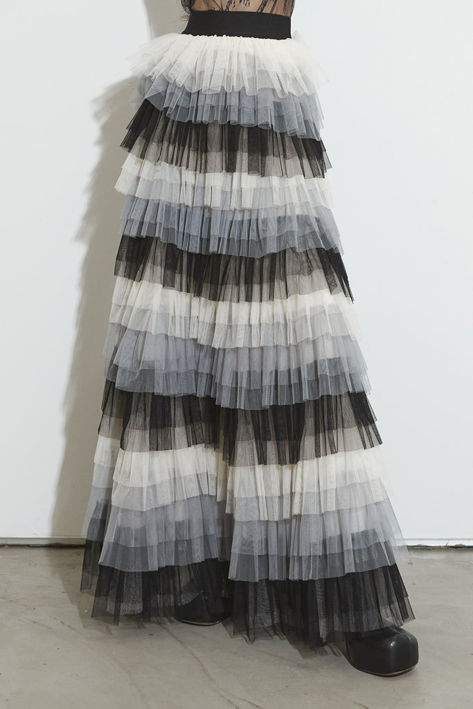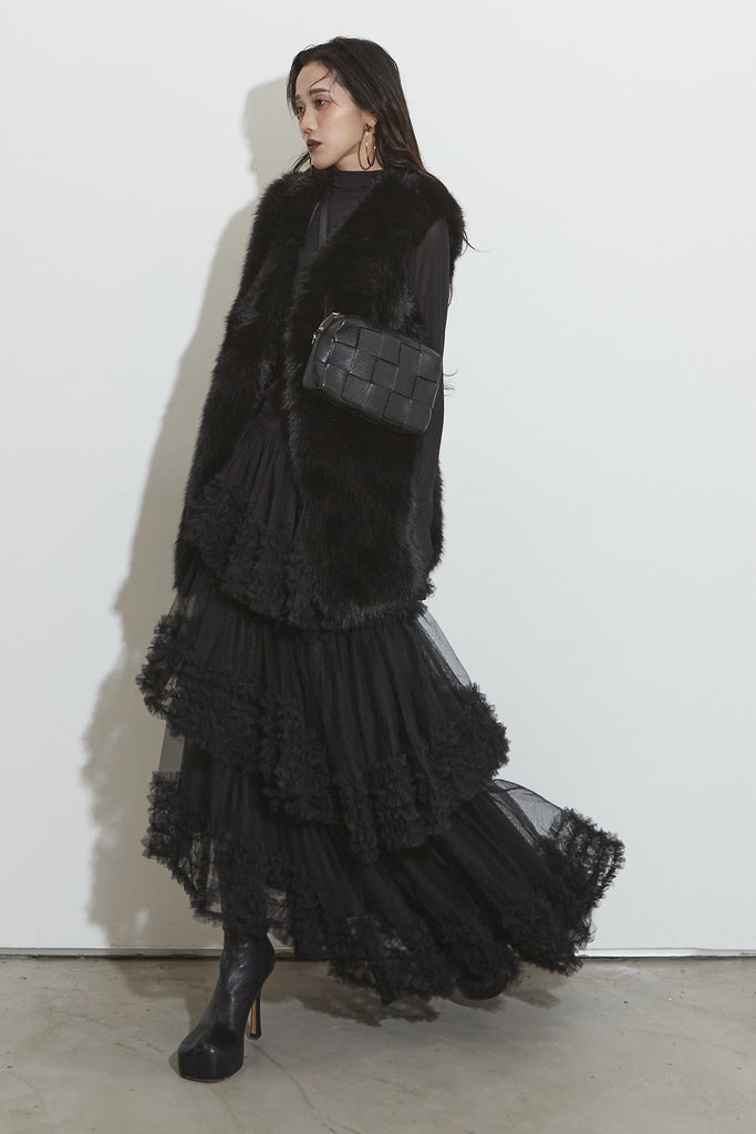 【SET】シアーコントラストトップス+シャギーフェイクファーベスト+チュールラインティアードスカート
