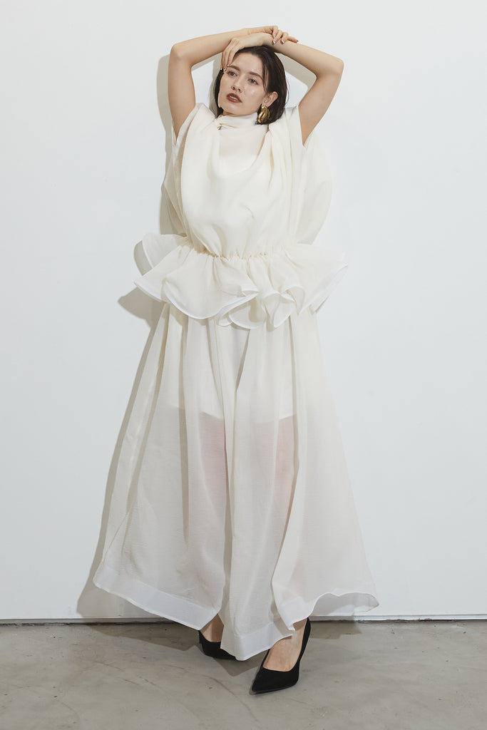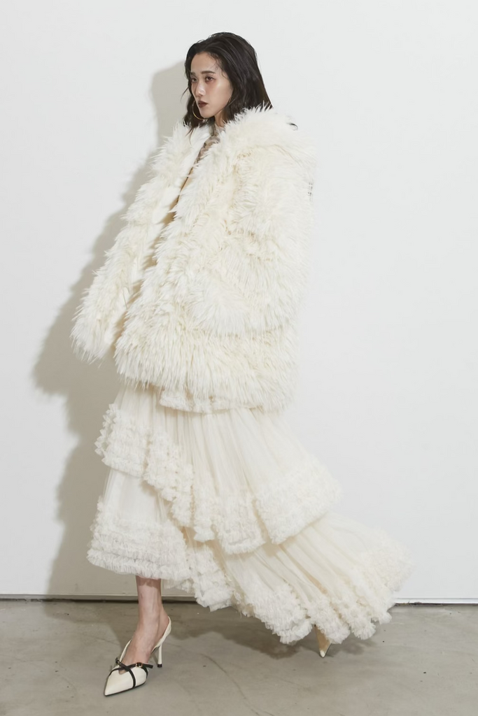 【SET】レースシアートップス+シャギーファーフードジャケット+チュールラインティアードスカート