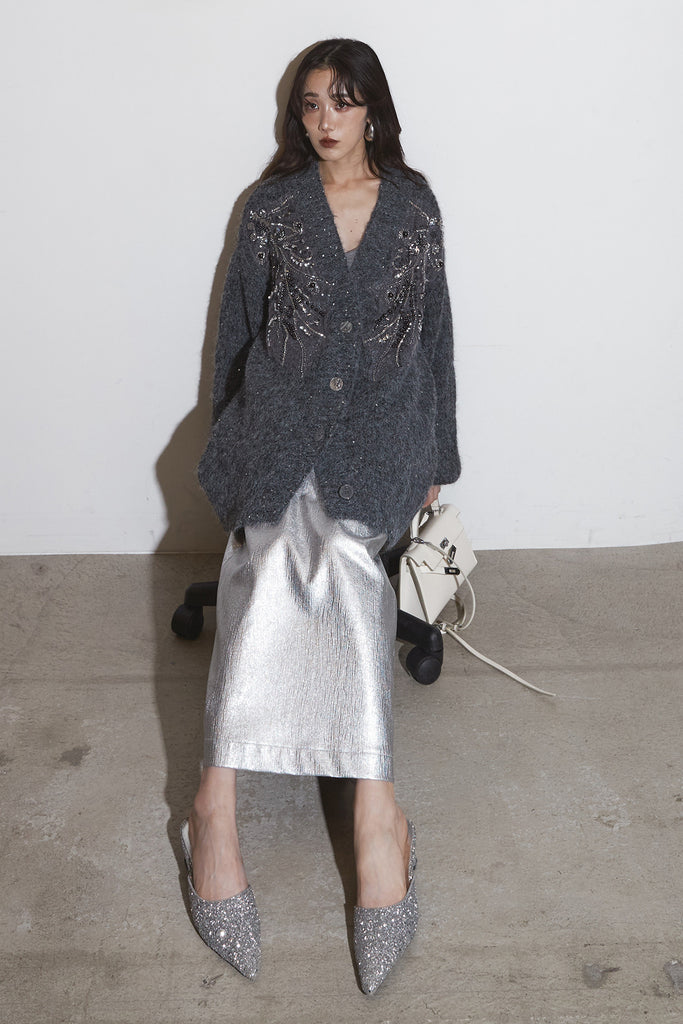 【SET】ビジューエンブロイダリーカーデ+レザーIラインスカート