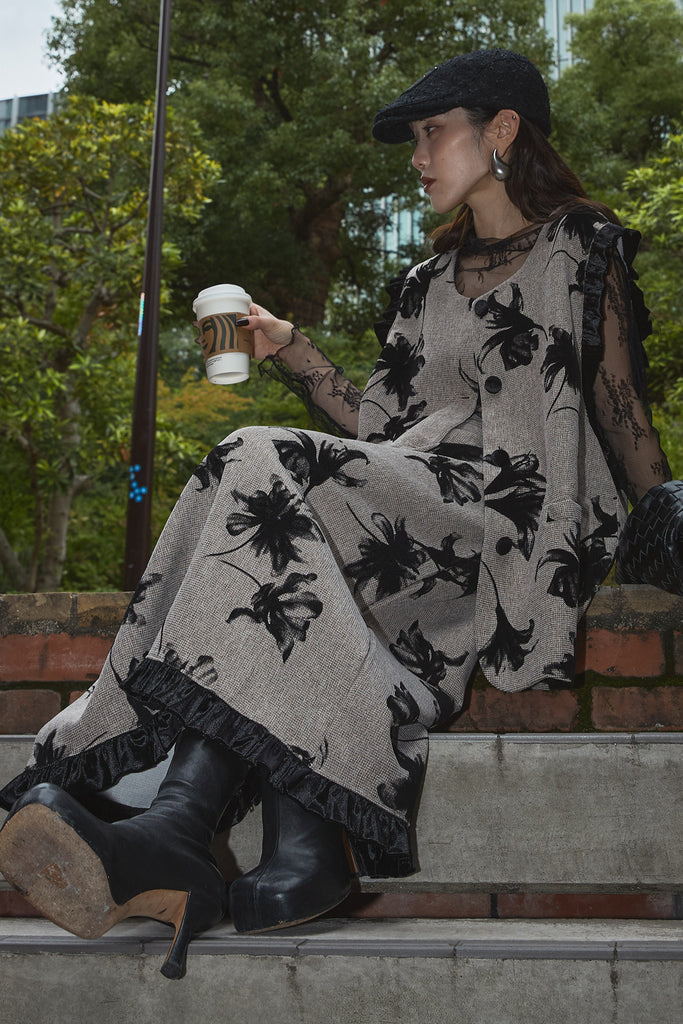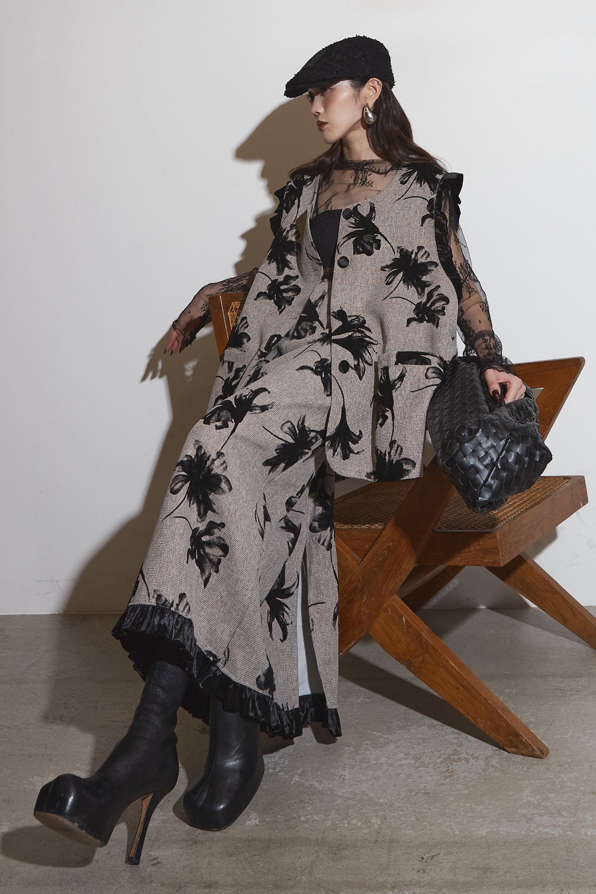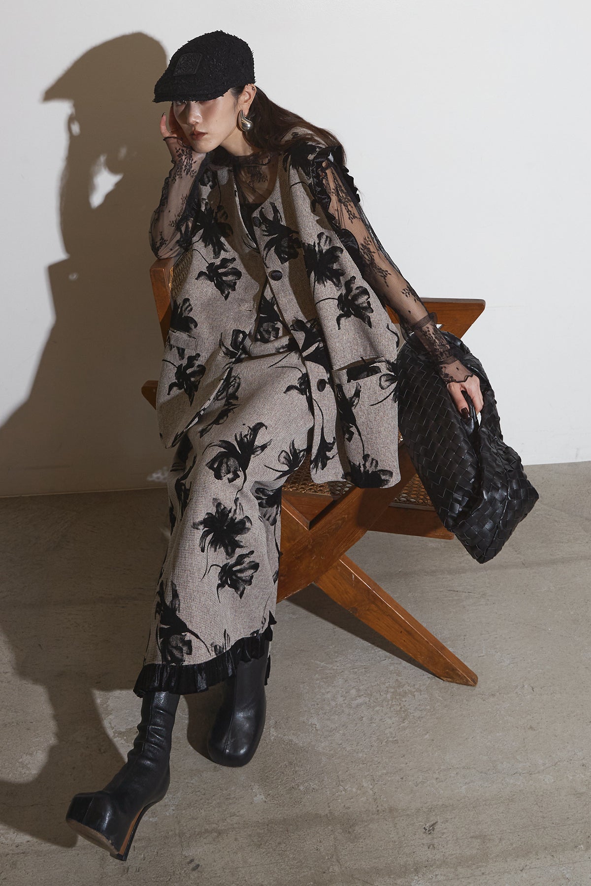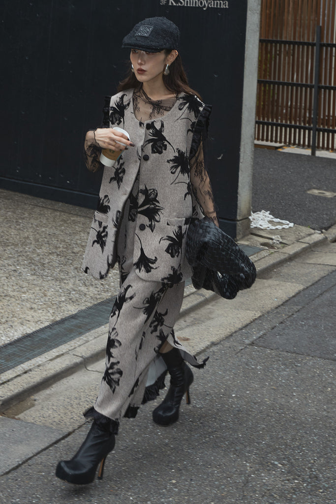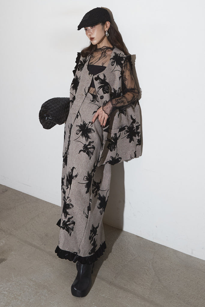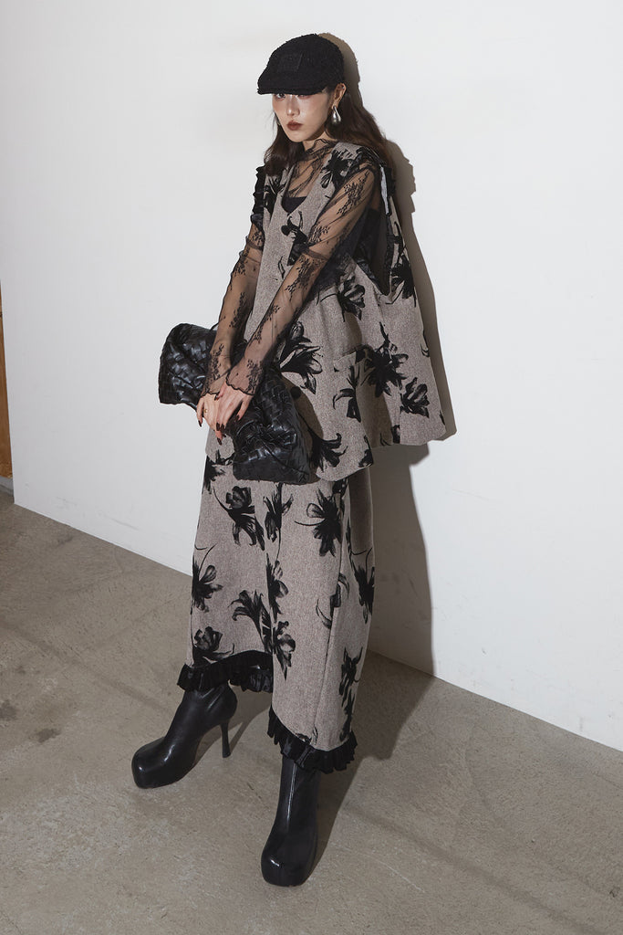 大胆なフラワーパターンが目を惹くセットアップ。 落ち着いた色味ながらも、立体的な柄がスタイリングに華やかさをプラスします。 ゆったりとしたシルエットでリラックス感がありながらも、上品な雰囲気を演出。 セットではもちろん、単品でも着回しやすい万能アイテムです。