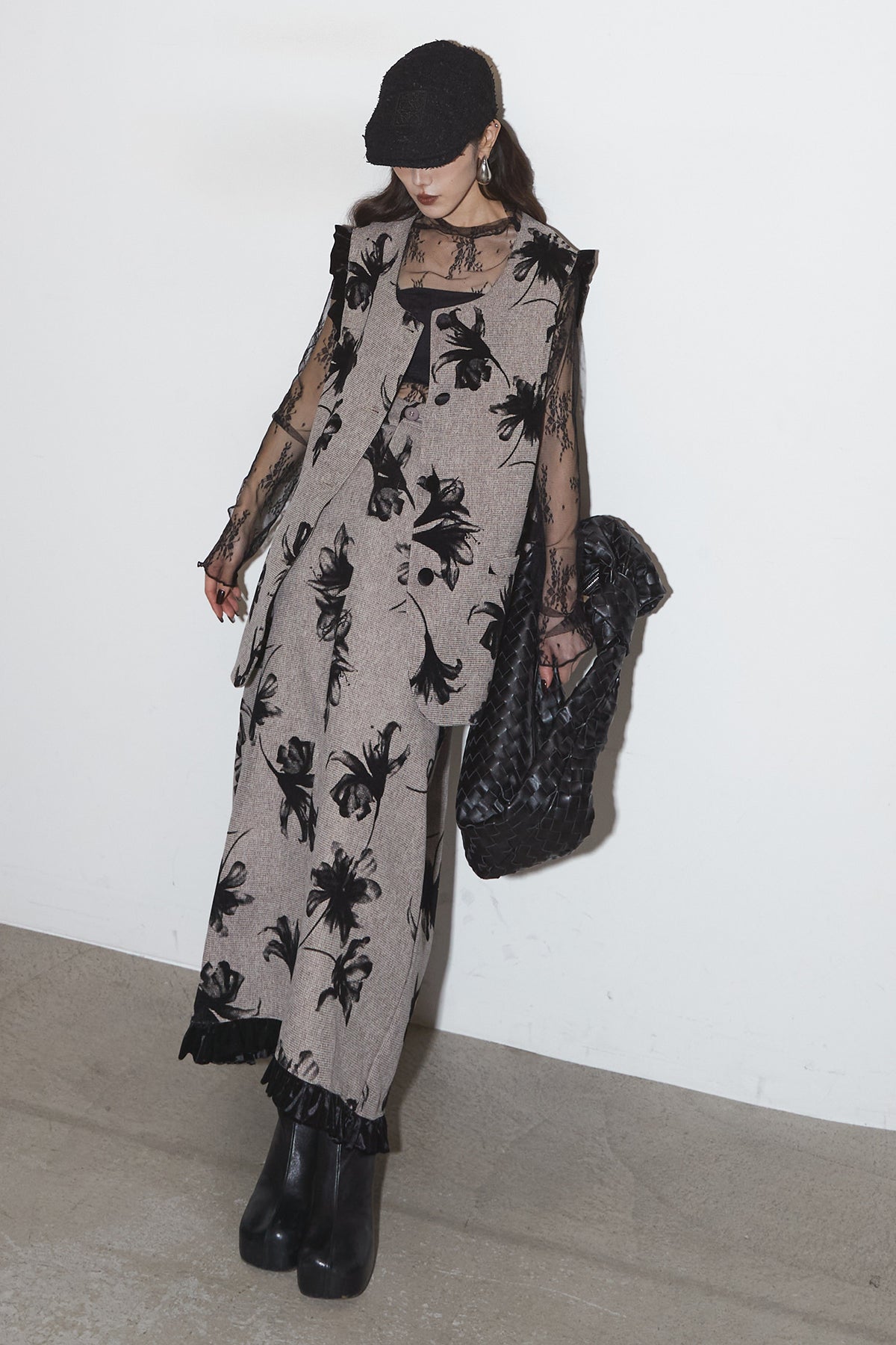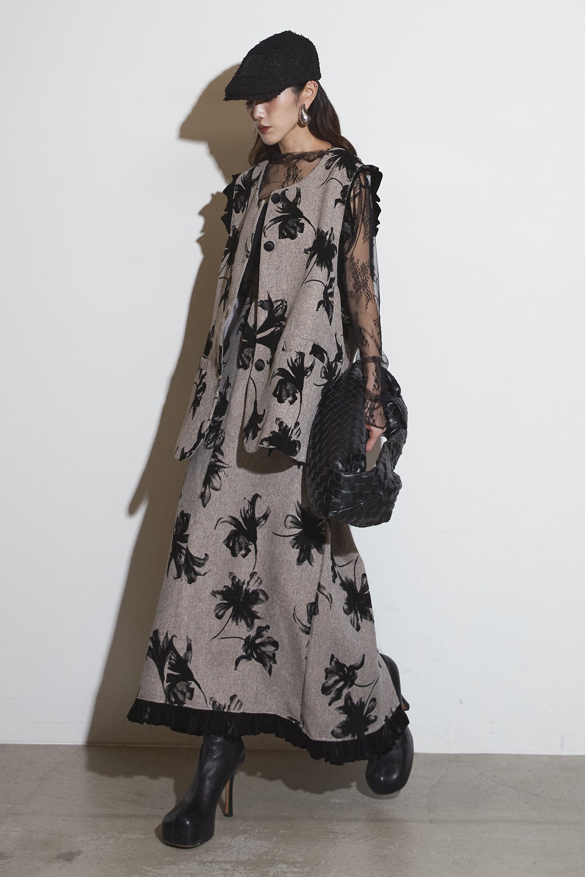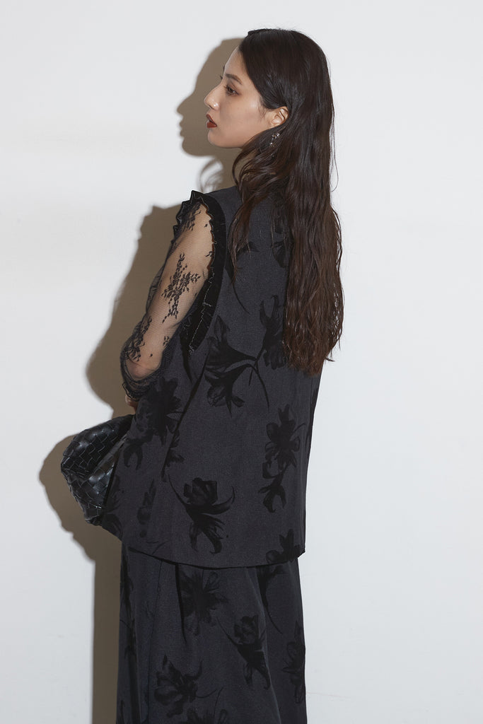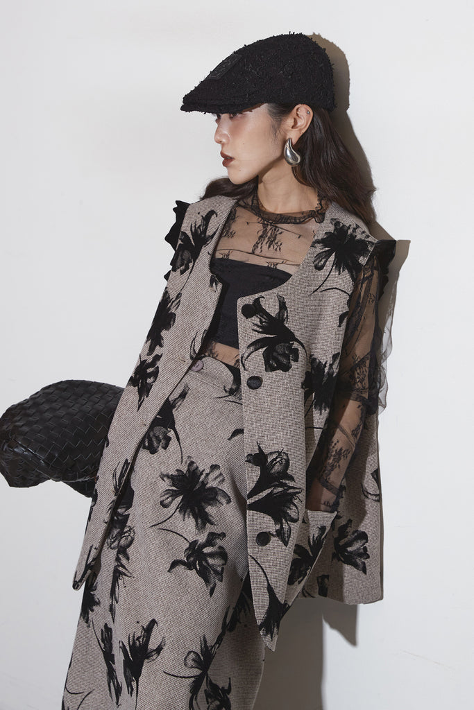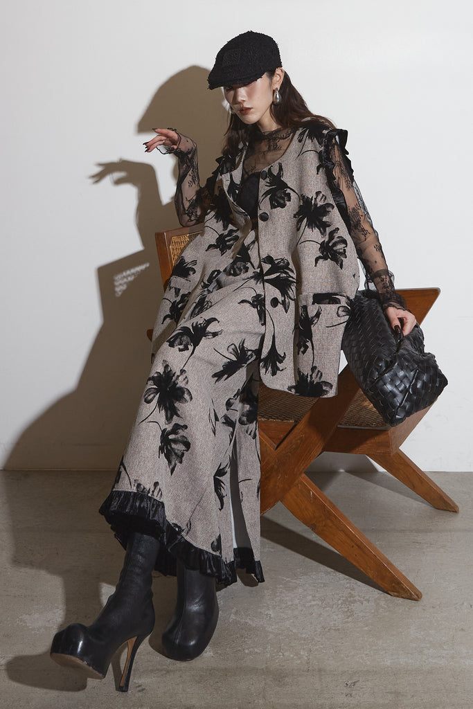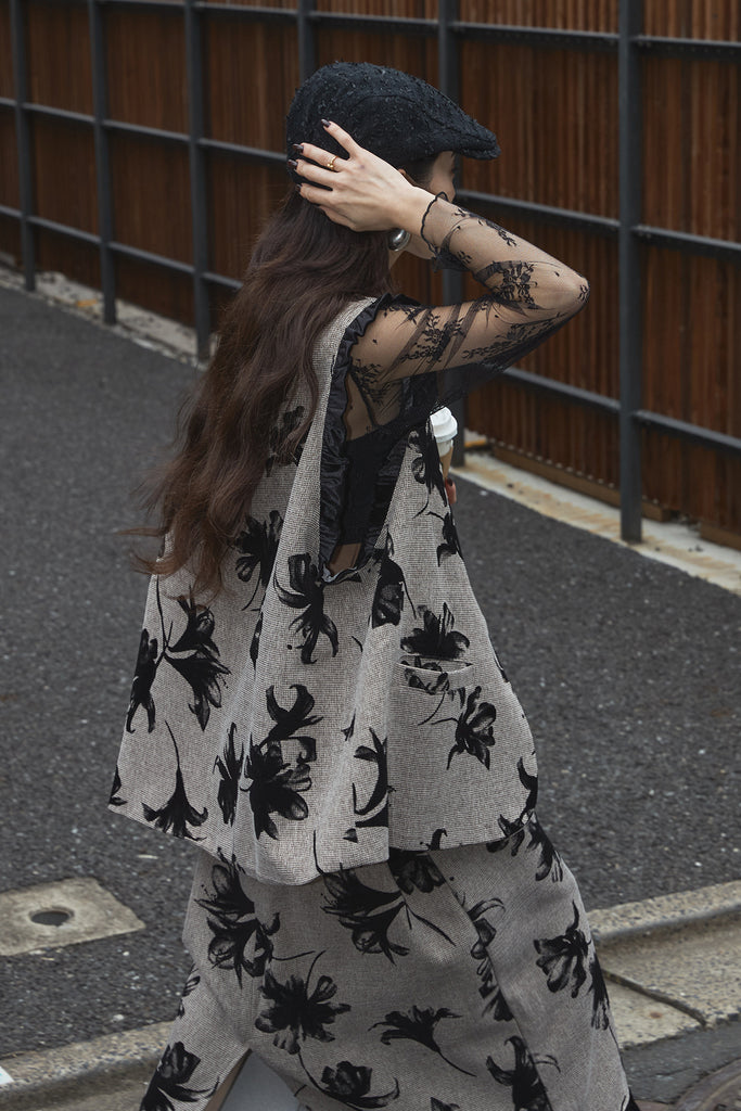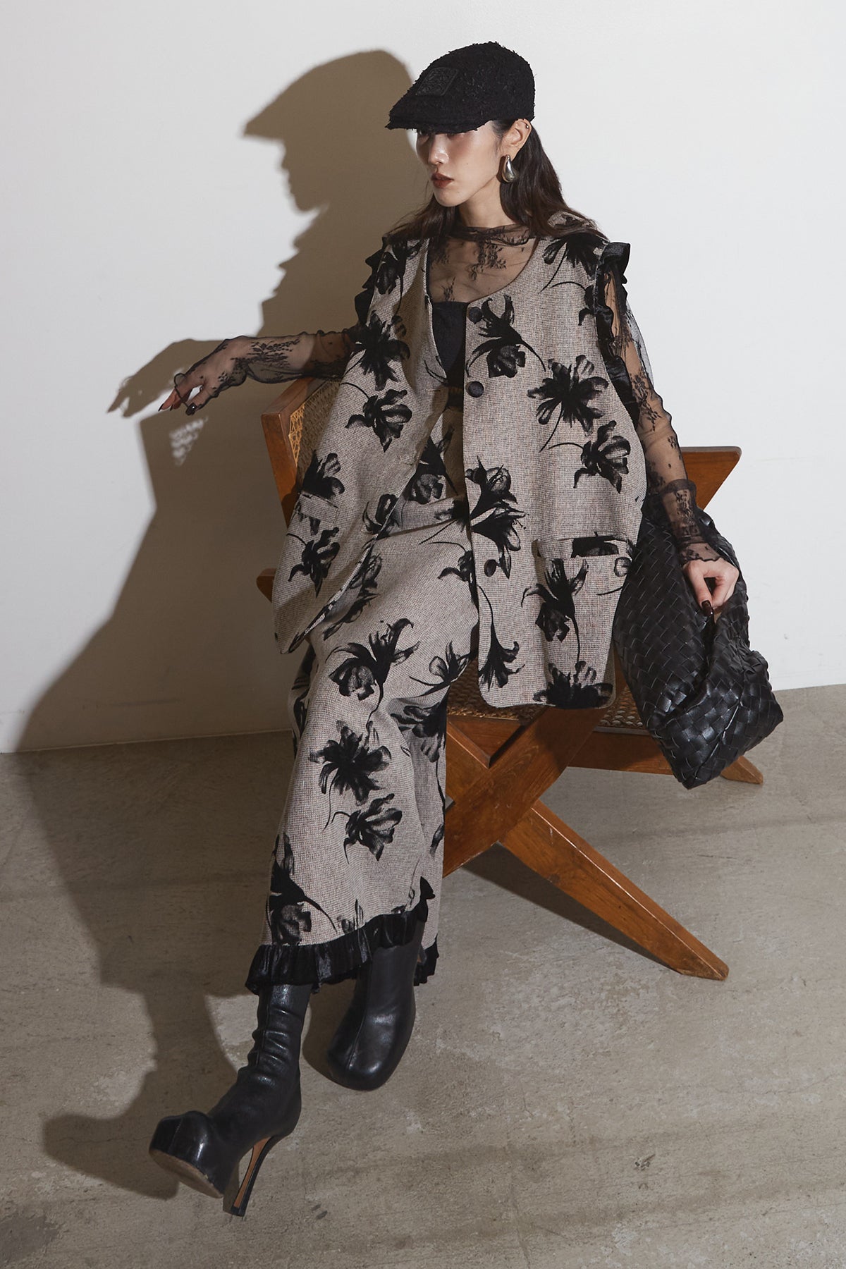 大胆なフラワーパターンが目を惹くセットアップ。 落ち着いた色味ながらも、立体的な柄がスタイリングに華やかさをプラスします。 ゆったりとしたシルエットでリラックス感がありながらも、上品な雰囲気を演出。 セットではもちろん、単品でも着回しやすい万能アイテムです。