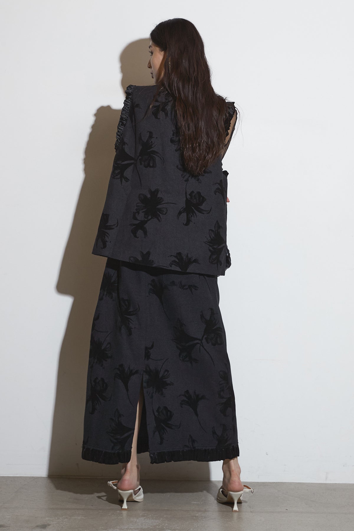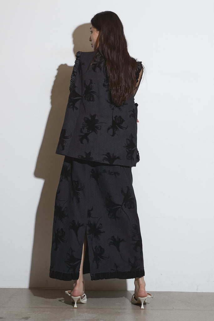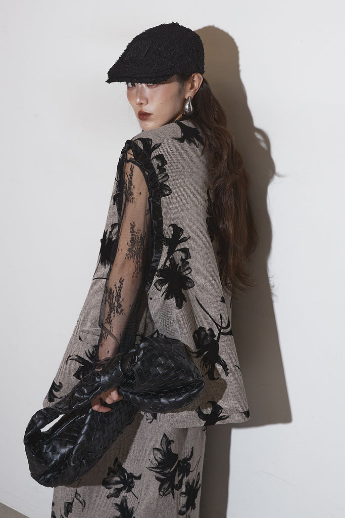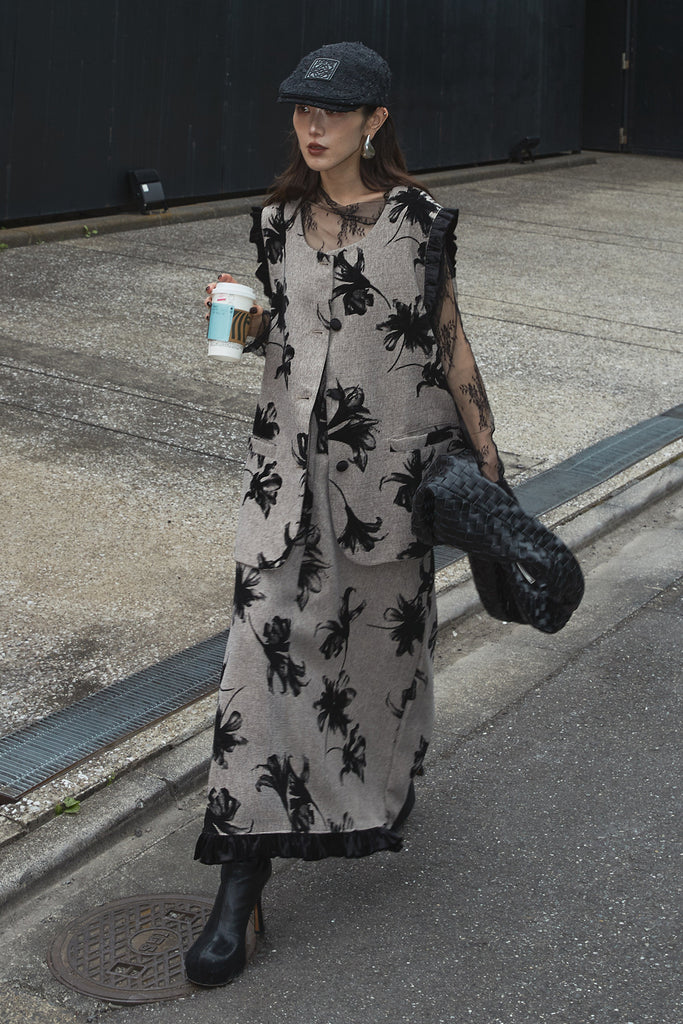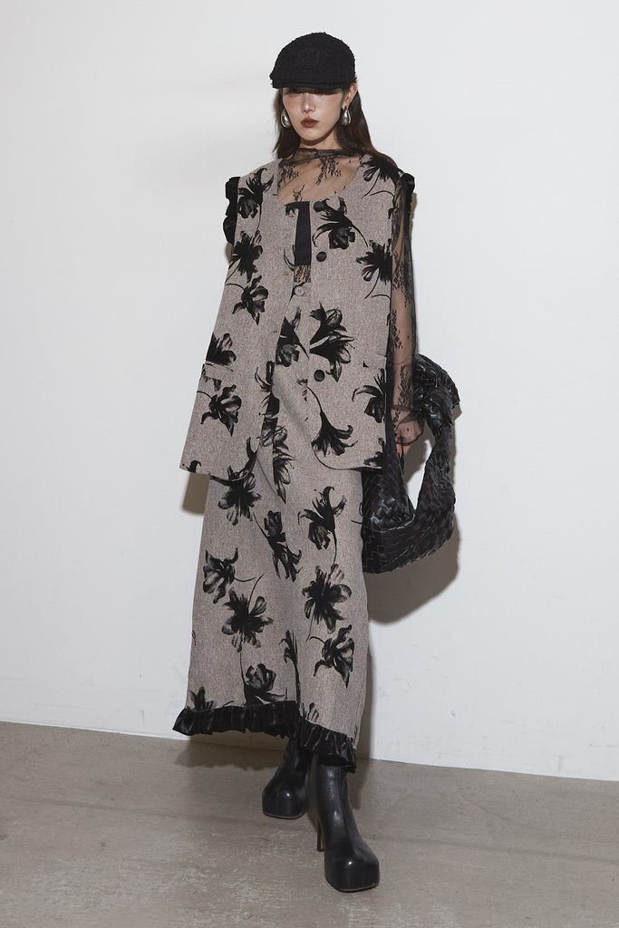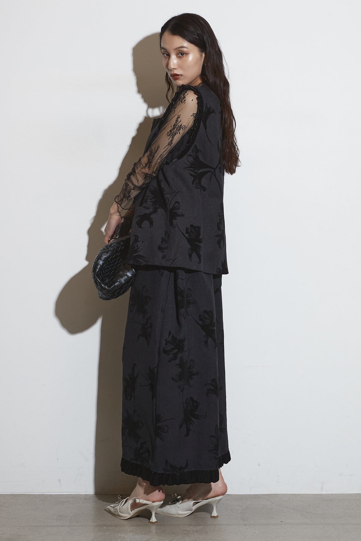 大胆なフラワーパターンが目を惹くセットアップ。 落ち着いた色味ながらも、立体的な柄がスタイリングに華やかさをプラスします。 ゆったりとしたシルエットでリラックス感がありながらも、上品な雰囲気を演出。 セットではもちろん、単品でも着回しやすい万能アイテムです。